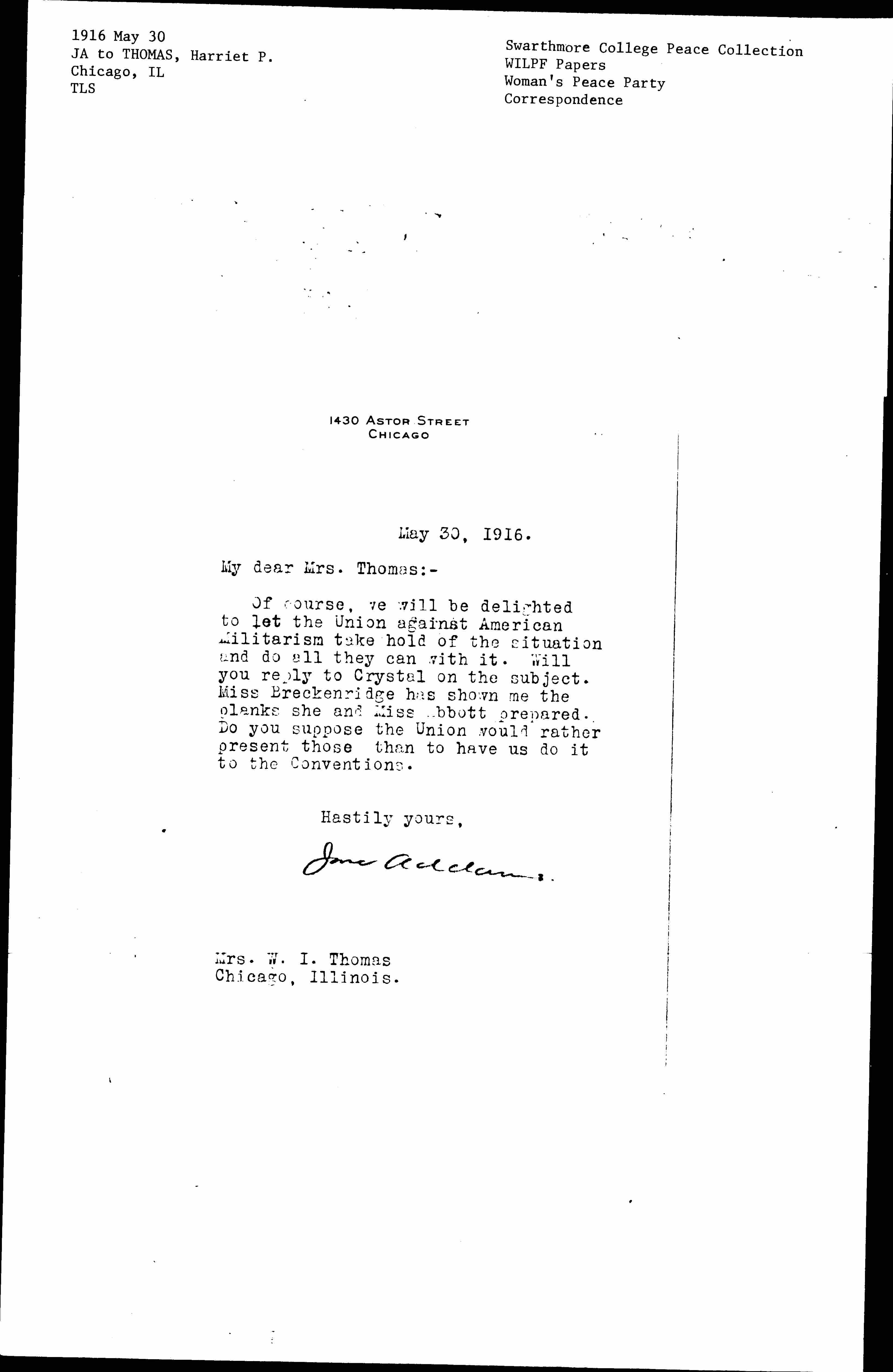 Of course, we will be delighted to let the Union against American Militarism take hold of the situation and do all they can with it. Will you reply to Crystal on the subject. Miss [Breckinridge] has shown me the planks she and Miss Abbott prepared. Do you suppose the Union would rather present those than to have us do it to the Conventions.