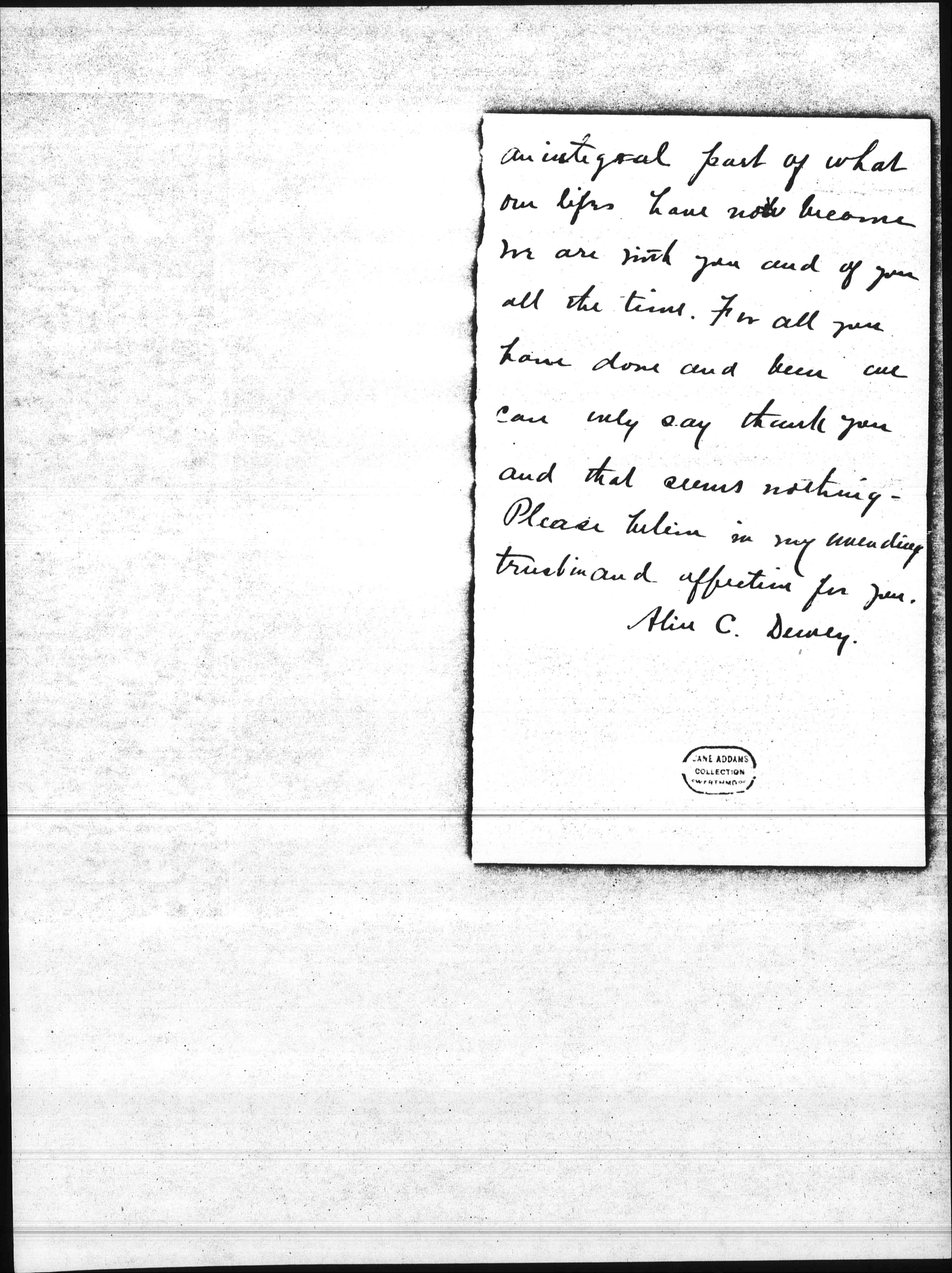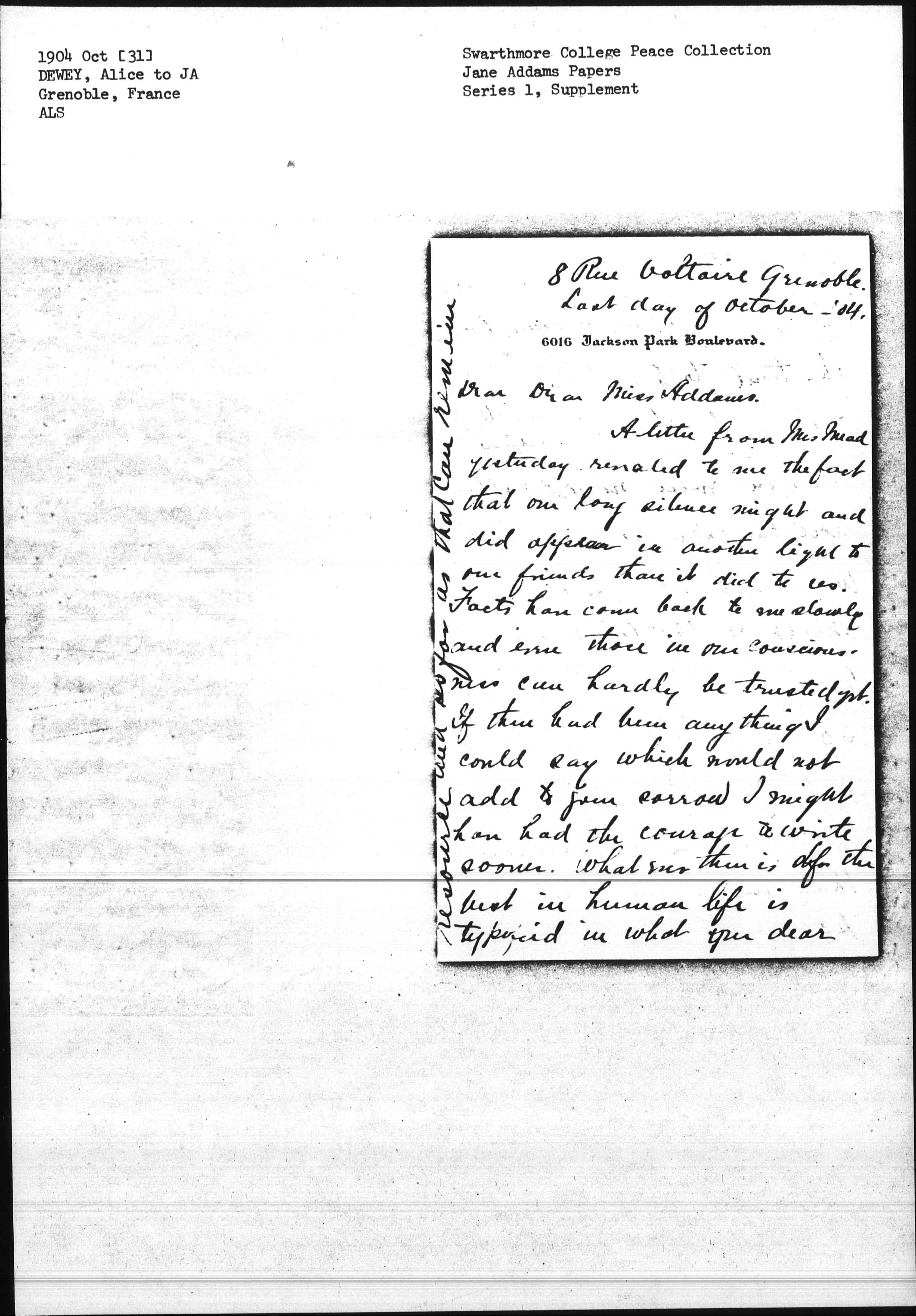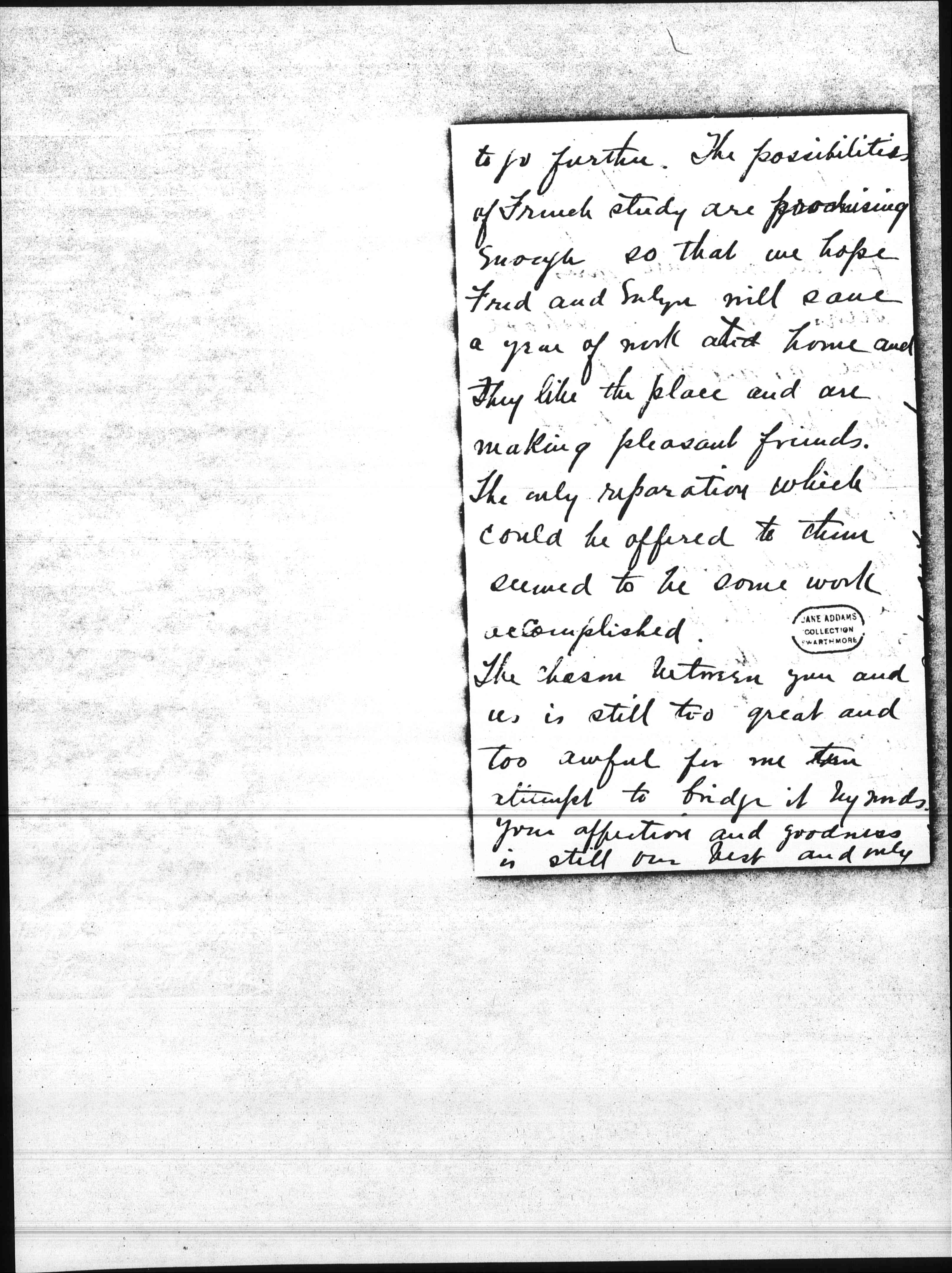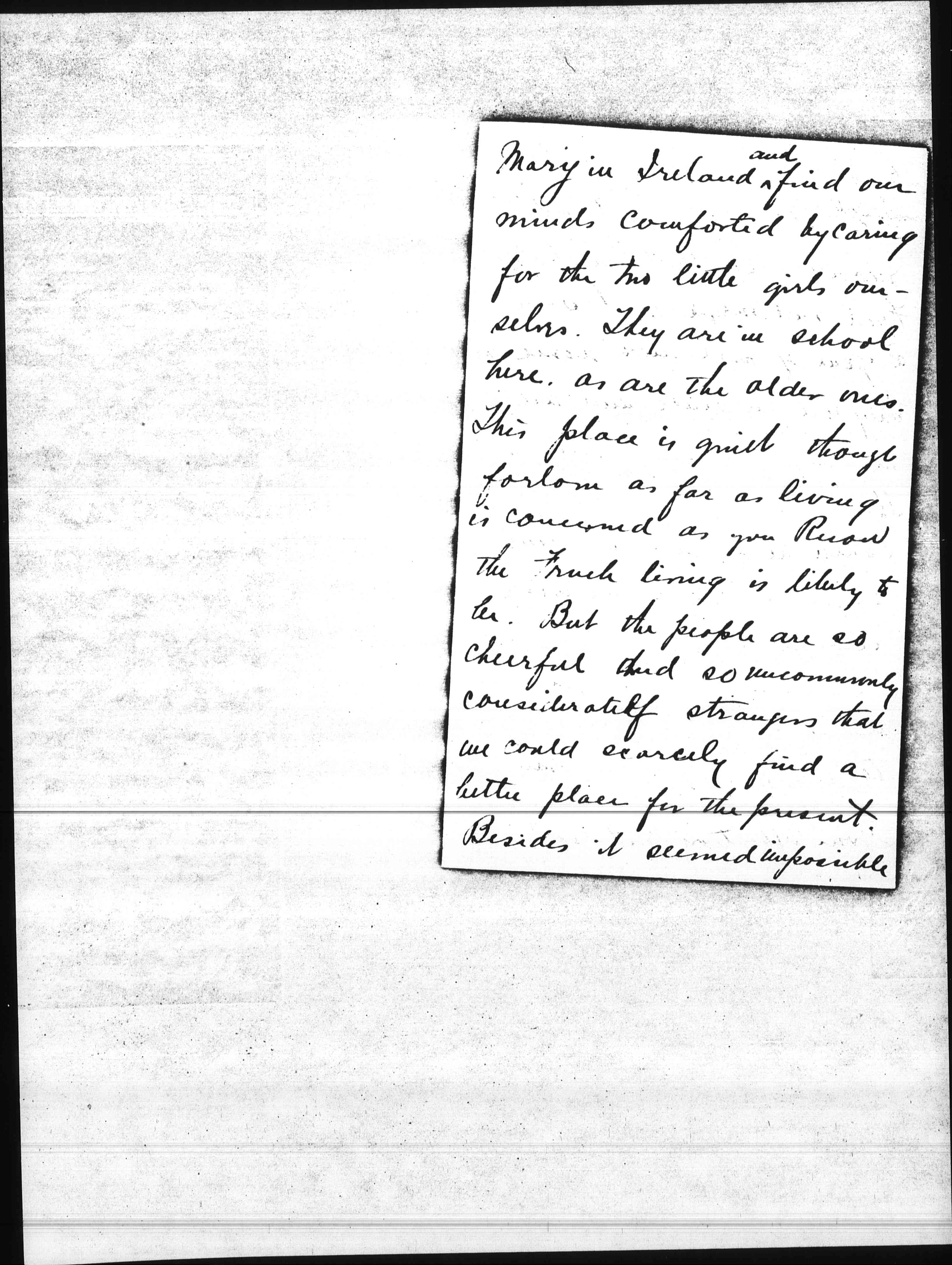 A letter from Mrs Mead yesterday revealed to me the fact that our long silence might and did appear in another light to our friends than it did to us. Facts have come back to me slowly and even those in our consciousness can hardly be trusted yet. If there had been anything I could say which would not add to your sorrow I might have had the courage to write sooner. Whatever then is [Life?] the best in human life is typified in what you dear [page 2] friends have said and done of Gordon. It seems for the time to have less of me in it than perhaps was in your minds. These are the only reasons why we have not written. Most of the time since we left Ireland has been so full of the incidents of hurried travelling and the care of children that we have had no power to do more. We left [page 3] Mary in Ireland ↑and↓ find our minds comforted by caring for the two little girls ourselves. They are in school here, as are the older ones. This place is quiet though forlorn as far as living is concerned as you know the French living is likely to be. But the people are so cheerful and so uncommonly considerate of strangers that we could scarcely find a better place for the present. Besides it seemed impossible [page 4] to go further. The possibilities of French study are promising [producing] enough so that we hope Fred and Evelyn will save a year of work and ↑at↓ home and they like the place and are making pleasant friends. The only reparation which could be offered to them seemed to be some work accomplished.