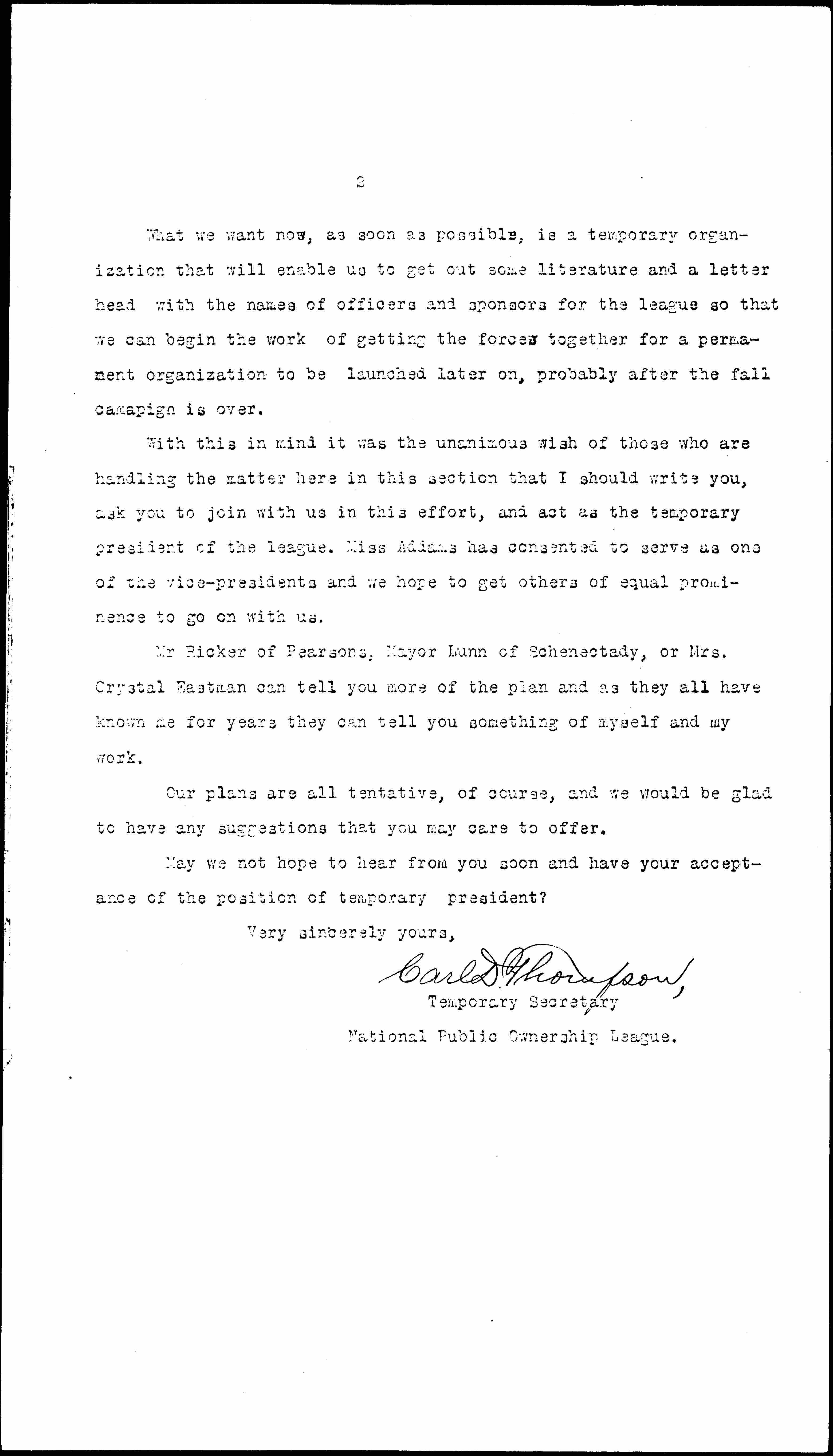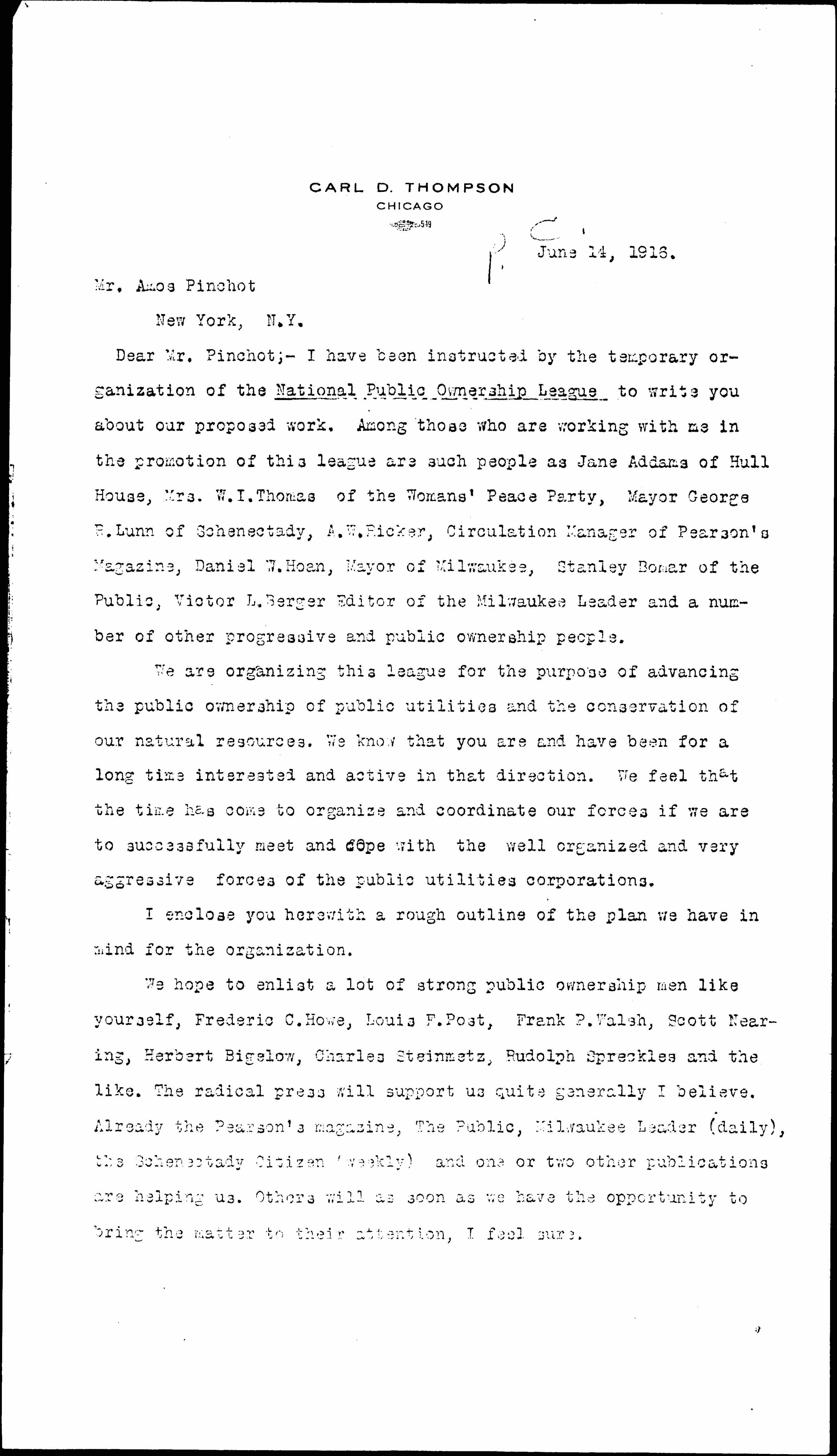 Dear Mr. Pinchot; -- I have been instructed by the temporary organization of the National Public Ownership League to write you about our proposed work. Among those who are working with me in the promotion of this league are such people as Jane Addams of Hull House, Mrs. W. I. Thomas of the Woman's Peace Party, Mayor George R. Lunn of Schenectady, A. W. Ricker, Circulation Manager of Pearson's Magazine, Daniel W. Hoan, Mayor of Milwaukee, Stanley Bomar of the Public, Victor L. Berger Editor of the Milwaukee Leader and a number of other progressive and public ownership people.