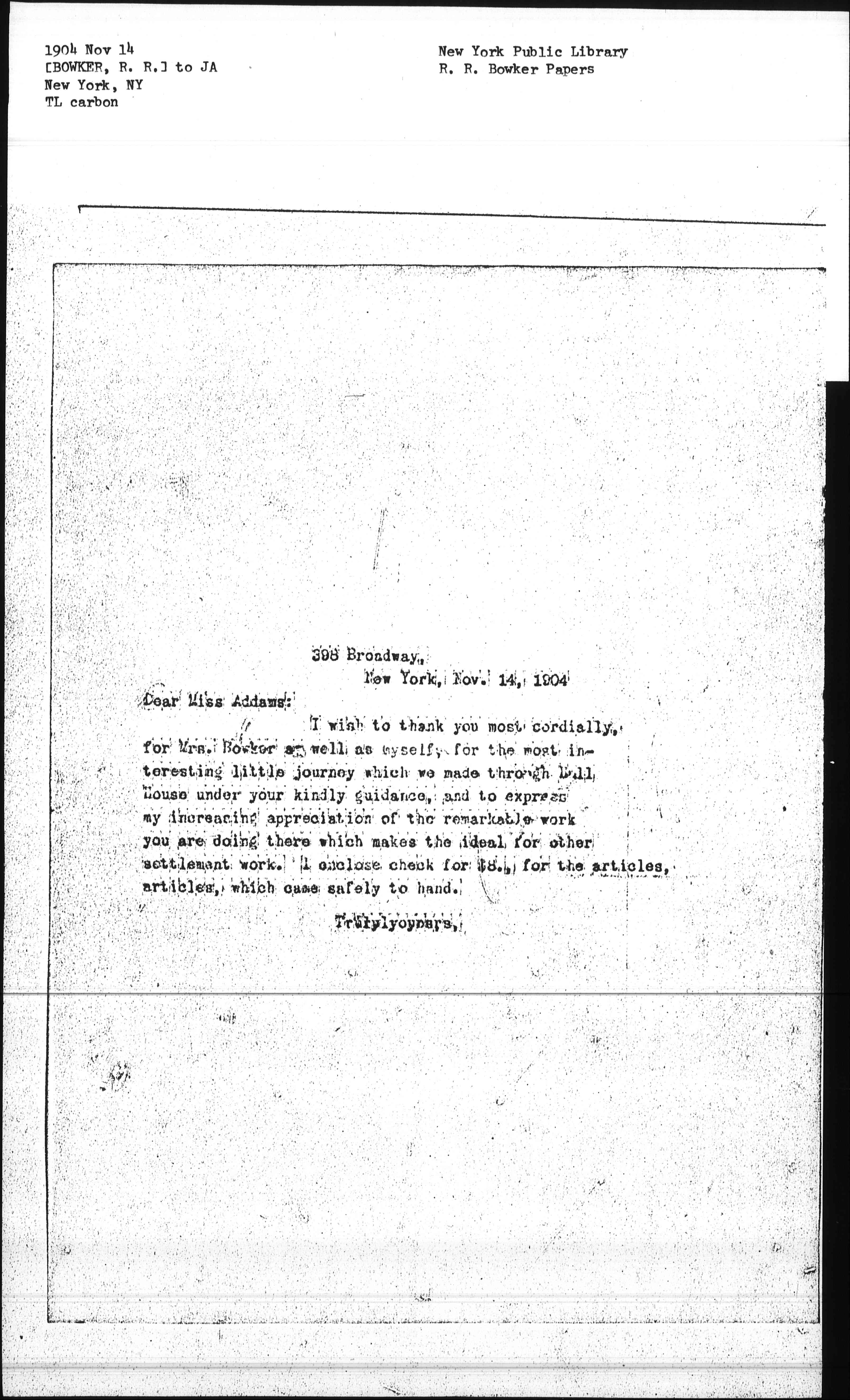 I wish to thank you most cordially, for Mrs. Bowker as well as myself, for the most interesting little journey which we made through Hull House under your kindly guidance, and to express my increasing appreciation of the remarkable work you are doing there which makes the ideal for other settlement work. I enclose check for $8., for the articles, which came safely to hand.