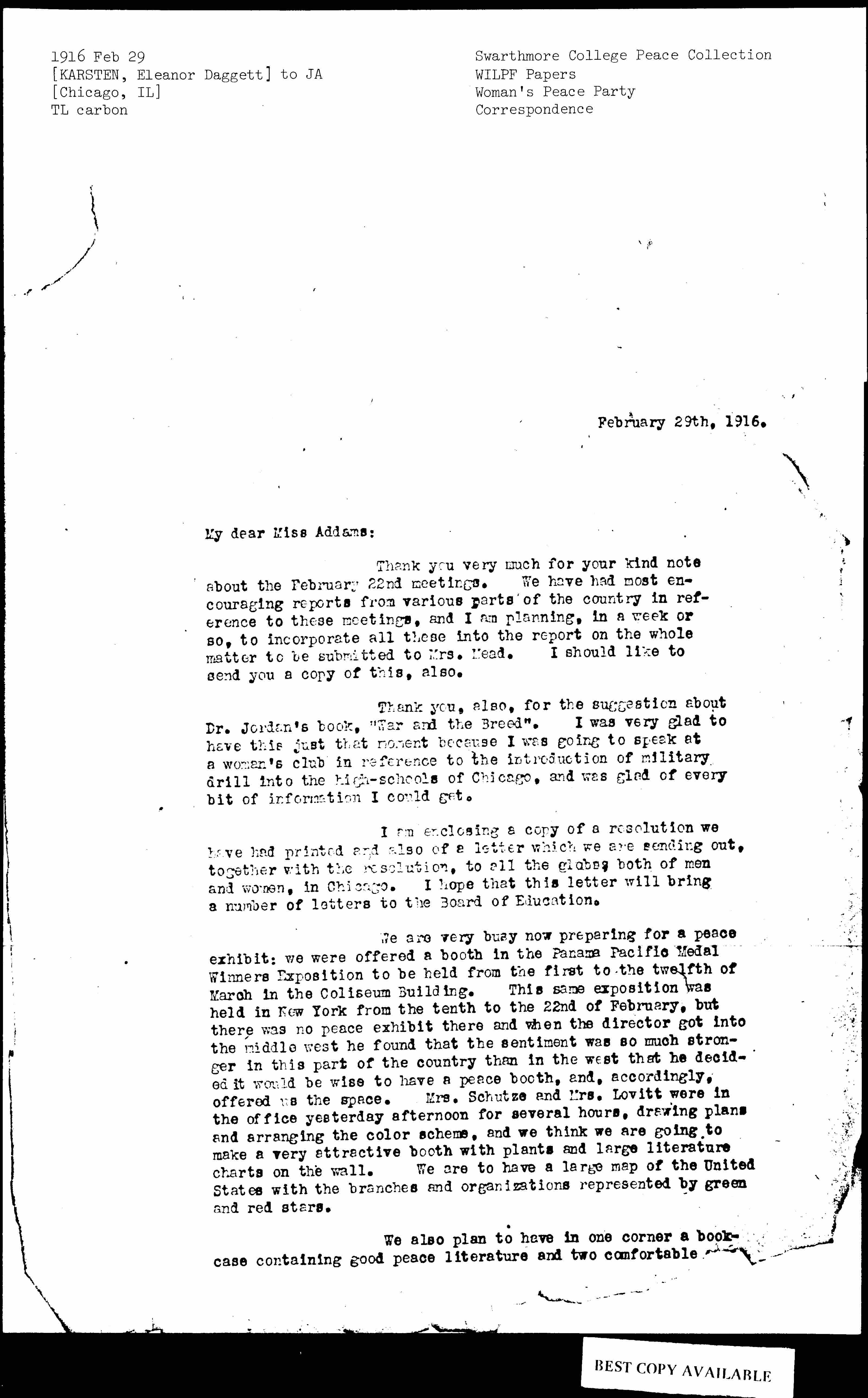 Thank you, also, for the suggestion about Dr. Jordan's book, "War and the Breed". I was very glad to have this just that moment because I was going to speak at a woman's club in reference to the introduction of military drill into the high-schools of Chicago, and was glad of every bit of information I could get.