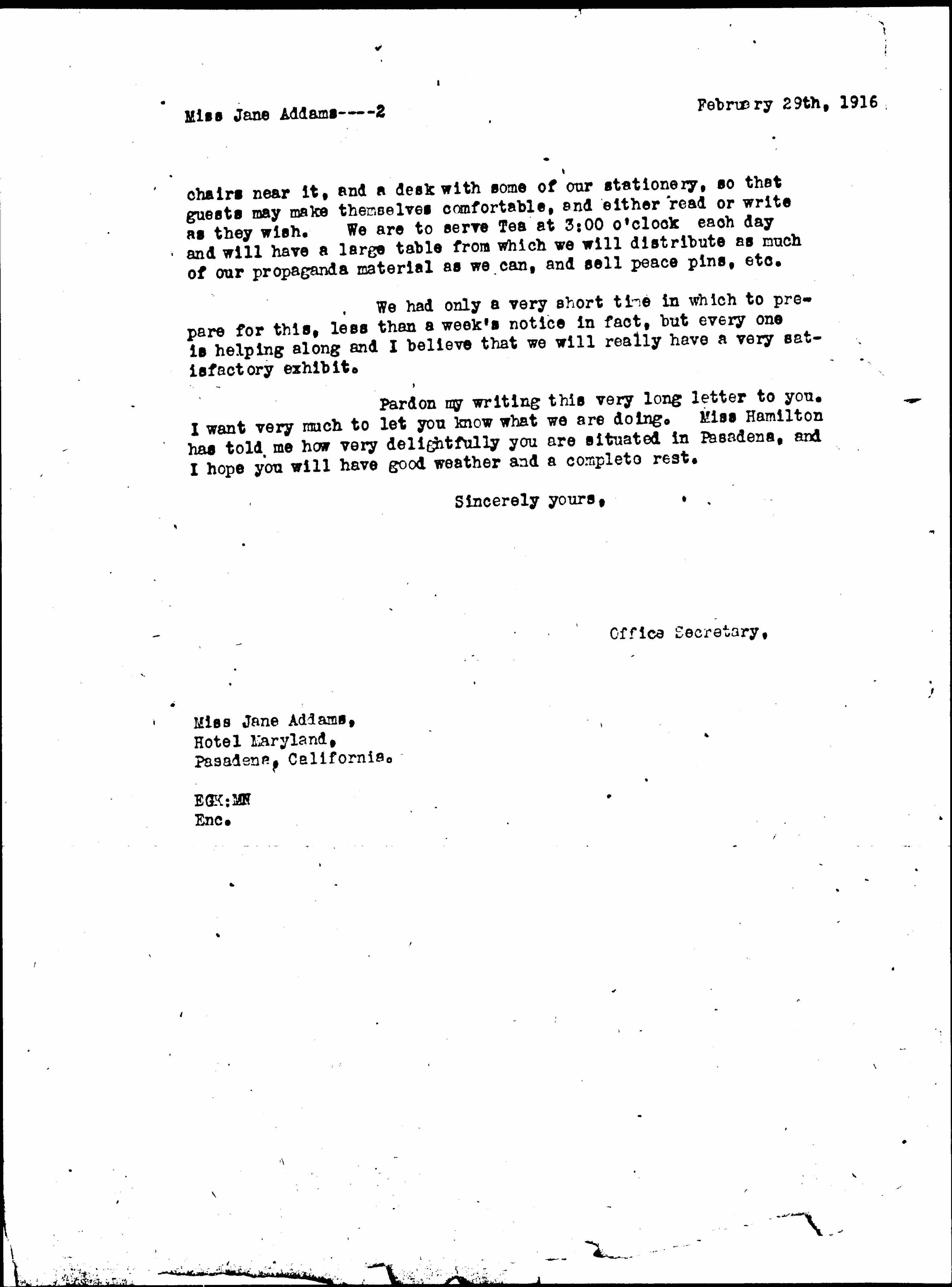 We also plan to have in one corner a bookcase containing good peace literature and two comfortable [page 2] chairs near it, and a desk with some of our stationery, so that guests may make themselves comfortable, and either read or write as they wish. We are to serve Tea at 3:00 o'clock each day and will have a large table from which we will distribute as much of our propaganda material as we can, and sell peace pins, etc.