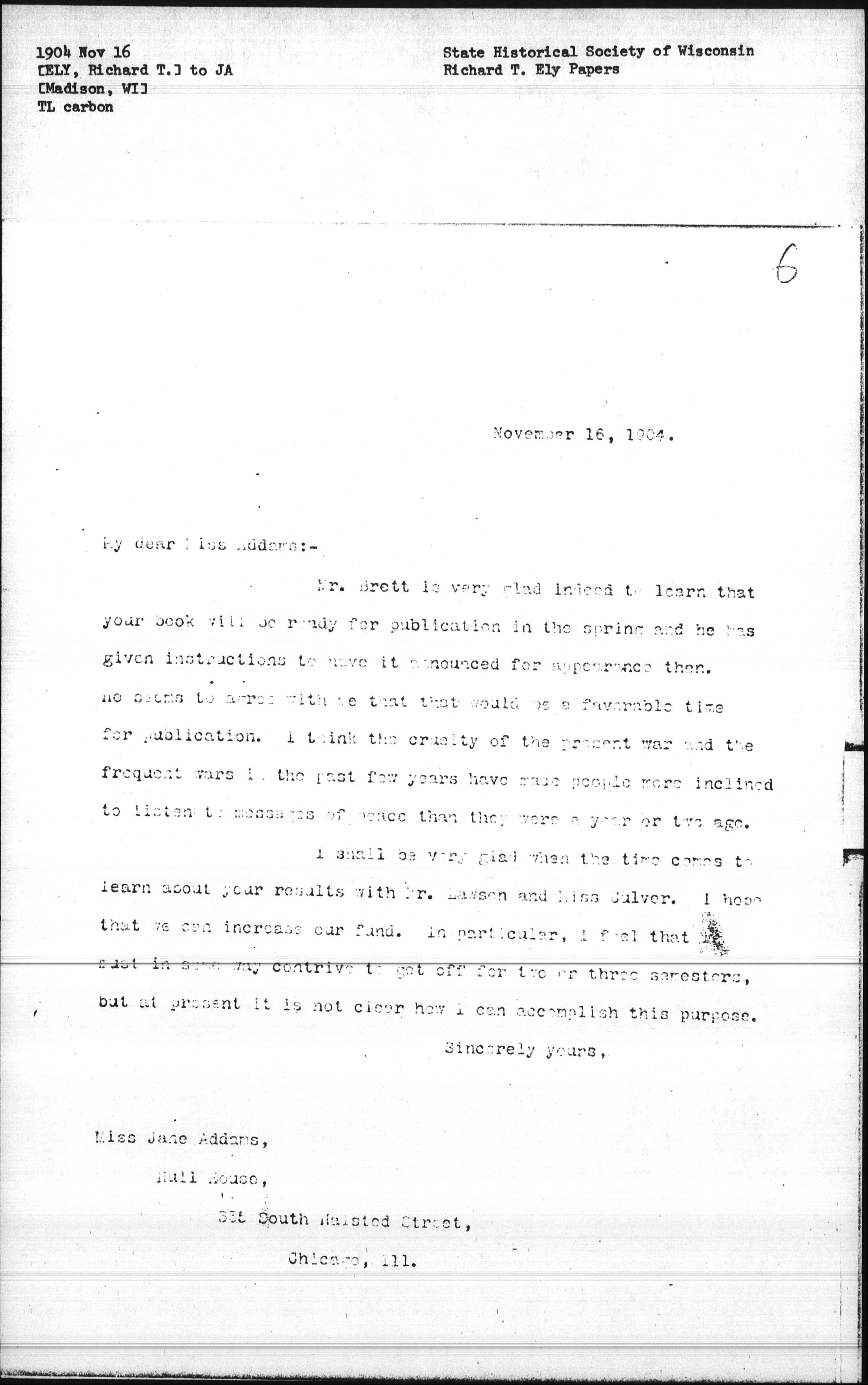 Mr. Brett is very glad indeed to learn that your book will be ready for publication in the spring and he has given instructions to have it announced for appearances then. He seems to agree with me that that would be a favorable time for publication. I think the cruelty of the present war and the frequent wars in the past few years have made people more inclined to listen to messages of peace than they were a year or two ago.