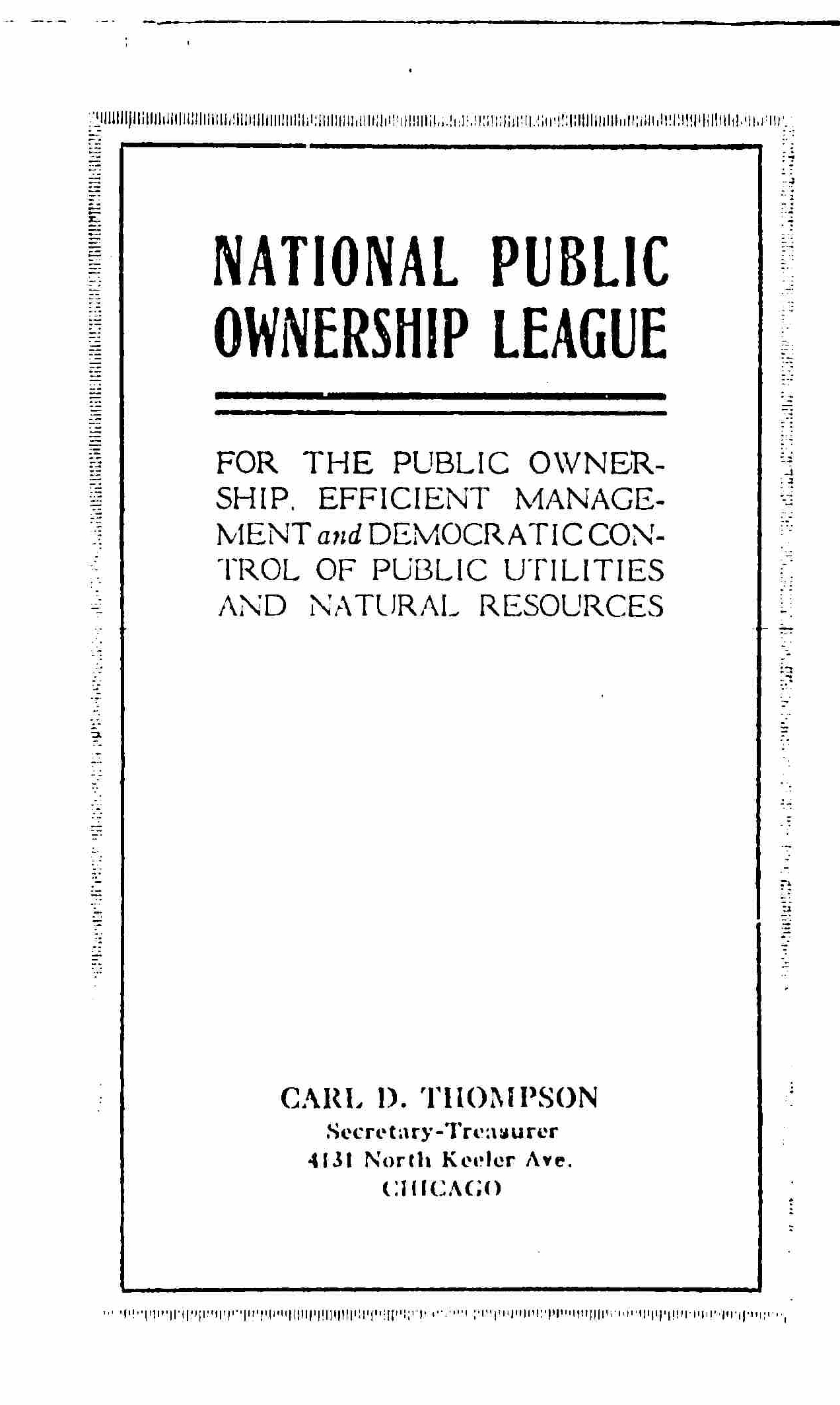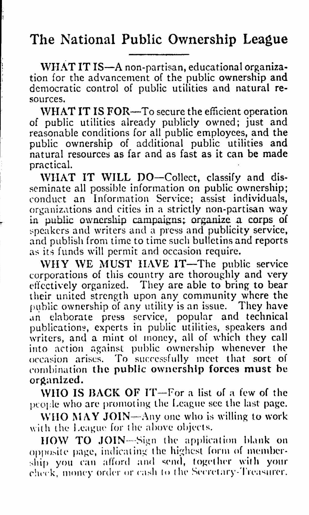 WHY WE MUST HAVE IT -- The public service corporations of this country are thoroughly and very effectively organized. They are able to bring to bear their united strength upon any community where the public ownership of any utility is an issue. They have an elaborate press service, popular and technical publications, experts in public utilities, speakers and writers, and a mint of money, all of which they call into action against public ownership whenever the occasion arises. To successfully meet that sort of combination the public ownership forces must be organized.