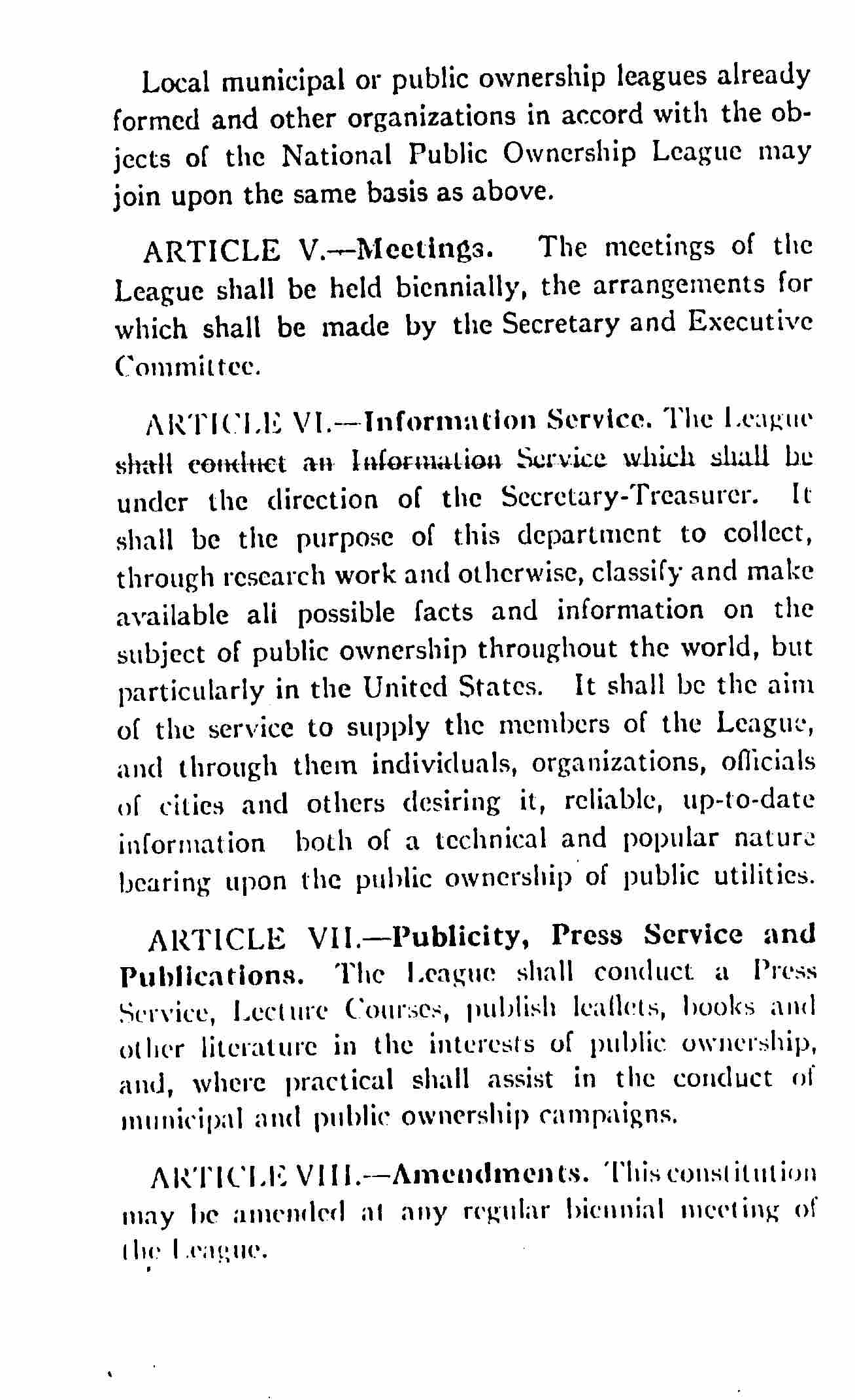 ARTICLE VII. -- Publicity, Press Service and Publications. The League shall conduct a Press Service, Lecture Courses, publish leaflets, books and other literature in the interests of public ownership, and, where practical shall assist in the conduct of municipal and public ownership campaigns.