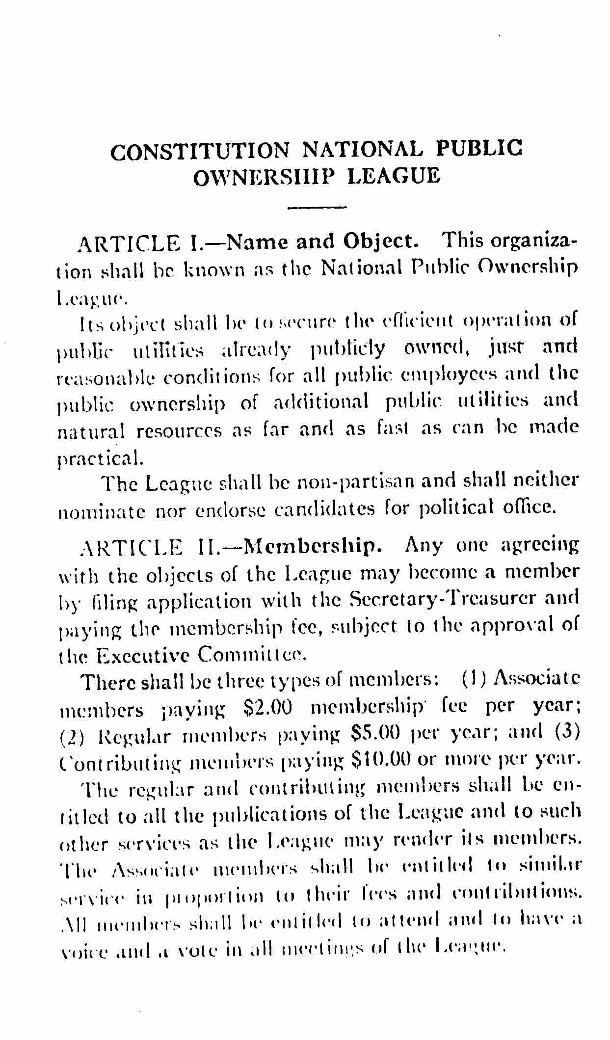 ARTICLE I. -- Name and Object. This organization shall be known as the National Public Ownership League.