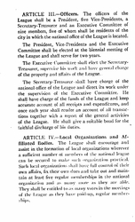 ARTICLE IV. -- Local Organizations and Affiliated Bodies. The League shall encourage and assist in the formation of local organizations wherever a sufficient number of members of the national league can be secured to make such organization practical. Such local organizations shall have full control of their own affairs, fix their own dues and take out and maintain at least five regular memberships in the national organization and as many more as they are able. They shall be entitled to as many votes in the meetings of the League as they have paid-up, regular memberships. [page 7]
