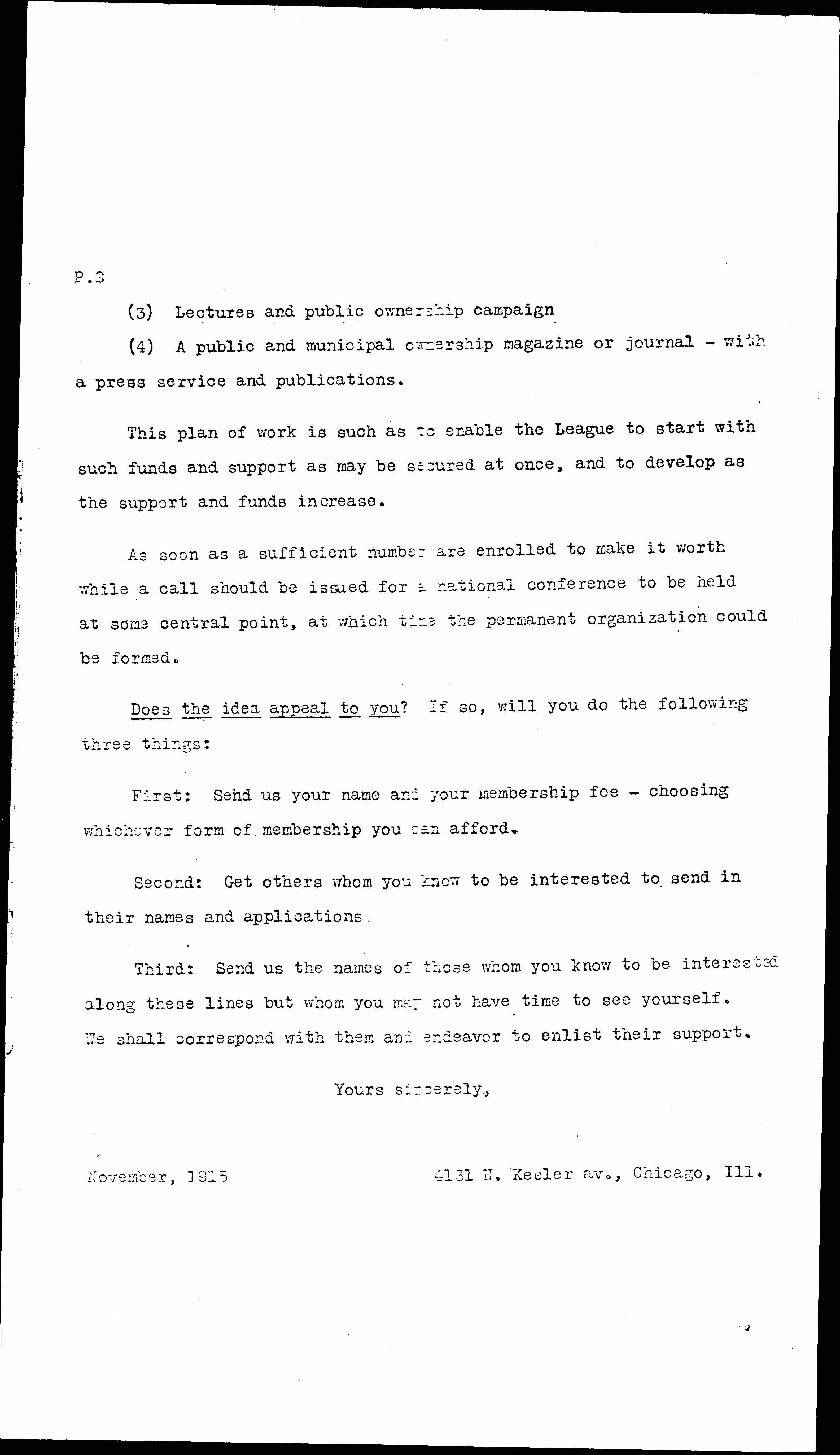 Third: Send us the names of those whom you know to be interested along these lines but whom you may not have time to see yourself. We shall correspond with them and endeavor to enlist their support.