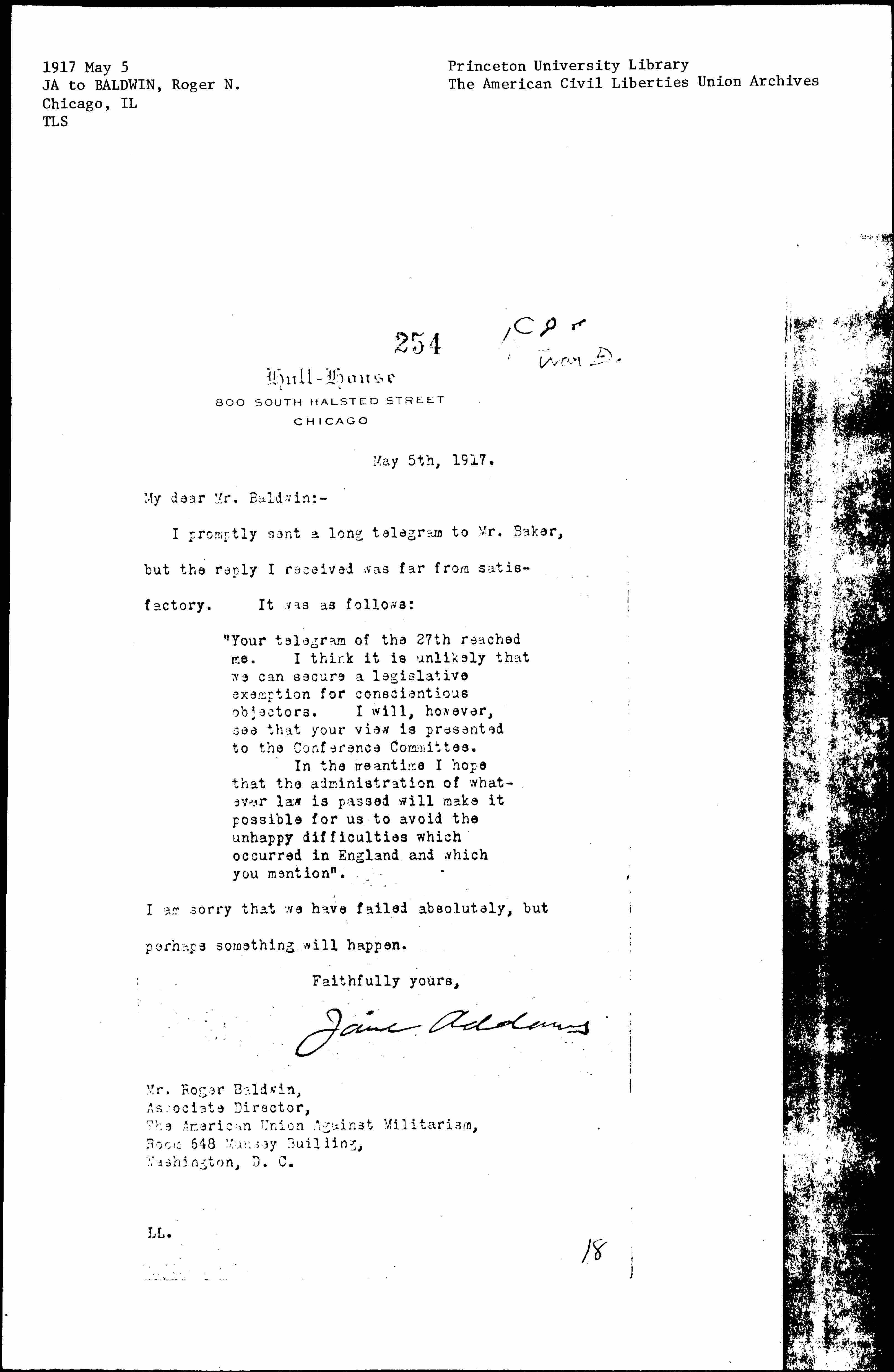 "Your telegram of the 27th reached me. I think it is unlikely that we can secure a legislative exemption for conscientious objectors. I will, however, see that your view is presented to the Conference Committee.