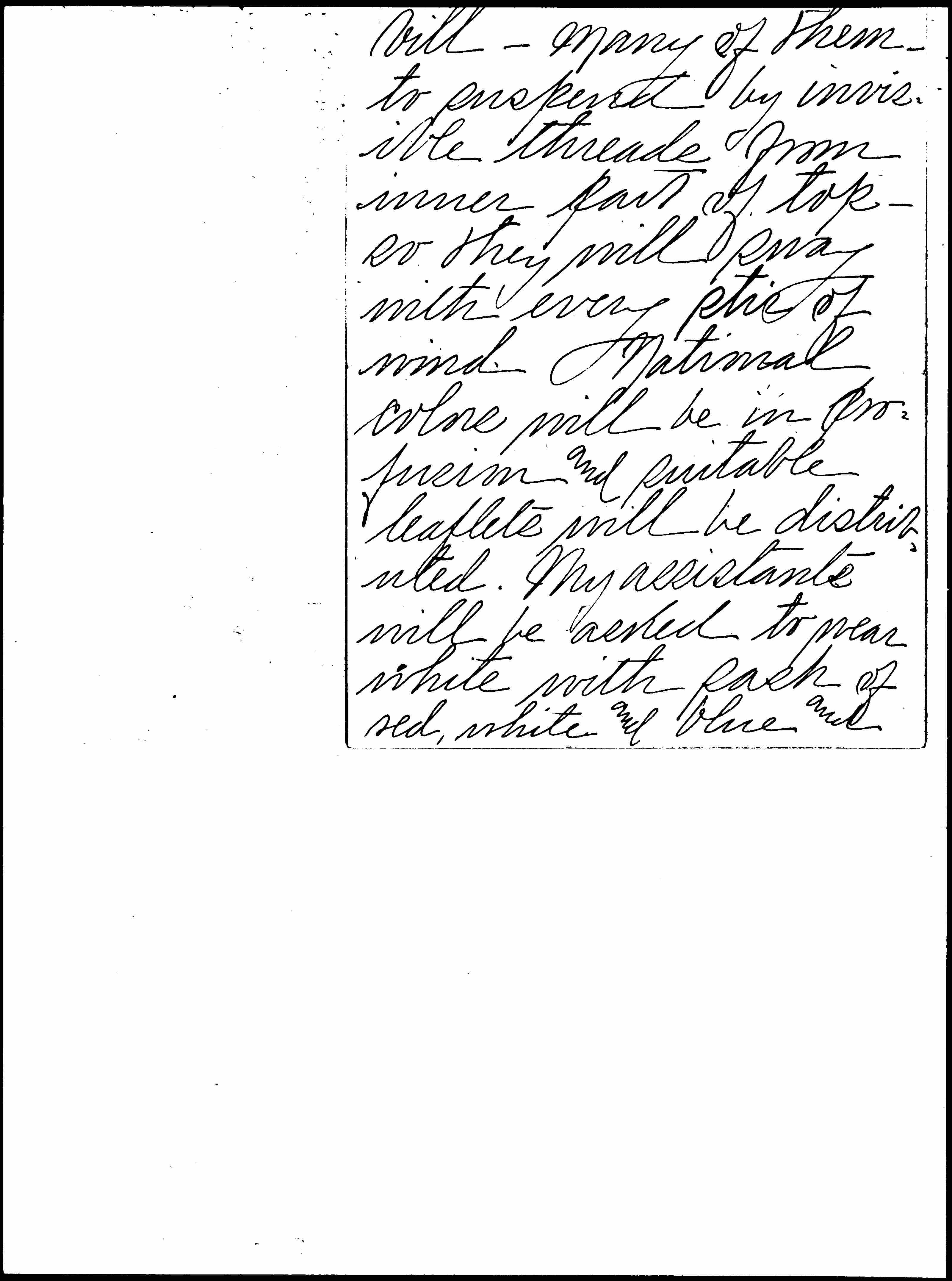 I want card-board "Peace Doves" -- not small but natural size -- with Olive branch in [page 4] bill -- many of them -- to suspend by invisible threads from inner part of top -- so they will sway with every stir of wind. National colors will be in profusion and suitable leaflets will be distributed. My assistants will be asked to wear white with sash of red, white and blue and [page 5] Liberty Cap. Am writing for your opinion concerning my ideas and shall be appreciative of suggestions.