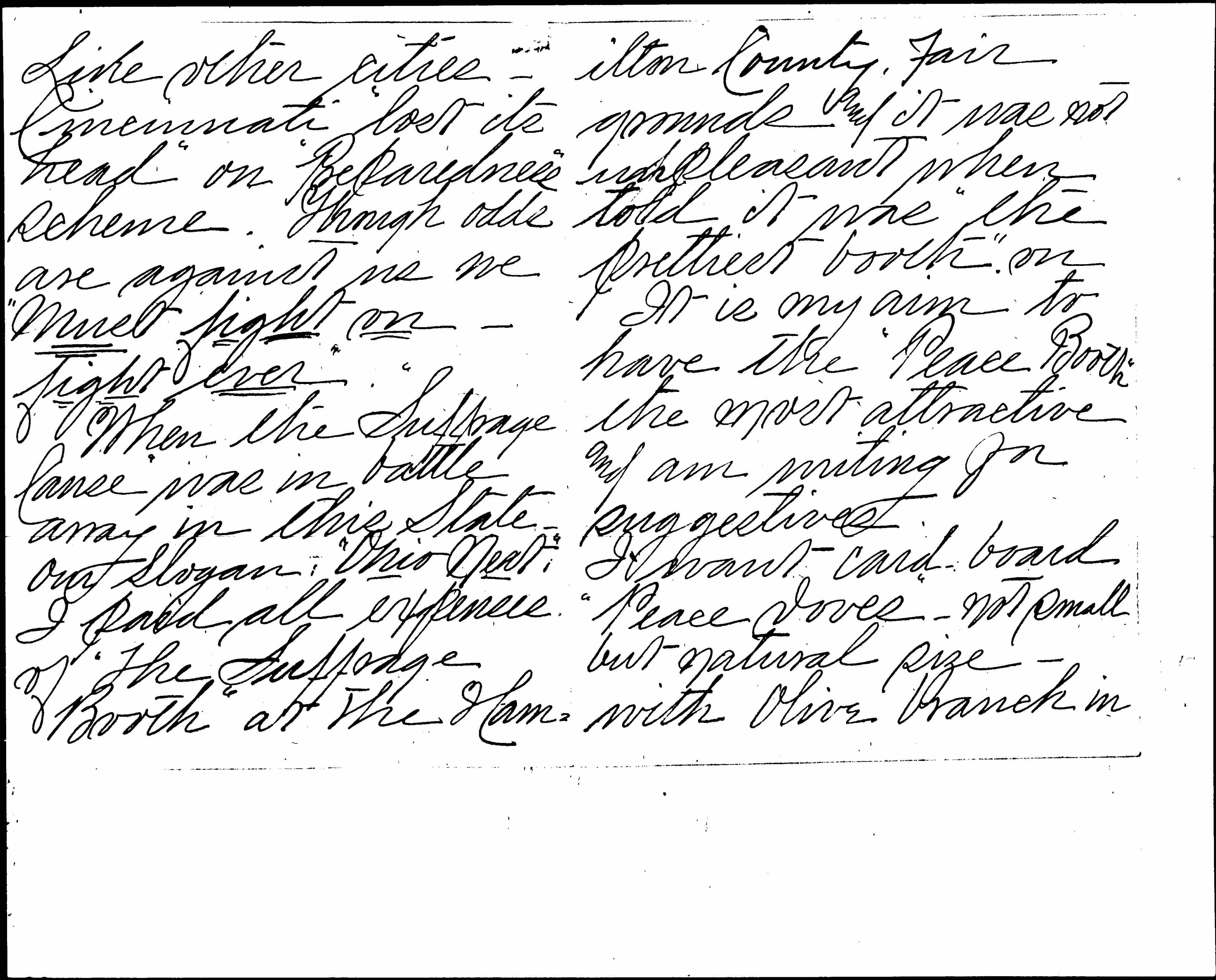 When the Suffrage Cause was in battle array in this State -- our Slogan: "Ohio Next." I paid all expenses of "The Suffrage Booth" at the Hamilton [page 3] County Fair grounds and it was not unpleasant when told it was "the prettiest booth" on.
