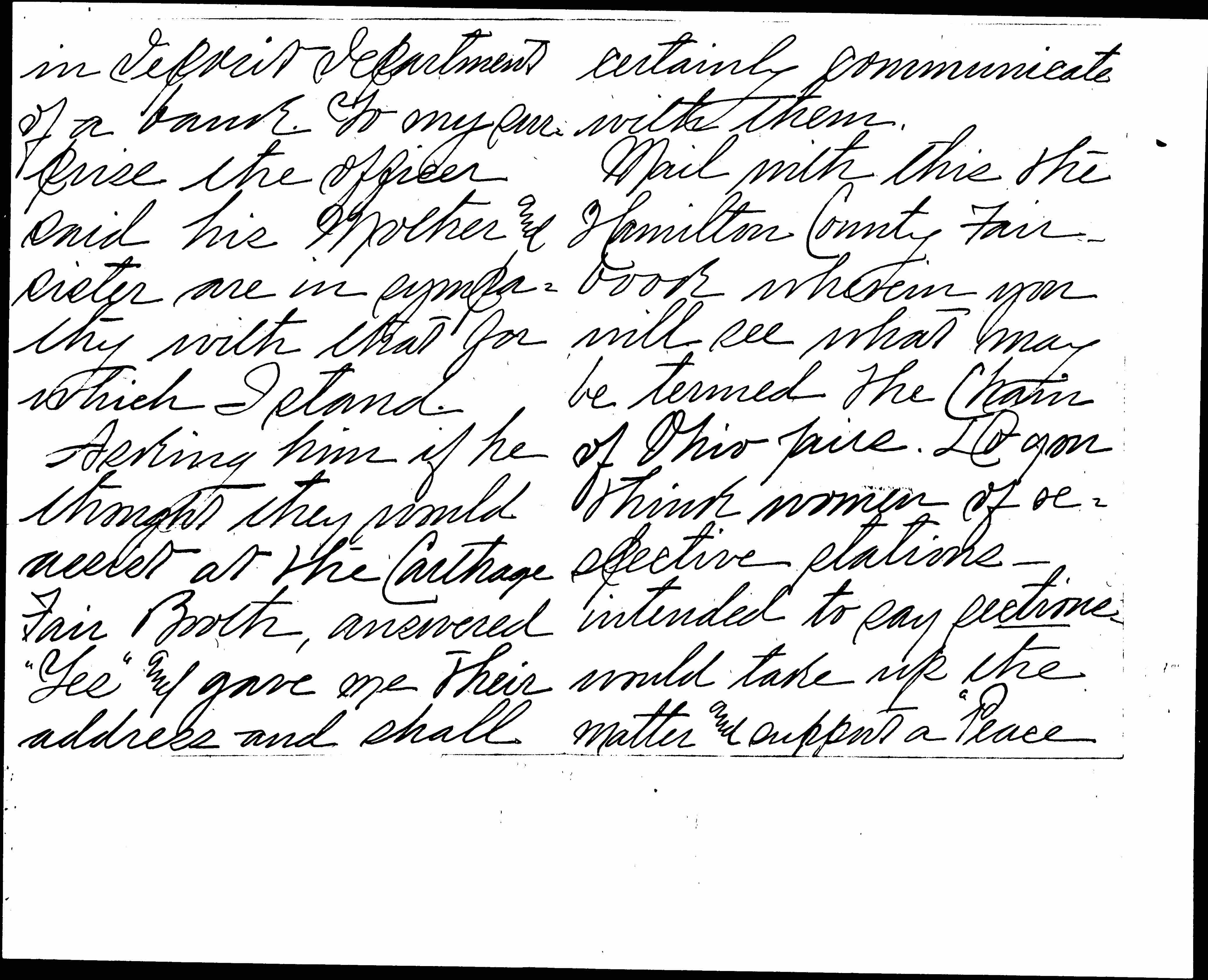 Mail with this the Hamilton County Fairbook wherein you will see what may be termed The Chain of Ohio fairs. Do you think women of respective stations -- intended to say sections -- would take up the matter and support a "Peace [page 8] Booth" at each fair?