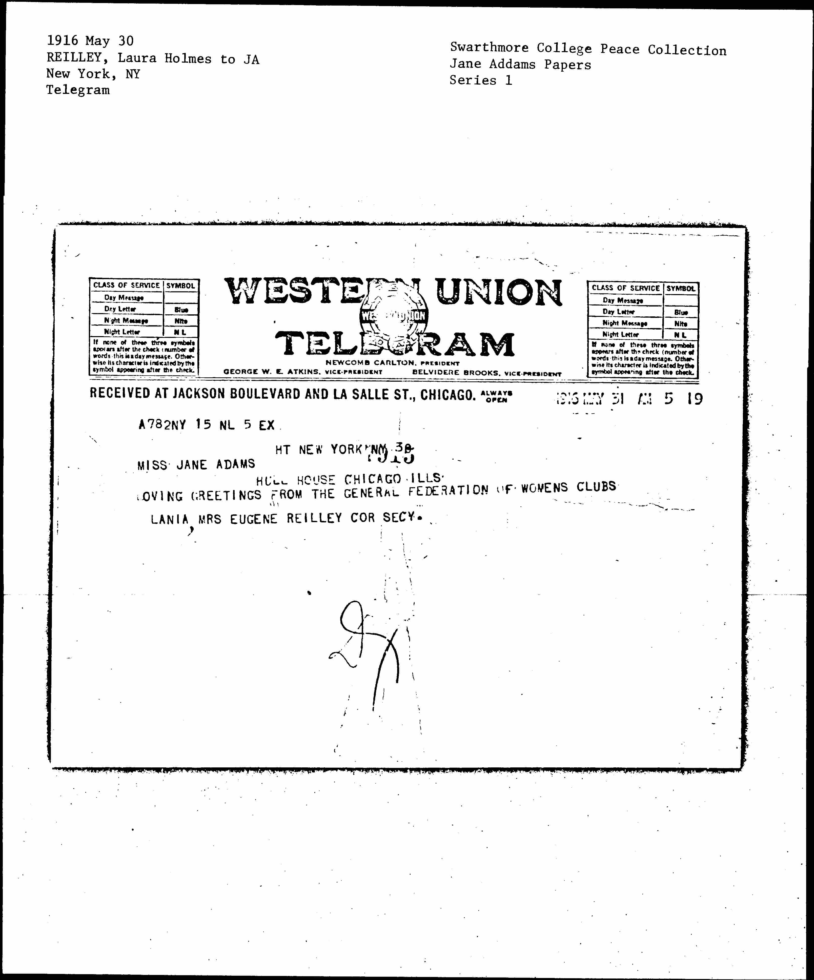 RECEIVED AT JACKSON BOULEVARD AND LA SALLE ST., CHICAGO. <1916 MAY 31 AM 5 19>