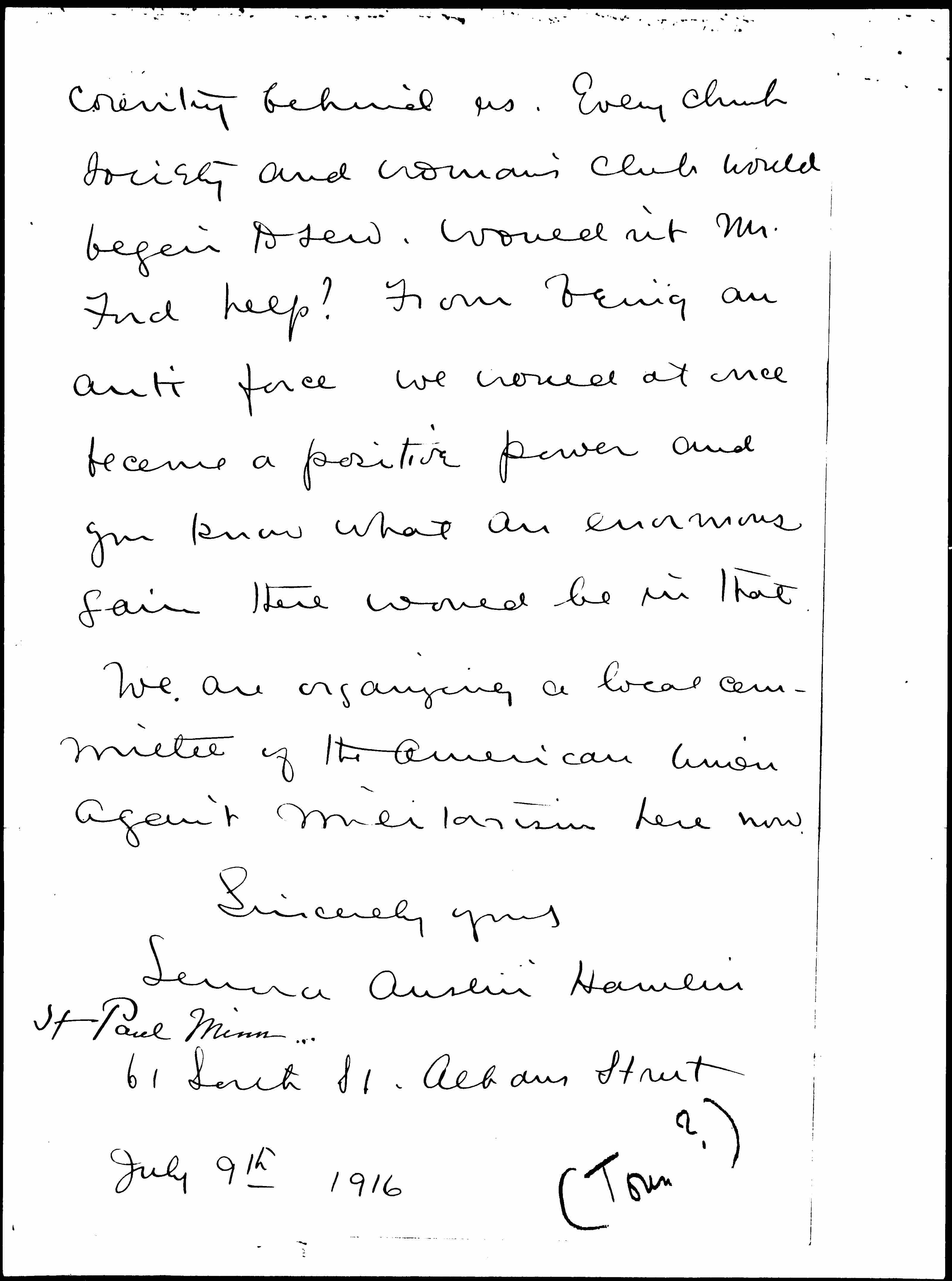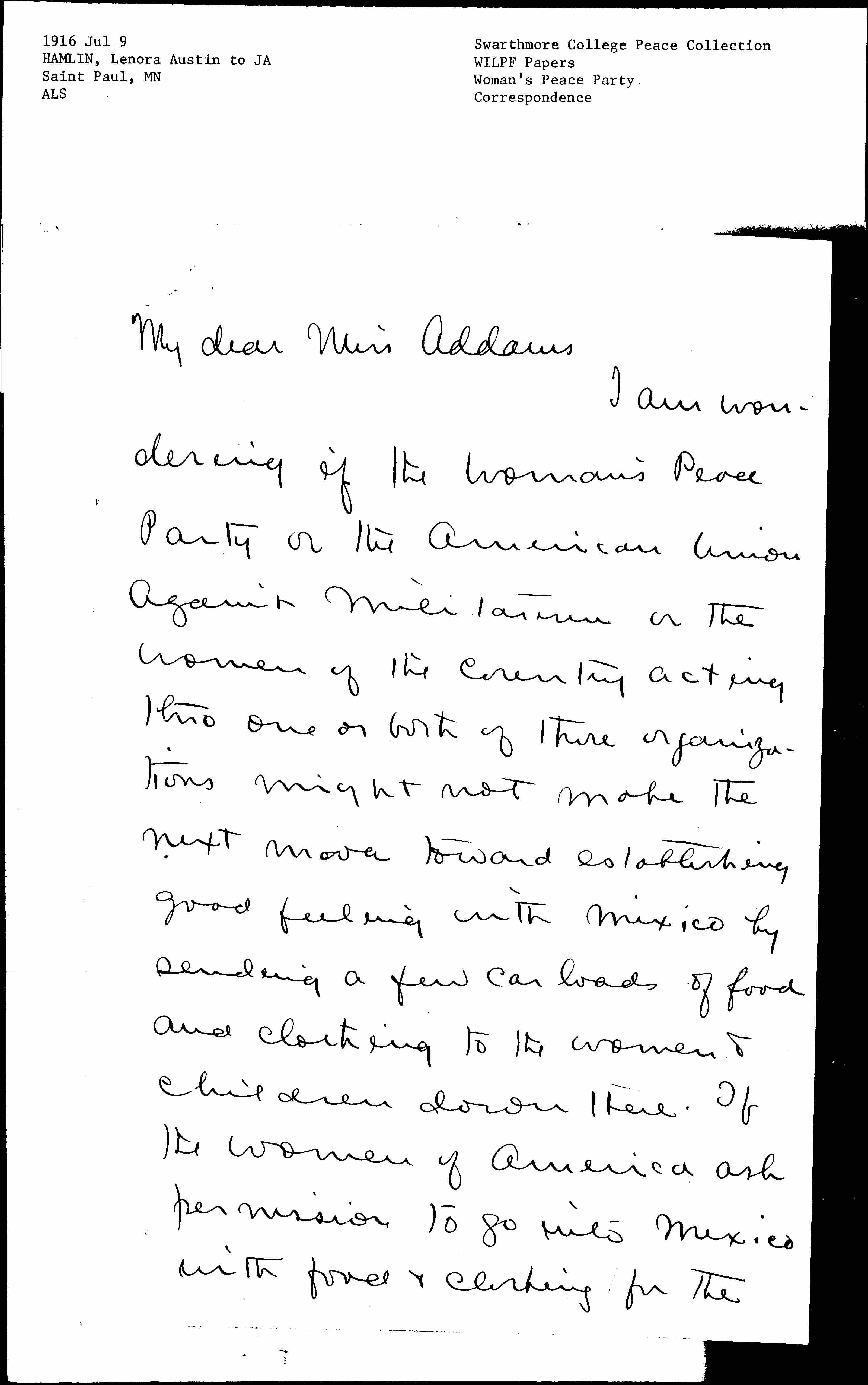 I am wondering if the Woman's Peace Party or the American Union Against Militarism or the women of the country acting [through] one or both of these organizations might not make the next move toward establishing good feeling with Mexico by sending a few car loads of food and clothing to the women & children down there. If the women of America ask [permission] to go into Mexico with food & clothing for the [page 2] women & children down there the Mexican governmt will not deny us and the whole country <(Mexico)> will be touched by it. I have been all over Mexico and I know how chivalrous and warm hearted the people are. It would be a master stroke for peace and Heaven knows the poor things are suffering terribly for the lack of such things as Americans could give. I know Carranza has already refused the services of our Red Cross but he wouldn't refuse the women. It would also be a big tactical advantage for the forces fighting militarism to lead in such a piece of constructive work. We would have the [page 3] country behind us. Every church society and woman's club would begin to sew. Wouldn't Mr. Ford help? From being an Anti force we would at once become a positive power and you know what an enormous gain there would be in that.