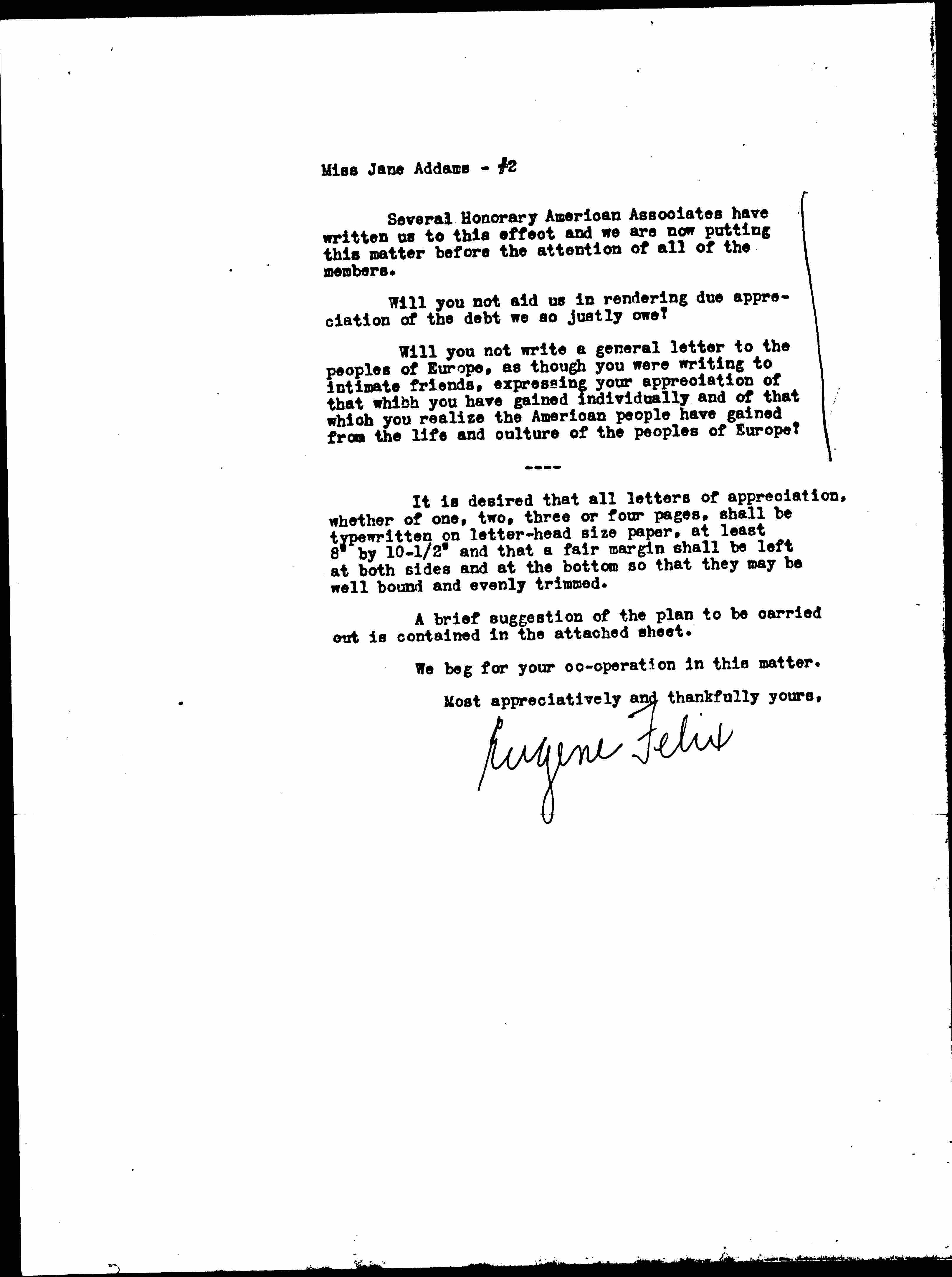 Will you not write a general letter to the peoples of Europe, as though you were writing to intimate friends, expressing your appreciation of that which you have gained individually and of that which you realize the American people have gained from the life and culture of the peoples of Europe?