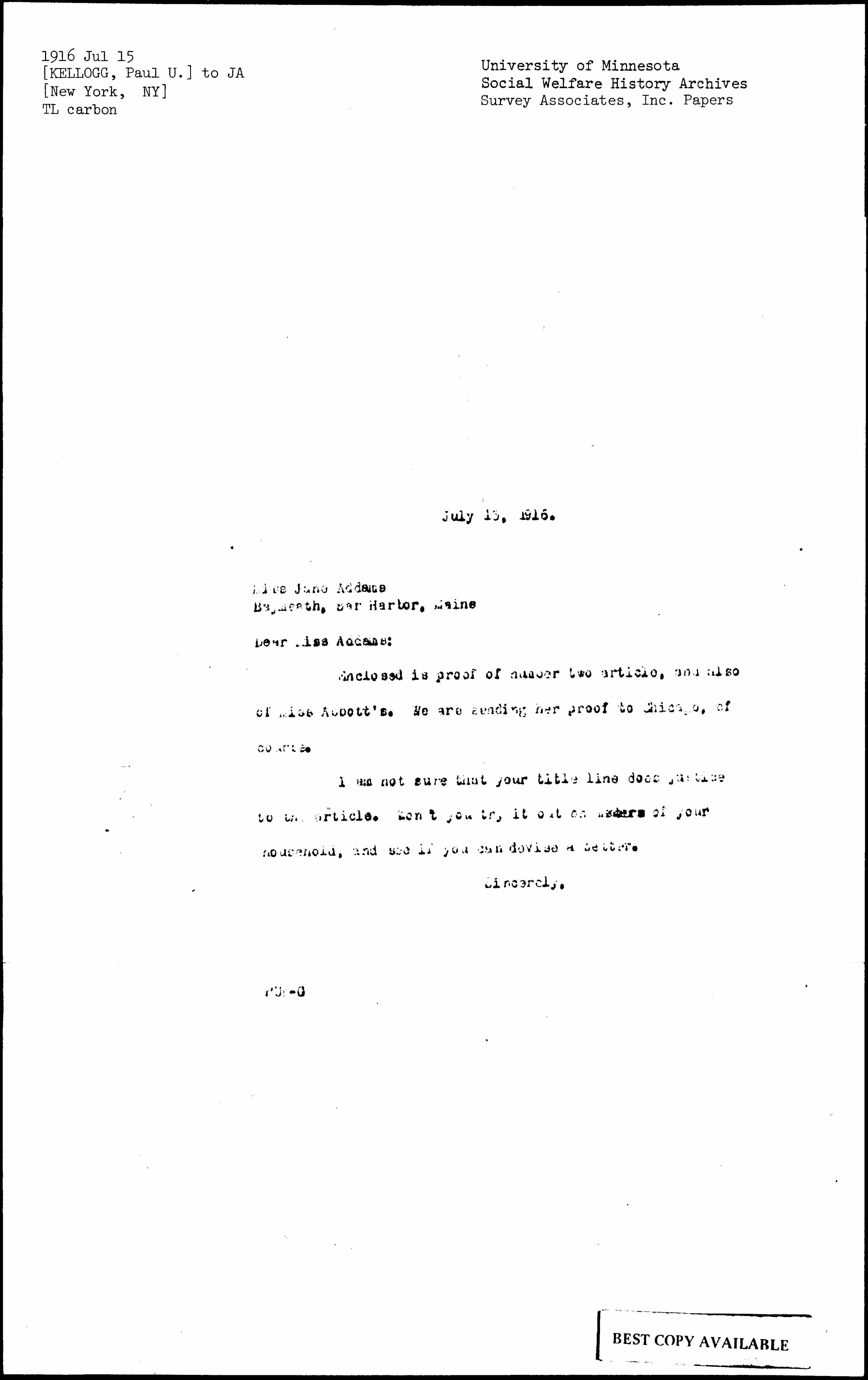 Enclosed is proof of number two article, and also of Miss Abbott's. We are sending her proof to Chicago, of course.