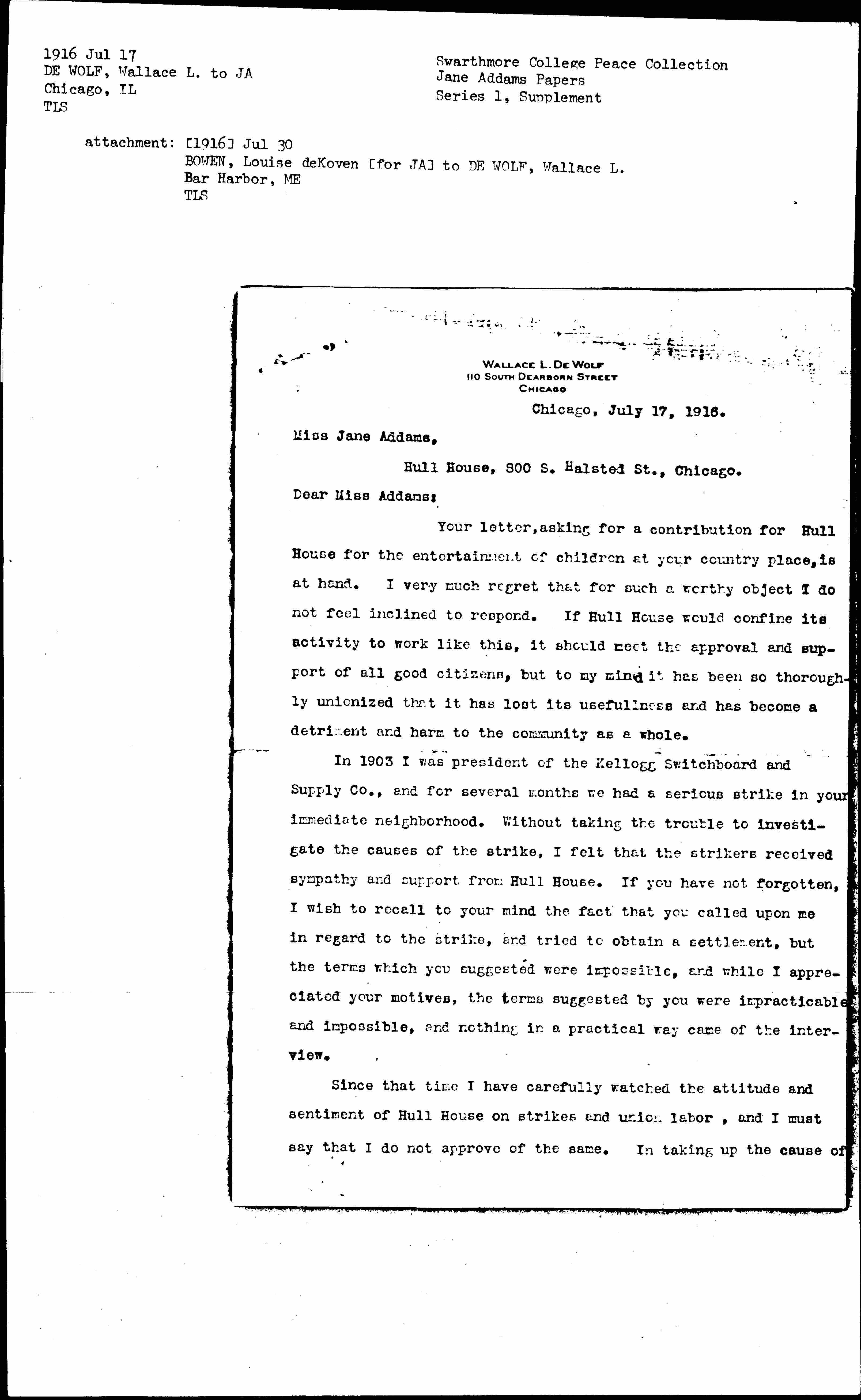 In 1903 I was president of the Kellogg Switchboard and Supply Co., and for several months we had a serious strike in your immediate neighborhood. Without taking the trouble to investigate the causes of the strike, I felt that the strikers received sympathy and support from Hull House. If you have not forgotten, I wish to recall to your mind the fact that you called upon me in regard to the strike, and tried to obtain a settlement, but the terms which you suggested were impossible, and while I appreciated your motives, the terms suggested by you were impracticable and impossible, and nothing in a practical way came of the interview.
