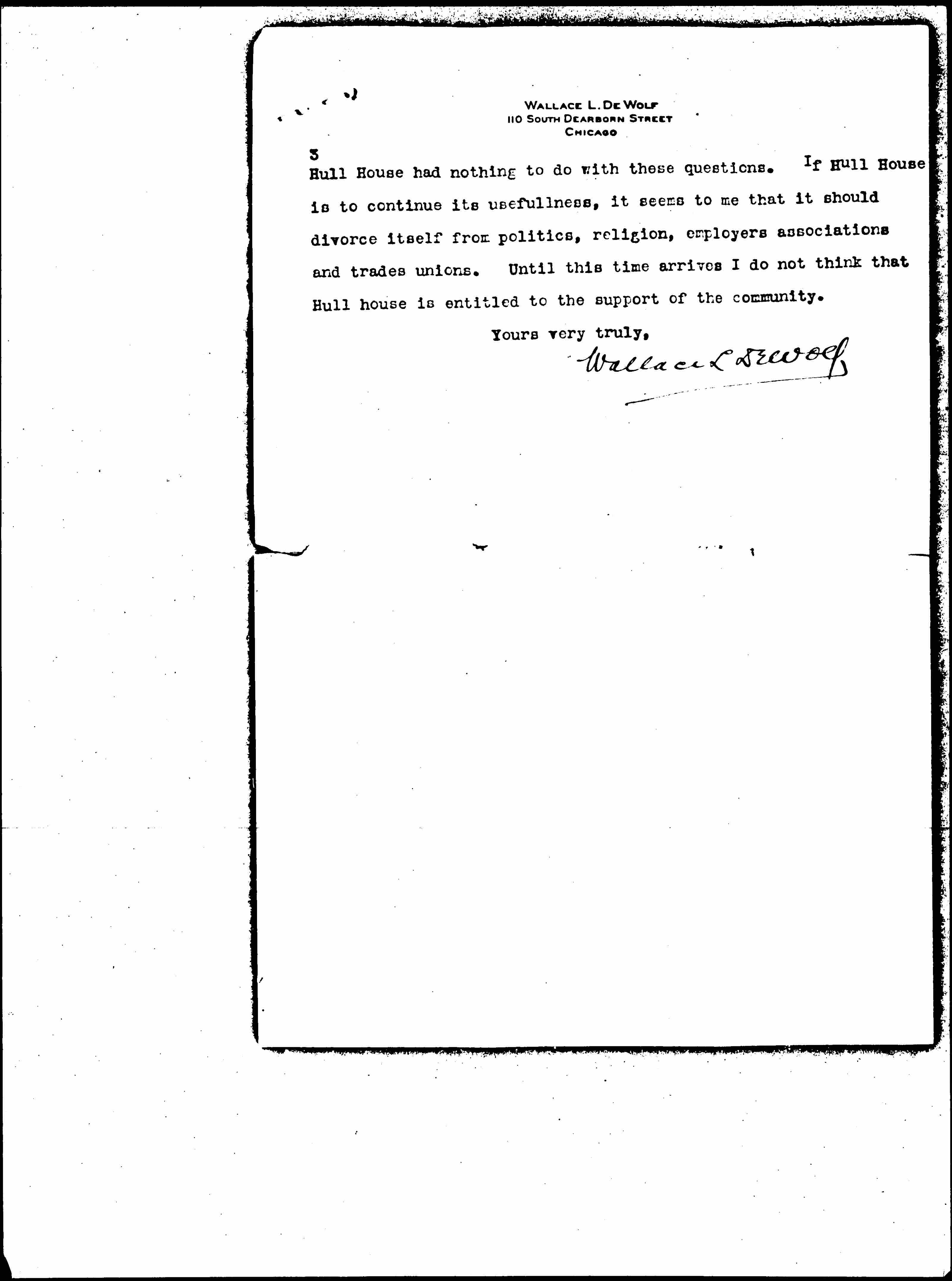 From Hull House we have heard commendations of the unions and their acts by members of the Hull House staff and its residents. It seems to me that it is time we heard something from Hull House on the other side of this question, although as far as I am concerned, it seems to me that it would be better if [page 3] Hull House had nothing to do with these questions. If Hull House is to continue its [usefulness], it seems to me that it should divorce itself from politics, religion, employers associations and trades unions. Until this time arrives I do not think that Hull House is entitled to the support of the community.