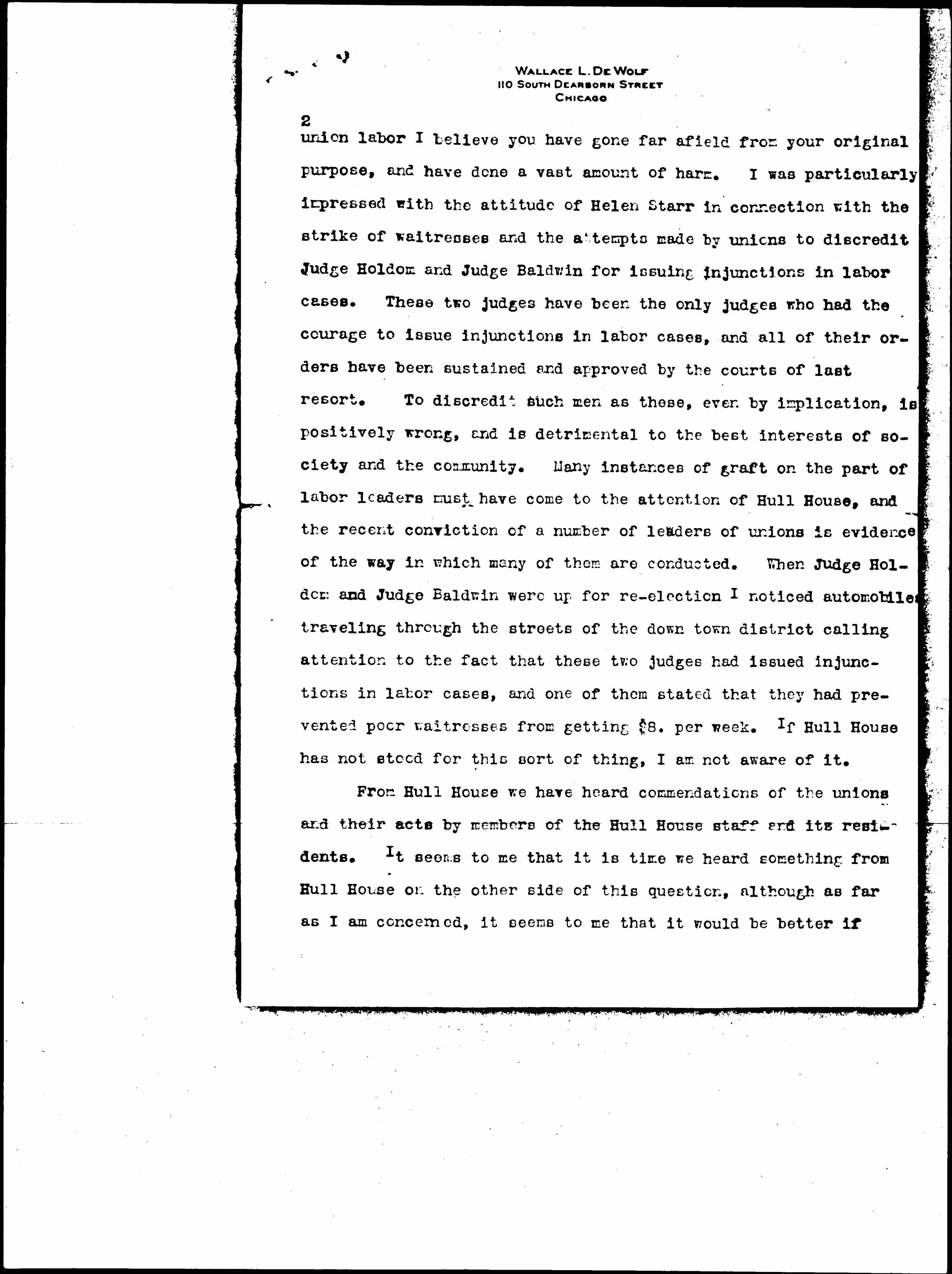 Since that time I have carefully watched the attitude and sentiment of Hull House on strikes and union labor, and I must say that I do not approve of the same. In taking up the cause of [page 2] union labor I believe you have gone far afield from your original purpose, and have done a vast amount of harm. I was particularly impressed with the attitude of Helen Starr in connection with the strike of waitresses and the attempts made by unions to discredit Judge Holdom and Judge Baldwin for issuing injunctions in labor cases. These two judges have been the only judges who had the courage to issue injunctions in labor cases, and all of their orders have been sustained and approved by the courts of last resort. To discredit such men as these, even by implication, is positively wrong, and is detrimental to the best interests of society and the community. Many instances of graft on the part of labor leaders must have come to the attention of Hull House, and the recent conviction of a number of leaders of unions is evidence of the way in which many of them are conducted. When Judge Holdom and Judge Baldwin were up for [reelection] I noticed automobiles traveling through the streets of the down town district calling attention to the fact that these two judges had issued injunctions in labor cases, and one of them stated that they had prevented poor waitresses from getting $8. per week. If Hull House has not stood for this sort of thing, I am not aware of it.