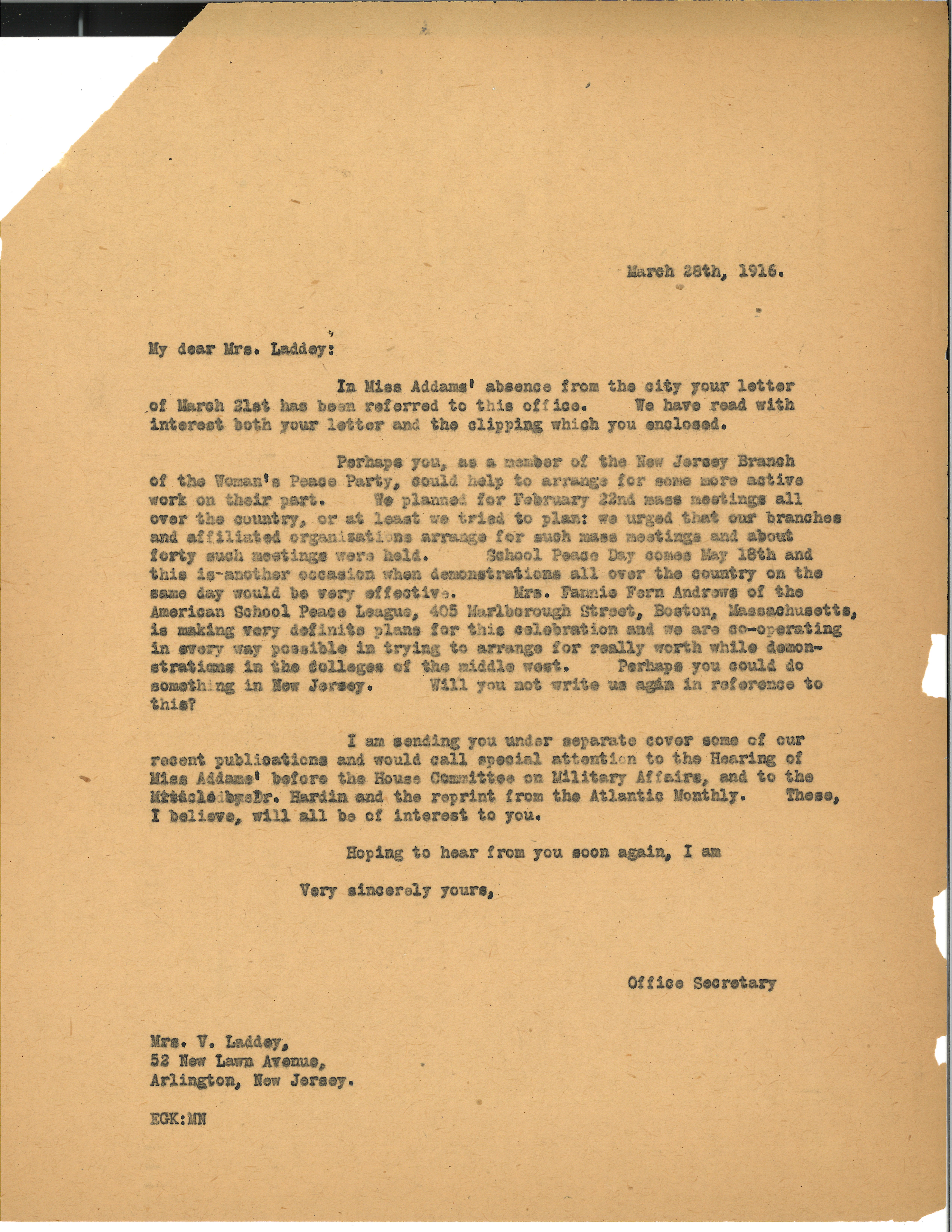 Perhaps you, as a member of the New Jersey Branch of the Woman's Peace Party, could help to arrange for some more active work on their part. We planned for February 22nd mass meetings all over the country, or at least we tried to plan: we urged that our branches and affiliated organizations arrange for such mass meetings and about forty such meetings were held. School Peace Day comes May 18th and this is another occasion when demonstrations all over the country on the same day would be very effective. Mrs. Fannie Fern Andrews of the American School Peace League, 405 Marlborough Street, Boston, Massachusetts, is making very definite plans for this celebration and we are [cooperating] in every way possible in trying to arrange for really worth while demonstrations in the colleges of the middle west. Perhaps you could do something in New Jersey. Will you not write us again in reference to this?