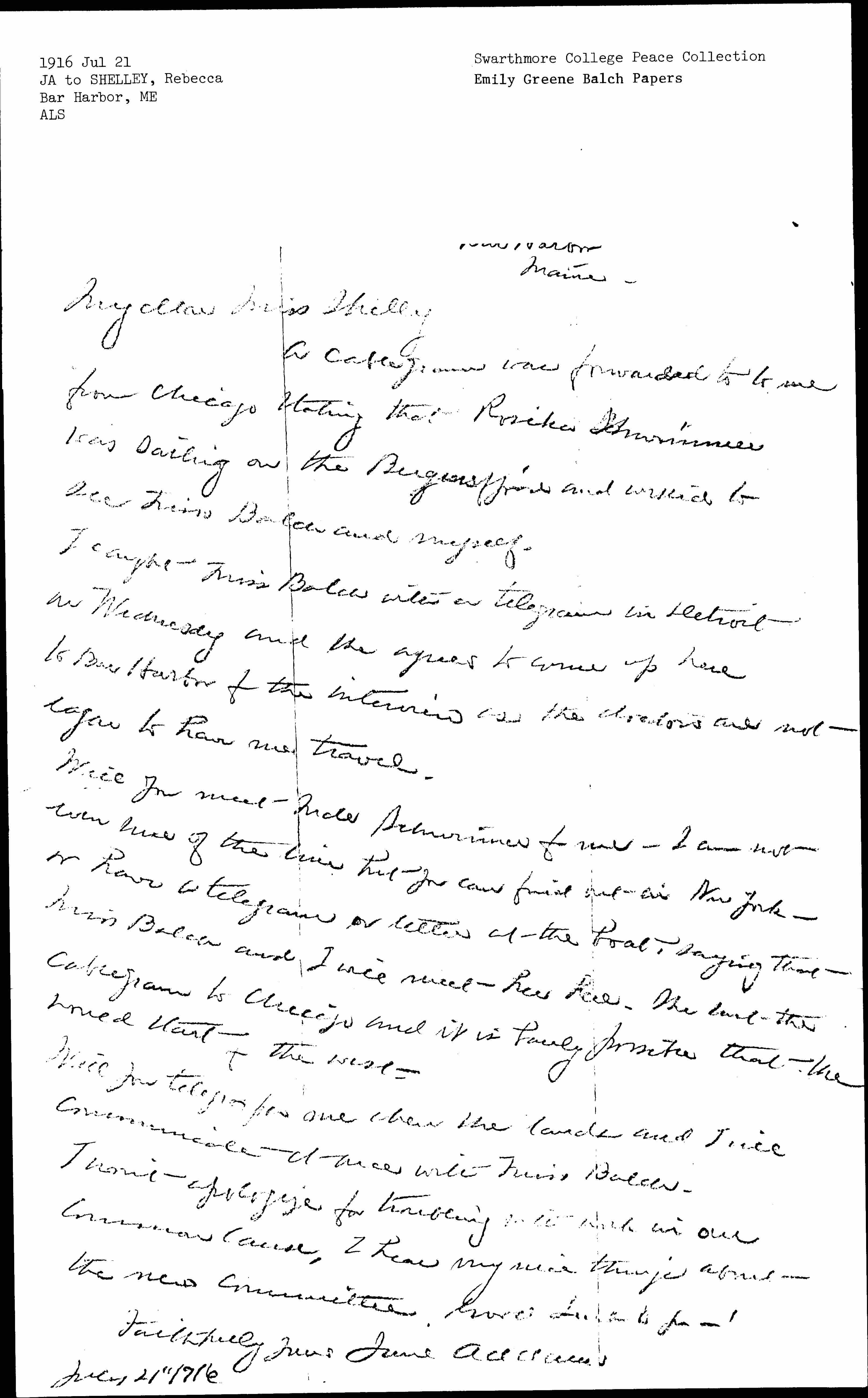Will you meet Mde Schwimmer for me -- I am not even sure of the time but you can find out in New York -- or have a telegram or letter at the boat, saying that Miss Balch and I will meet her here. She sent the cablegram to Chicago and it is barely possible that she would start for the west.