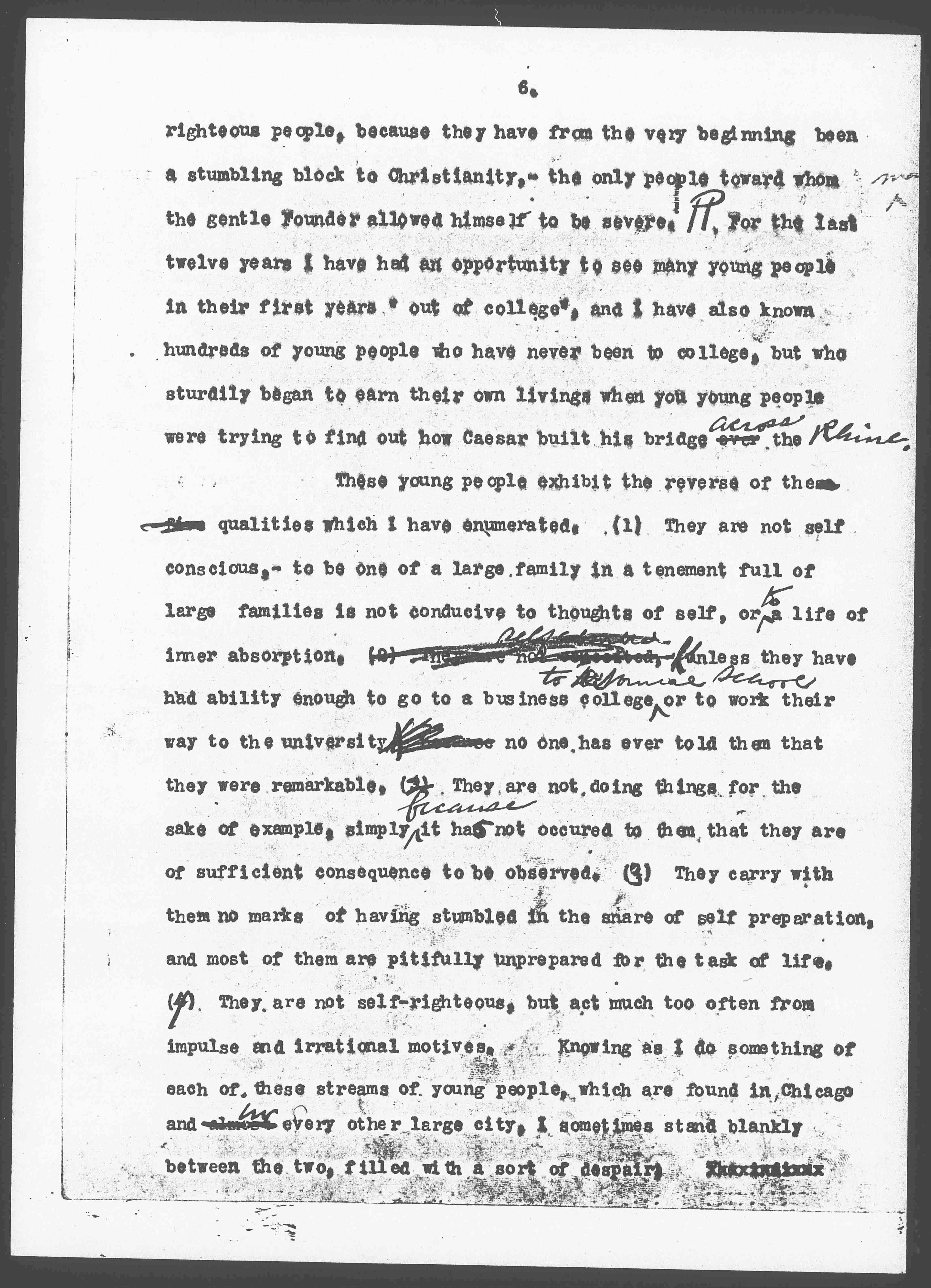 These young people exhibit these fine ↑the↓ qualities which I have enumerated. (1) They are not self conscious,– to be one of a large family in a tenement full of large families is not conducive to thoughts of self, or ↑to↓ a life of inner absorption. (2) They are not [conceited] ↑selfabsorbed↓ Unless they have had ability enough to go to a business college ↑to a Normal school↓ or to work their way to the university, [illegible] no one has ever told them that they were remarkable. (3↑2↓) They are not doing things for the sake of example, simply ↑because↓ it had not occurred to them that they are of sufficient consequence to be observed. (4↑3↓) They carry with them no marks of having stumbled in the snare of self preparation, and most of them are pitifully unprepared for the task of life. (5↑4↓) They are not self-righteous, but act much too often from impulse and irrational motives. Knowing as I do something of each of these streams of young people, which are found in Chicago and almost ↑in↓ every other large city, I sometimes stand blankly between the two, filled with a sort of despair; [page 8] the units in one stream are enfeebled ↑Hamletized↓ and pauperized, by constantly getting much and giving little,– the units in the other are enervated and ↑or↓ overworked, because they are put to the hard work ↑task↓ of life before they are ready for it. Personally I believe that the adaptation of Christianity, if it is made at all by this generation, must be made by contributions from both sets ↑streams↓ of people. ↑The↓ Christianity of the twentieth century must gather to itself, as did Christianity of the early centuries, both the learning of the wise and the virtues of the simple,- let us have clear thinking by all means,- but let us never separate ↑it↓ from action,- or we have thrown away the one clue which Jesus gave his followers,- the interdependence of the spirit and ↑the↓ world ↑the doctrine and the will.↓