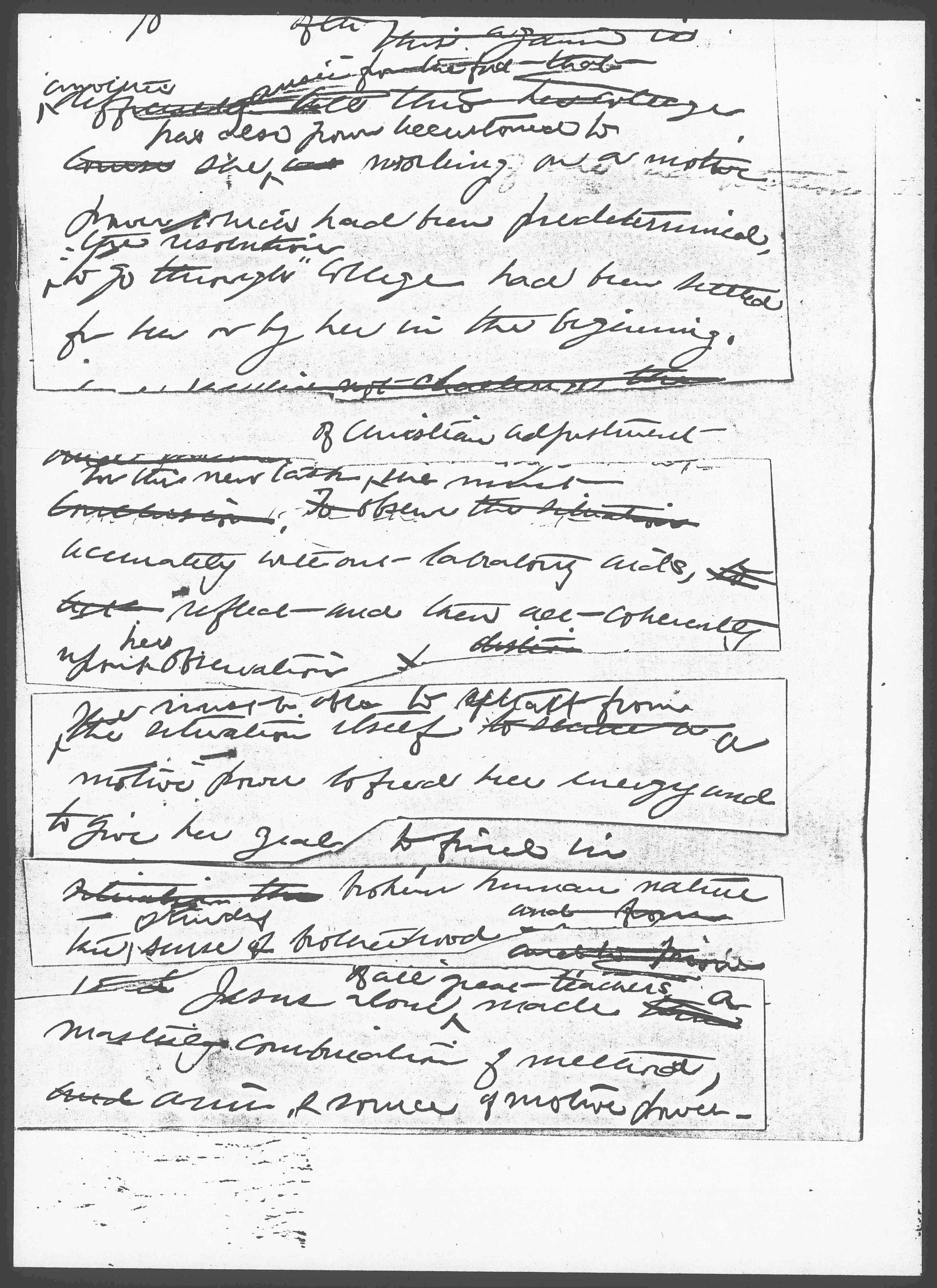 To give up the consciousness of one's own identity and achievements is perhaps the hardest demand which life can make of upon us - But certainly [page 10] those who call themselves Christians, who are striving to be of use to in this task of the adaptation of Christianity to social needs, should be ready to meet this demand. In all crisis the college woman, who takes this task but must cling to the Christian training as are against the college training.
