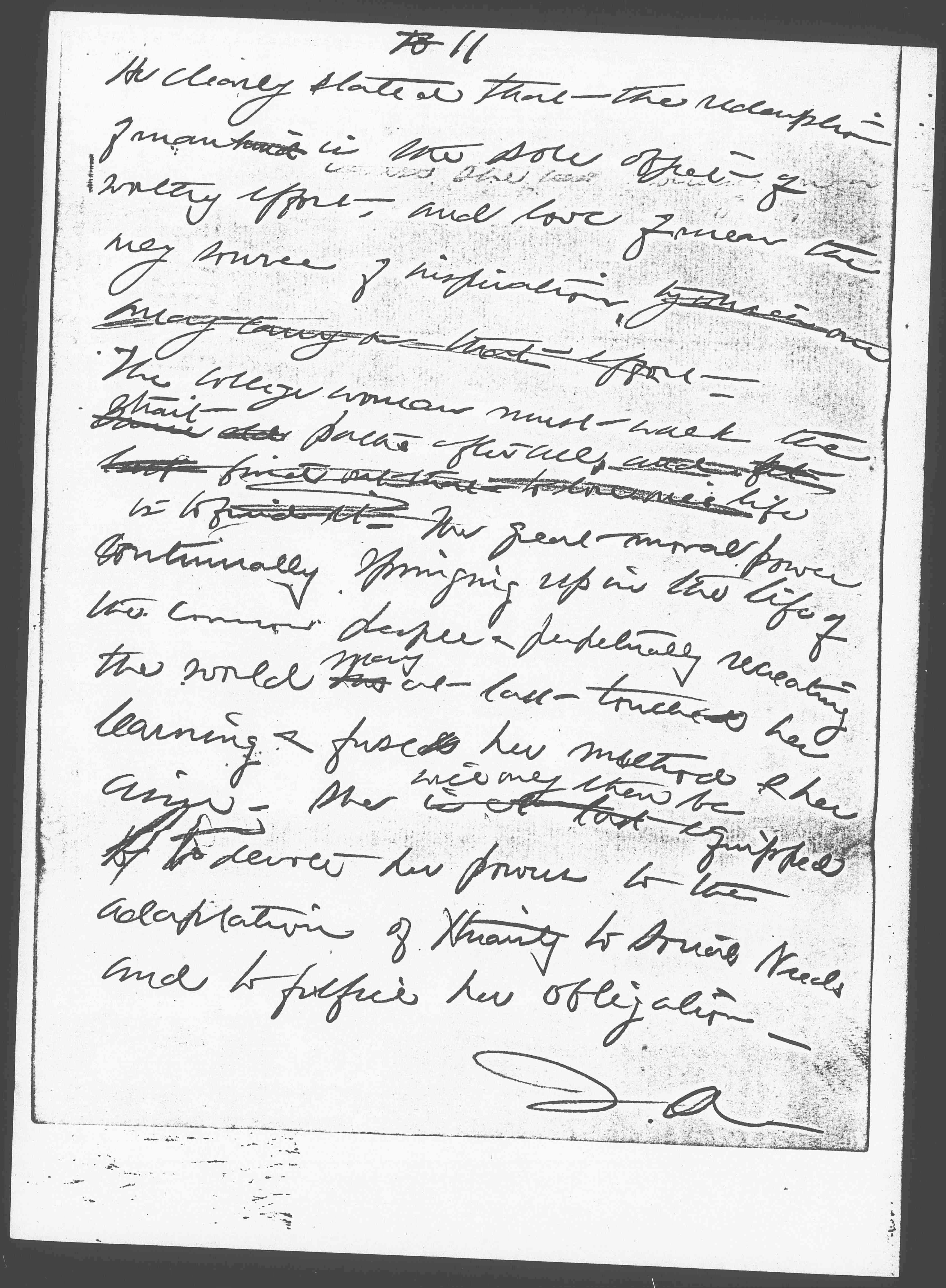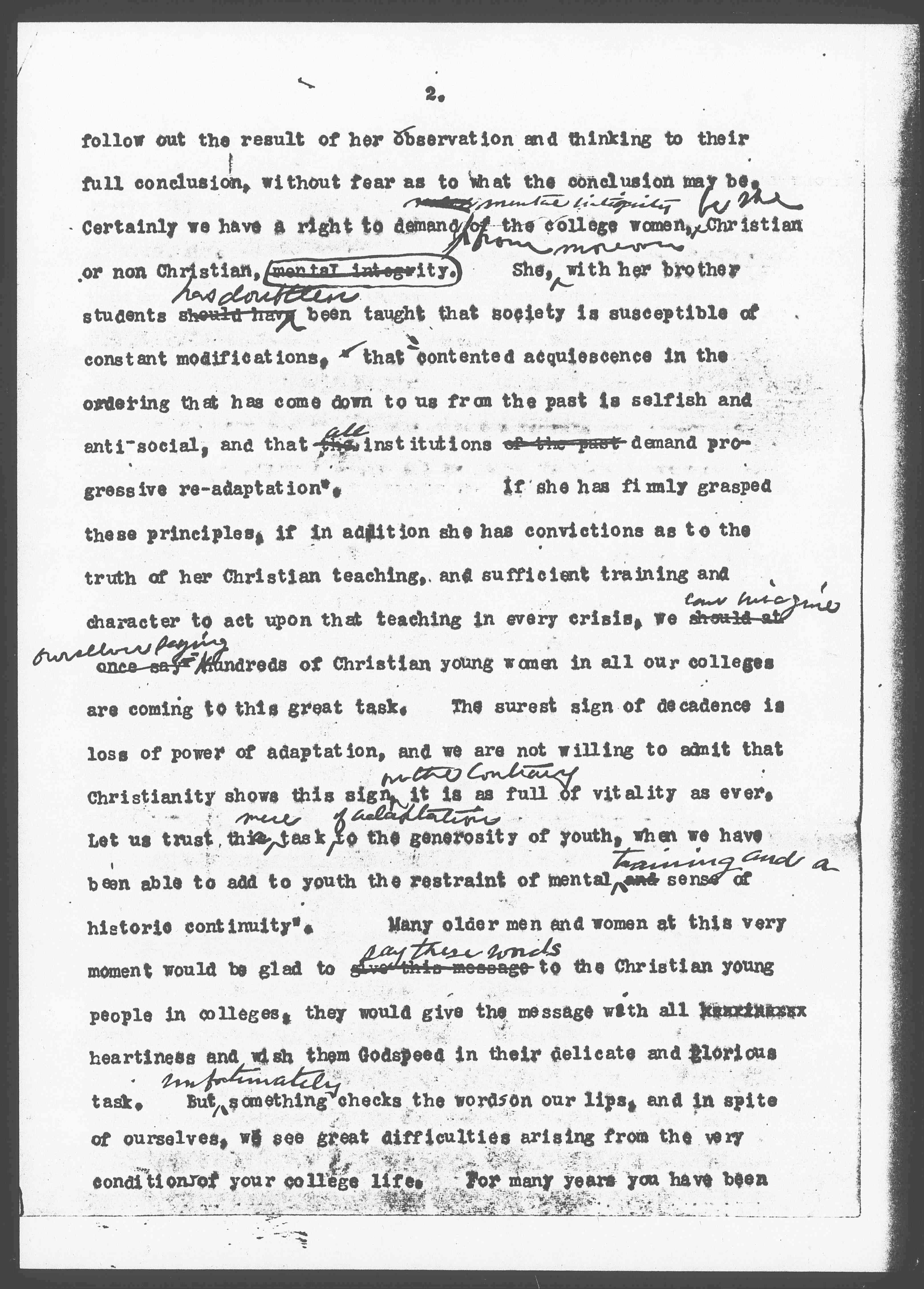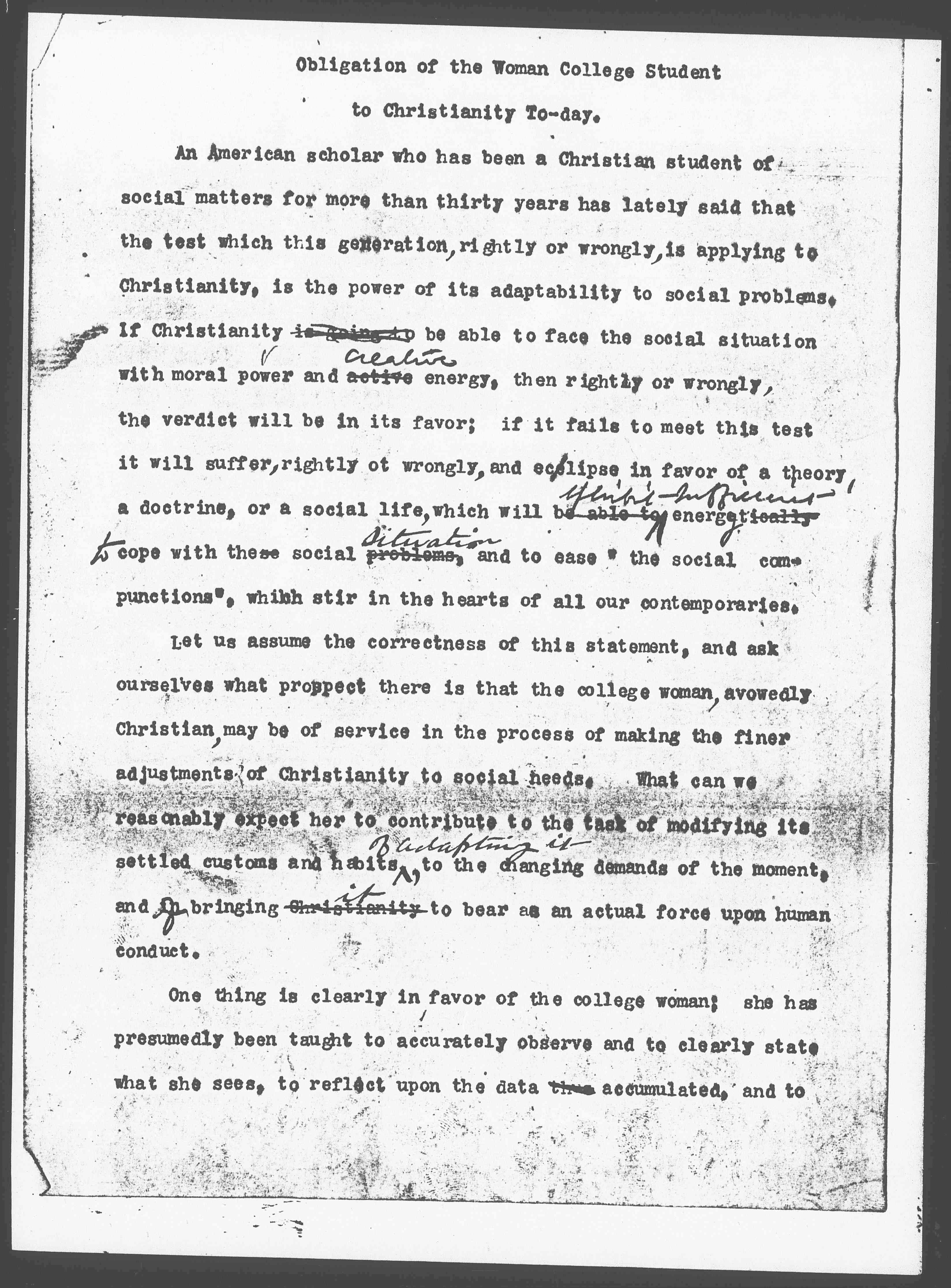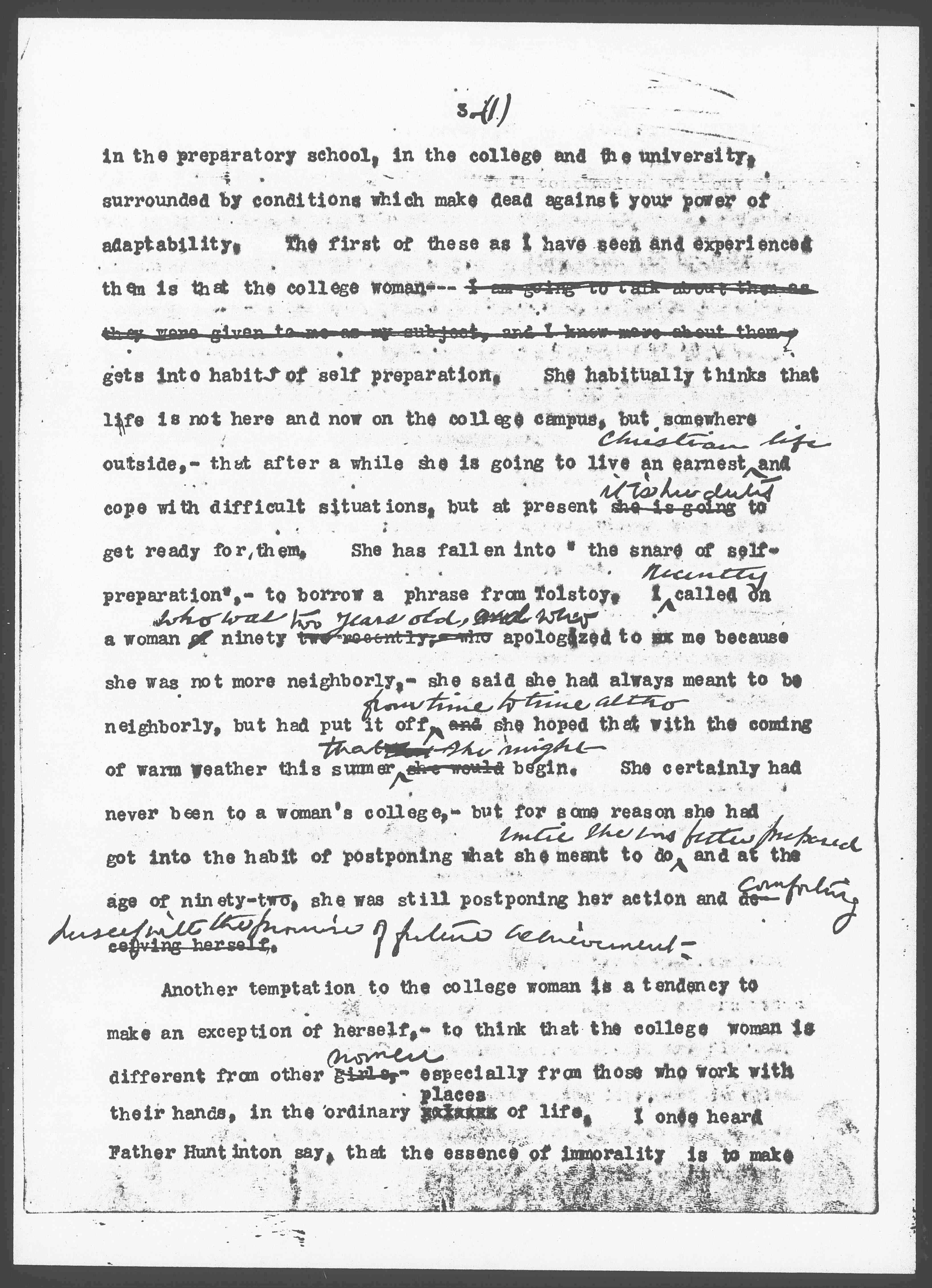 One thing is clearly in favor of the college woman; she has presumably been taught to accurately observe and to clearly state what she sees, to reflect upon the data thus accumulated, and to [page 2] follow out the result of her observation and thinking to their full conclusion, without fear as to what the conclusion may be. Certainly we have a right to demand ↑mental integrity↓ of ↑from↓ the college women, ↑be she↓ Christian or non Christian, mental integrity. She, ↑moreover↓ with her brother students should have ↑has doubtless↓ been taught that society is susceptible of constant modifications, that "contented acquiescence in the ordering that has come down to us from the past is selfish and anti-social, and that the ↑all↓ institutions of the past demand progressive re-adaptation." If she has firmly grasped these principles, if in addition she has convictions as to the truth of her Christian teaching, and sufficient training and character to act upon the teaching in every crisis, we should at once say ↑can imagine ourselves saying↓ "Hundreds of Christian young women in all our colleges are coming to this great task. The surest sign of decadence is loss of power of adaptation, and we are not willing to admit that Christianity shows this sign ↑on the contrary↓ it is as full of vitality as ever. Let us trust this ↑mere↓ task ↑of adaptation↓ to the generosity of youth, when we have been able to add to youth the restraint of mental ↑training and a↓ and sense of historic continuity". Many older men and women at this very moment would be glad to give this message ↑say these words↓ to the Christian young people in the colleges, they would give the message with all heartiness and wish them Godspeed in their delicate and glorious task. But ↑unfortunately↓ something checks the words on our lips, and in spite of ourselves, we see great difficulties arising from the very condition of your college life. For many years you have been [page 3] in the preparatory school, in the college and the university, surrounded by conditions which make dead against your power of adaptability. The first of these as I have seen and experienced them, is that the college woman --- I am going to talk about them as they were given to me as my subject, and I know more about them -- gets into habits of selfpreparation. She habitually thinks that life is not here and now on the college campus, but somewhere outside,– that after a while she is going to live an earnest ↑Christian life↓ and cope with difficult situations, but at present she is going ↑it is her duty↓ to get ready for them. She has fallen into "the snare of self-preparation",- to borrow a phrase from Tolstoy. I ↑recently↓ called on a woman of ↑who was↓ ninety two recently, who ↑two years old, and who↓ apologized to me because she was not neighborly,– she said she had always meant to be neighborly, but had put it off ↑from time to time [although]↓ and she hoped that with the coming of warm weather this summer she would ↑that she might↓ begin. She certainly had never been to a woman's college,– but for some reason she had got into the habit of postponing what she meant to do ↑until she was better prepared↓ and at the age of ninety-two, she was still postponing her action and deceiving herself ↑comforting herself with the promise of future achievement↓.