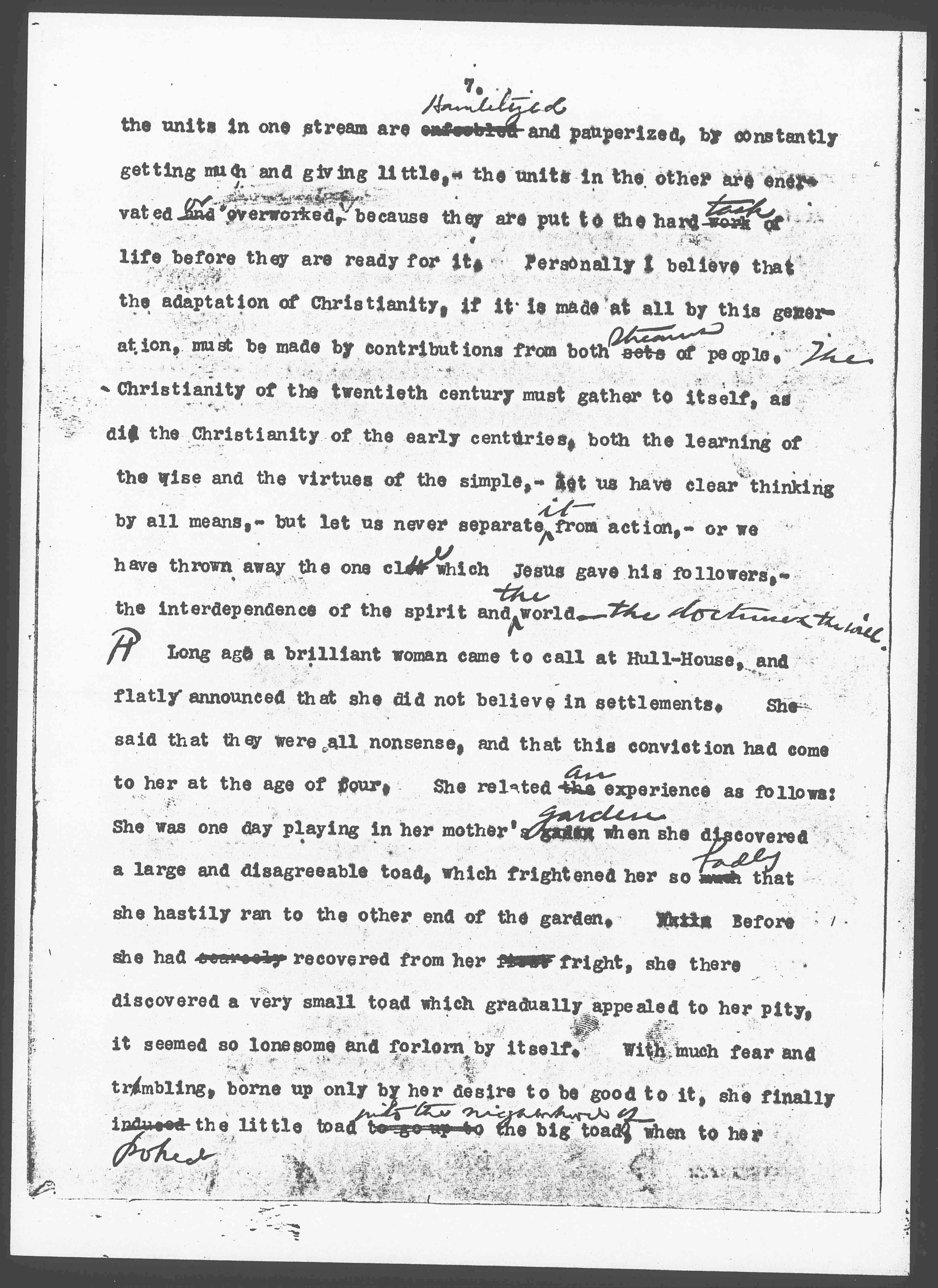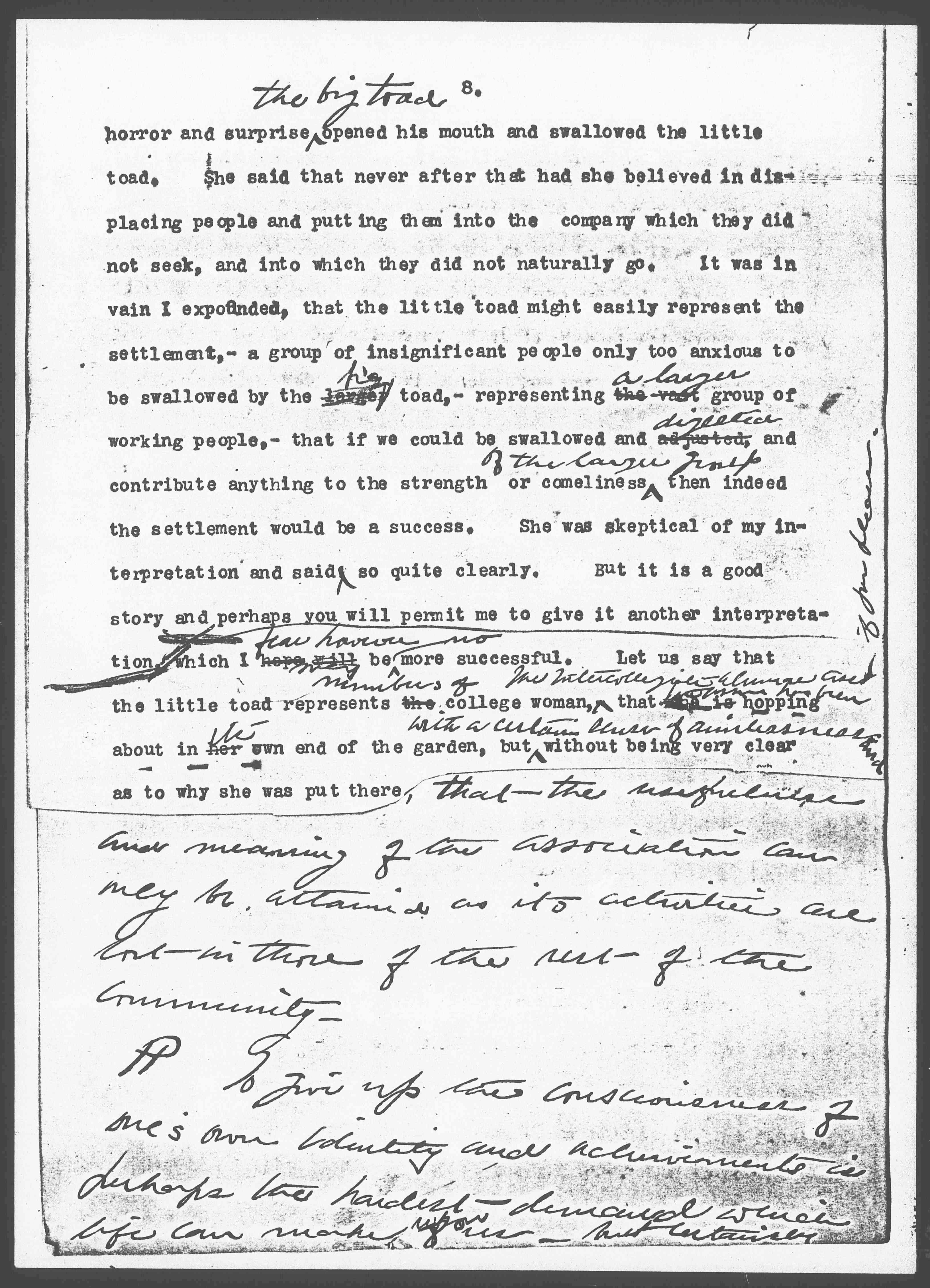 Long ago a brilliant woman came to call at Hull-House, and flatly announced that she did not believe in settlements. She said that they were all nonsense, and that this conviction had come to her at the age of four. She related the ↑an↓ experience as follows: She was one day playing in her mother's garden when she discovered a large and disagreeable toad, which frightened her so much ↑badly↓ that she hastily ran to the other end of the garden. Before she had scarcely recovered from her first fright, she there discovered a very small toad which gradually appealed to her pity, it seemed so lonesome and forlorn by itself. With much fear and trembling, borne up only by her desire to be good to it, she final induced ↑poked↓ the little toad to go up to ↑into the neighborhood of↓ the big toad, when to her [page 9] horror and surprise ↑the big toad↓ opened his mouth and swallowed the little toad. She said that never after that had she believed in displacing people and putting them into the company which they did not seek, and into which they did not naturally go. It was in vain that I expounded, that the little toad might easily represent the settlement,– a group of insignificant people, only too anxious to be swallowed by the larger ↑big↓ toad, -- representing the vast ↑a large↓ group of working people,– that if we could be swallowed and adjusted ↑digested↓, and contribute anything to the strength or comeliness ↑of the larger group↓ then indeed the settlement would be a success. She was skeptical of my interpretation, and said so quite clearly. But it is a good story and perhaps you will permit me to give it another interpretation, which I hope will ↑fear however↓, be ↑no↓ more successful. Let us say that the little toad represents the ↑members of↓ college women, ↑the Intercollegiate Alumnae [Association] if you please↓ that she is ↑[Association has been] hopping about in her ↑its↓ own end of the garden, but ↑with a certain sense of aimlessness and↓ without being very clear as to why it was put there, ↑that the usefullness and meaning of the Association can may be attained as its activities are lost in those of the rest of the community.