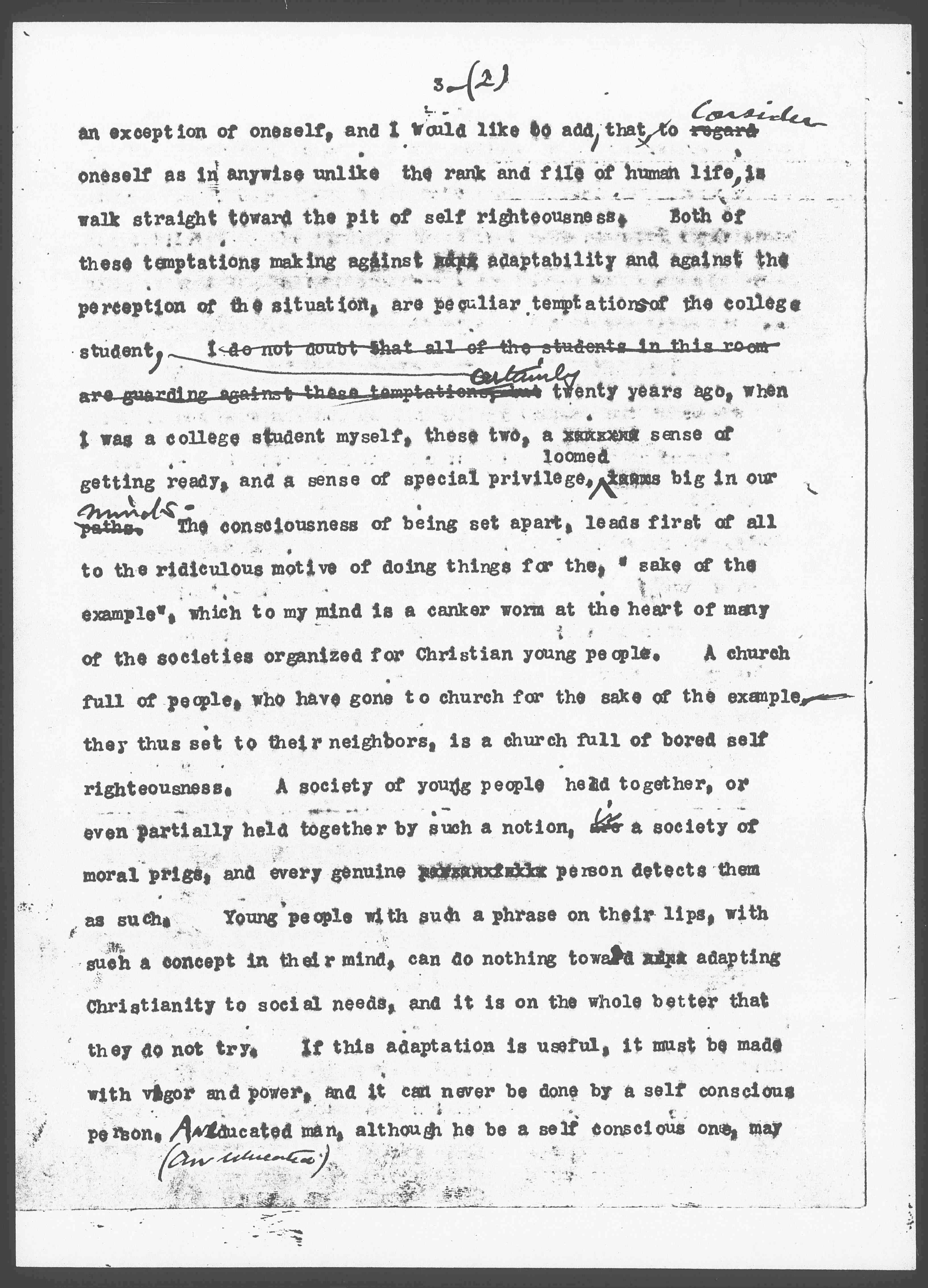 Another temptation to the college woman is a tendency to make an exception of herself,– to think that the college woman is different from other girls ↑women↓, especially from those who work with their hands, in the ordinary places of life. I once heard Father Huntington say, that the essence of immortality is to make [page 4] an exception of oneself, and I would like to add, that to regard ↑consider↓ oneself as in anywise unlike the rank and file of human life is walk straight toward the pit of self righteousness. Both of these temptations making against adaptability and against the perception of the situation, are peculiar temptations to the college student, I do not doubt that all of the students in this room are guarding against these temptations. ↑Certainly↓ twenty years ago, when I was a college student myself, these two, a sense of getting ready, and a sense of special privilege loomed big in our paths ↑minds↓. The consciousness of being set apart, leads first of all to the ridiculous motive of doing things for the, "sake of example", which to my mind is a canker worm at the heart of many of the societies organized for Christian young people. A church full of people, who have gone to the church for the sake of the example they thus set to their neighbors, is a church full of bored self righteousness. A society of young people held together, or even partially held together by such a notion, are ↑is↓ a society of moral prigs, and every genuine person detects them as such. Young people with such a phrase on their lips, with such a concept in their mind, can do nothing toward adapting Christianity to social needs, and it is on the whole better that they do not try. If this adaptation is useful, it must be made with vigor and power, and it can never be done by a self conscious person. ↑An↓ educated man, although he be a self conscious one, may [page 5] perform certain services for the community, but he cannot perform this particular service of adaptation.