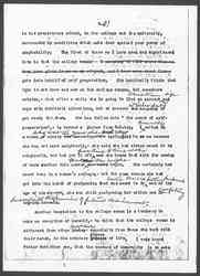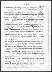 A third danger inherent [in] college life, is that study too long continued without independent and virile action, tends to produce irresolute and timid people. The modern world has come to believe that progress comes through variation, taking place now and again in individuals differing from the type, until finally a variation persists and makes a distinct modification. It is difficult to see how this process can be carried on in society unless each individual who exhibits the variation, clearly states his difference and is ready to act upon it,– to be thrown out if his difference if not valuable, to find himself surrounded by an unconscious following, if his difference is genuine. The consciousness of having reflected seriously on important questions, until our conclusions inspire our conduct, augments [our?] dignity and gives a certain coherence to character, but this ↑coherence can never be obtained and this↓ variation can never be ↑made↓ valuable, through an timid ↑irresolute↓ person. The individual who differs from the type is always a subject of hostility to those who have held to this type. If you urge that the Wednesday evening prayer meeting should be given up for the simple reason that people don't want to come to it, and that it answers no genuine need, you will be surprised by the amount of hostility you invoke. You will be amazed at the opposition from people who have not been attending the meetings themselves for years, but [page 6] who think that "the meeting should be kept up". They fail to ↑It lies with you to make them↓ see that a meeting filled with vigor and power would be willing to meet ↑might be held↓ on every evening of the week, or on all of them,– that it would change its ↑the↓ night ↑might be changed↓, as imperceptibly as the new sap within the plant shoves of the old sheath as of no further use.