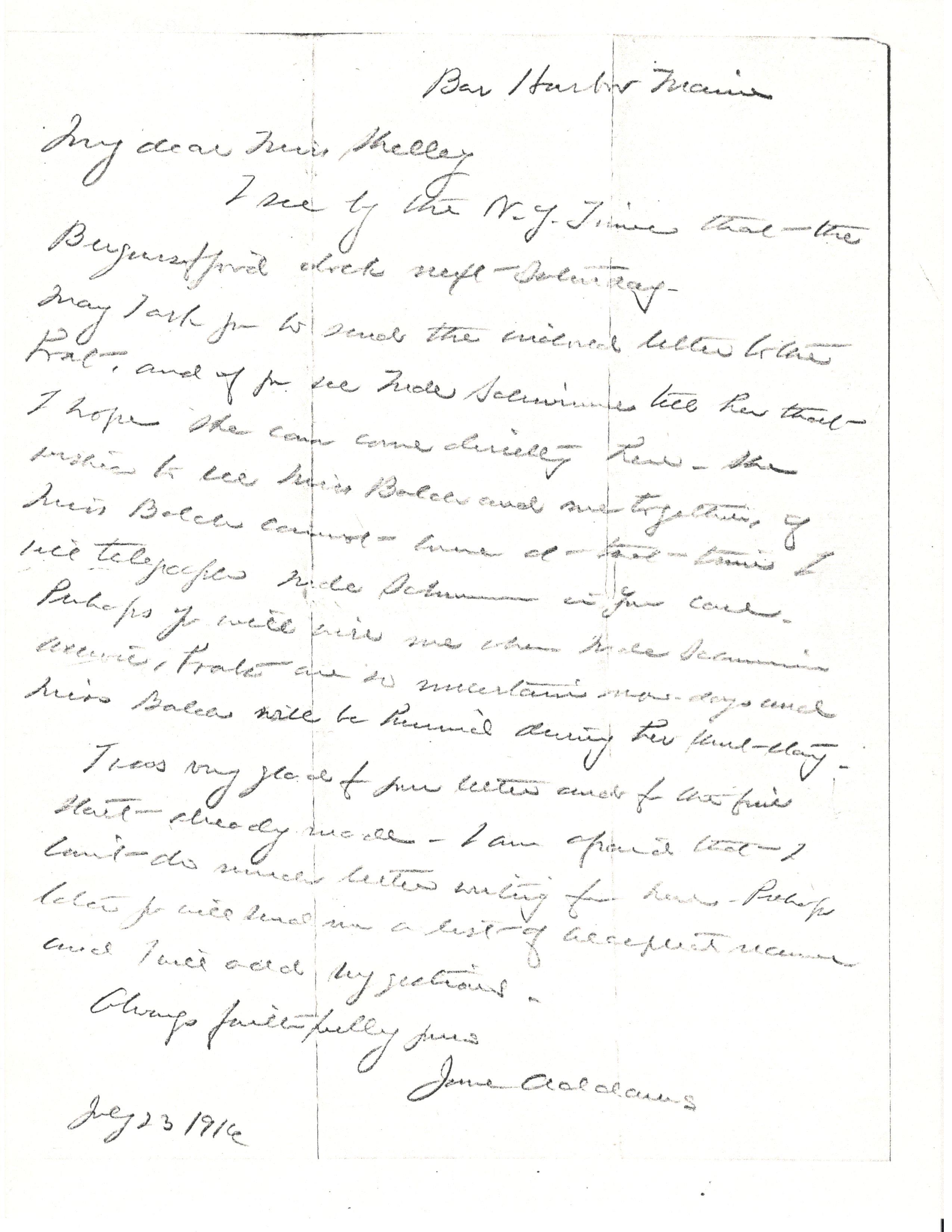 May I ask you to send the [enclosed] letter to the boat, and if you see Mde Schwimmer tell her that I hope she can come directly here. She wishes to see Miss Balch and me together, if Miss Balch cannot come at that time I will telegraph Mde Schwimmer in your care. Perhaps you will wire me when Mde Schwimmer arrives, boats are so uncertain now-days and Miss Balch will be hurried during her short stay.