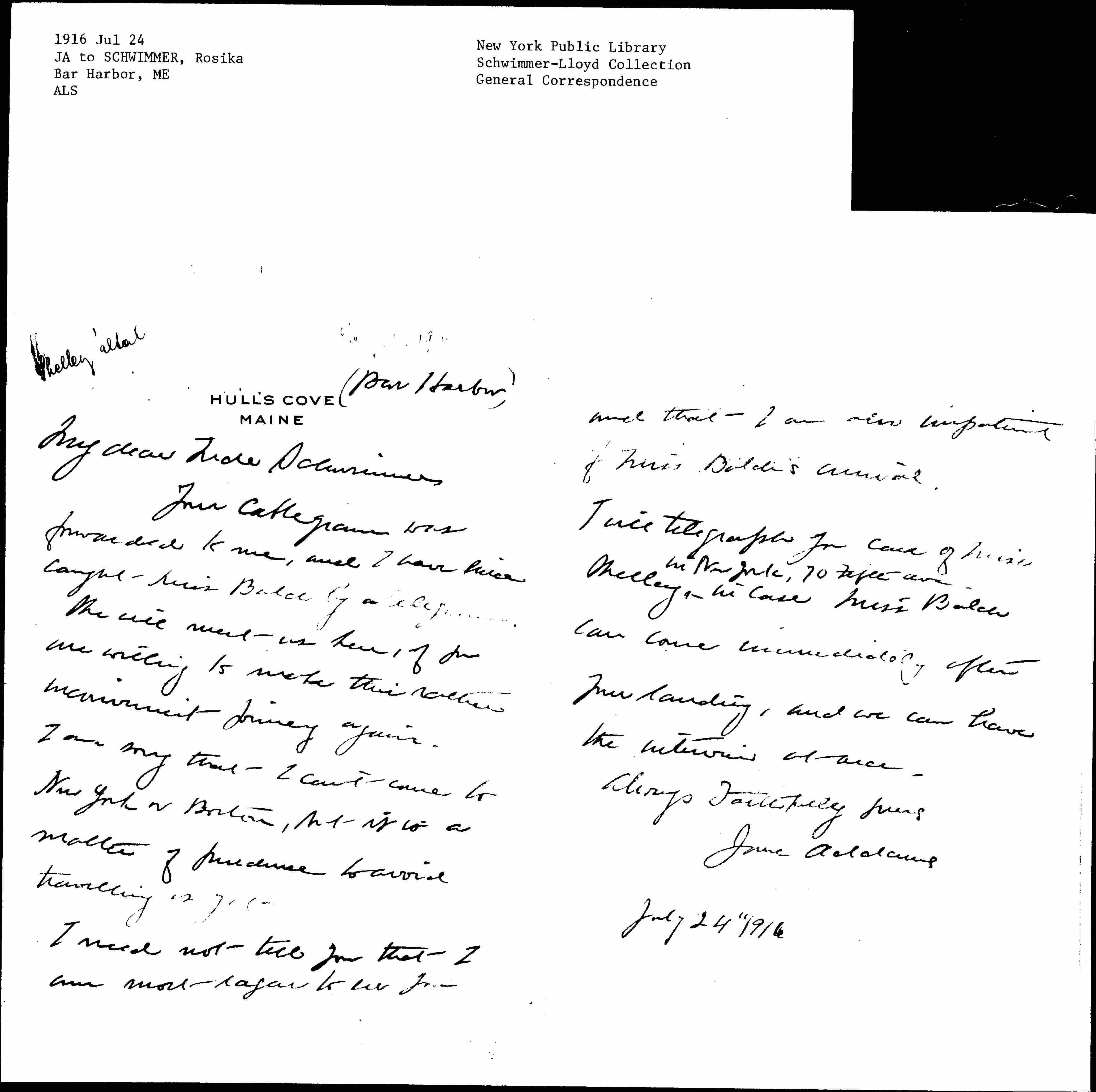 I will telegraph you care of Miss Shelley <in New York, 70 Fifth Ave.> in case Miss Balch can come immediately after your landing, and we can have the interview at once.