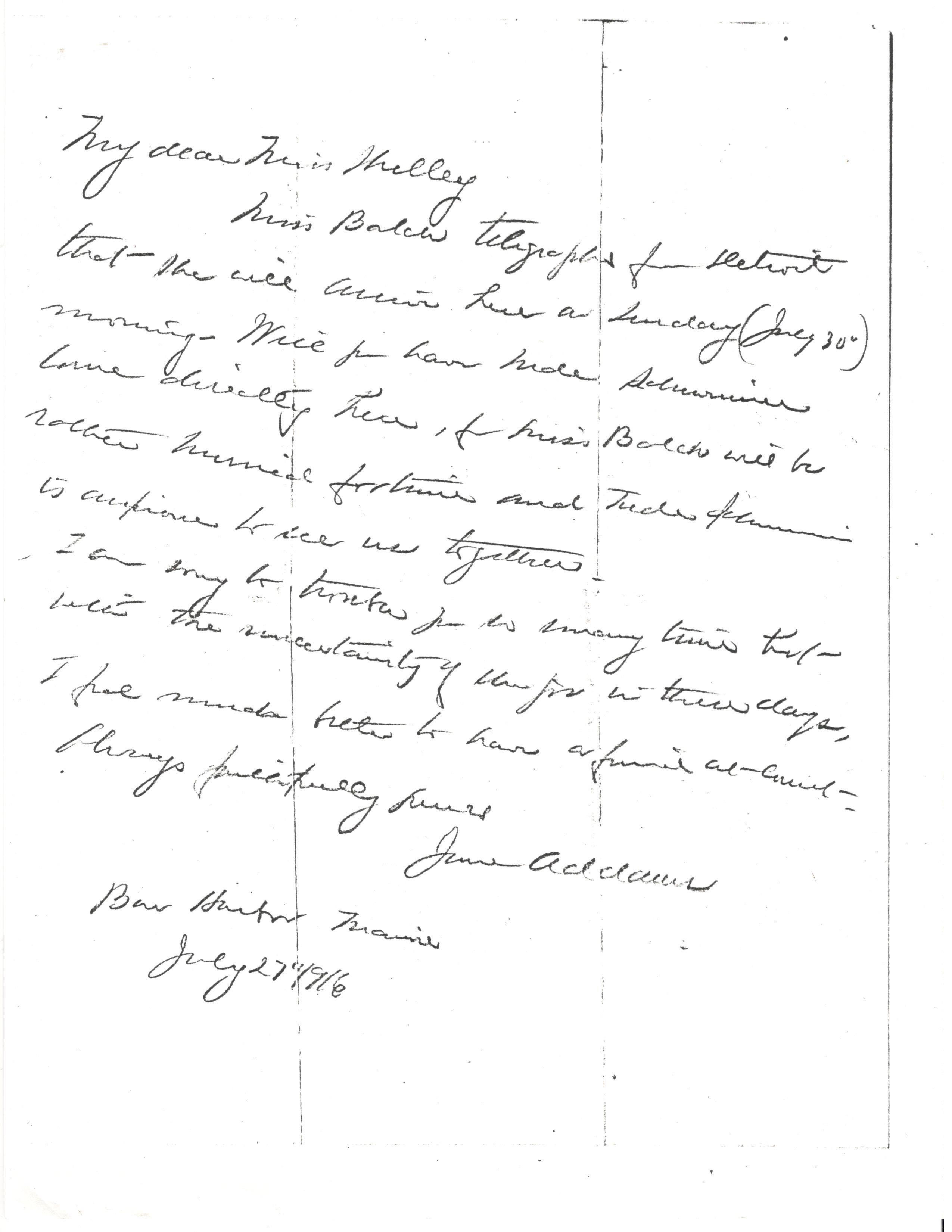 Miss Balch telegraphs from Detroit that she will arrive here on Sunday (July 30") morning. Will you have Mde Schwimmer come directly here, for Miss Balch will be rather hurried for time and Mde Schwimmer is anxious to see us together.