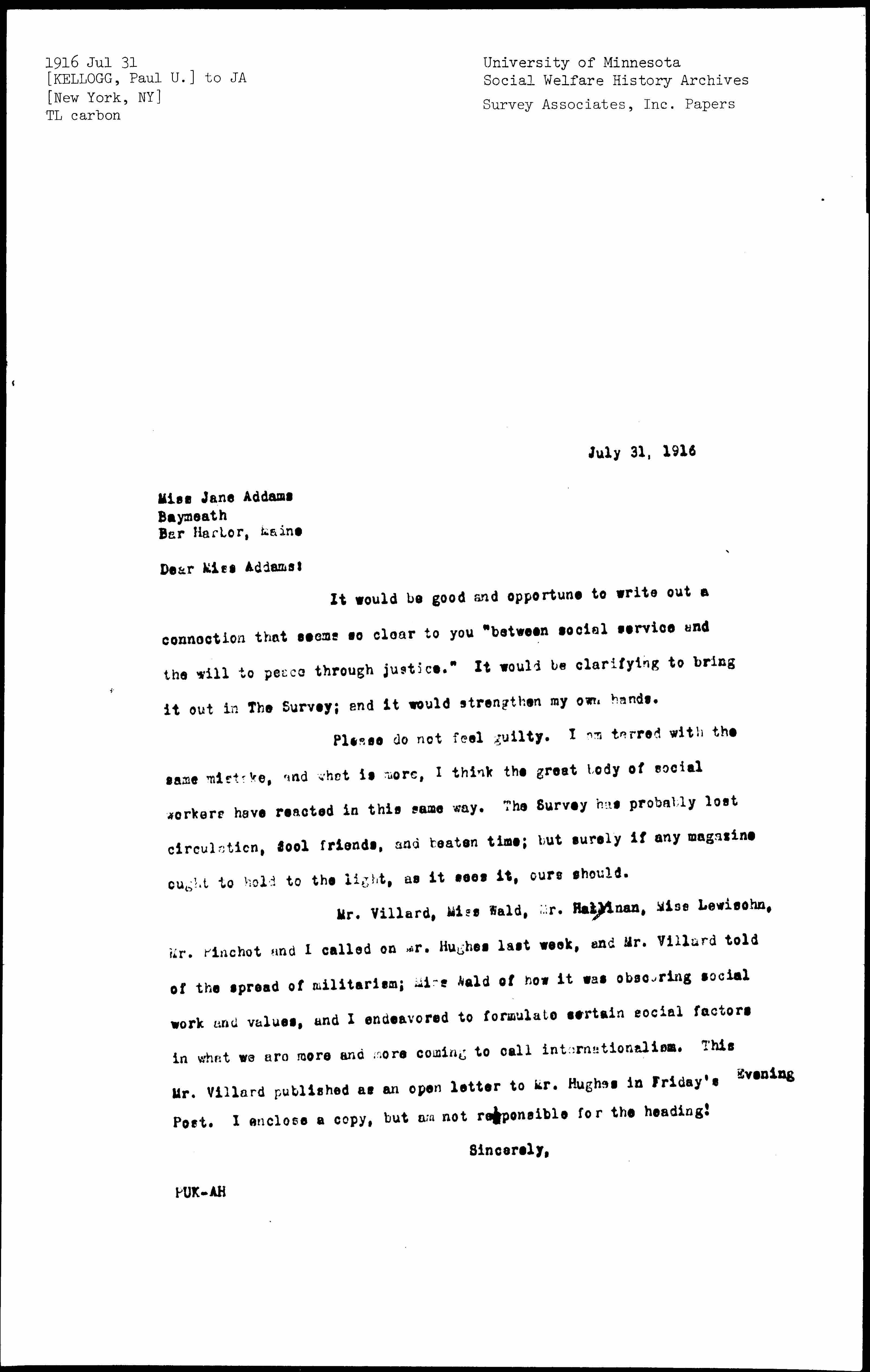 Mr. Villard, Miss Wald, Mr. Hallinan, Miss Lewisohn, Mr. Pinchot and I called on Mr. Hughes last week, and Mr. Villard told of the spread of militarism; Miss Wald of how it was obscuring social work and values, and I endeavored to formulate certain social factors in what we are more and more coming to call internationalism. This Mr. Villard published as an open letter to Mr. Hughes in Friday's Evening Post. I enclose a copy, but am not responsible for the heading!