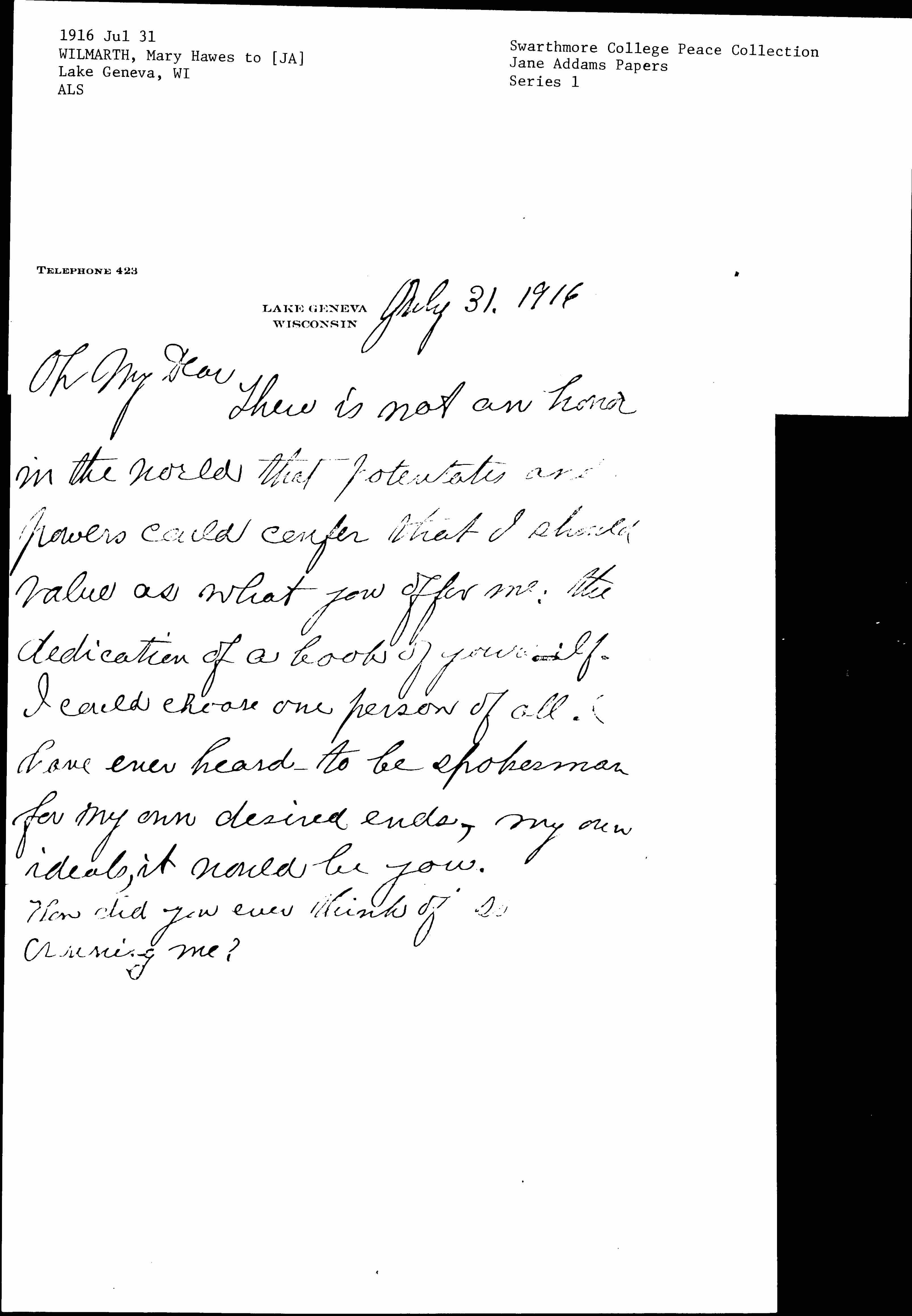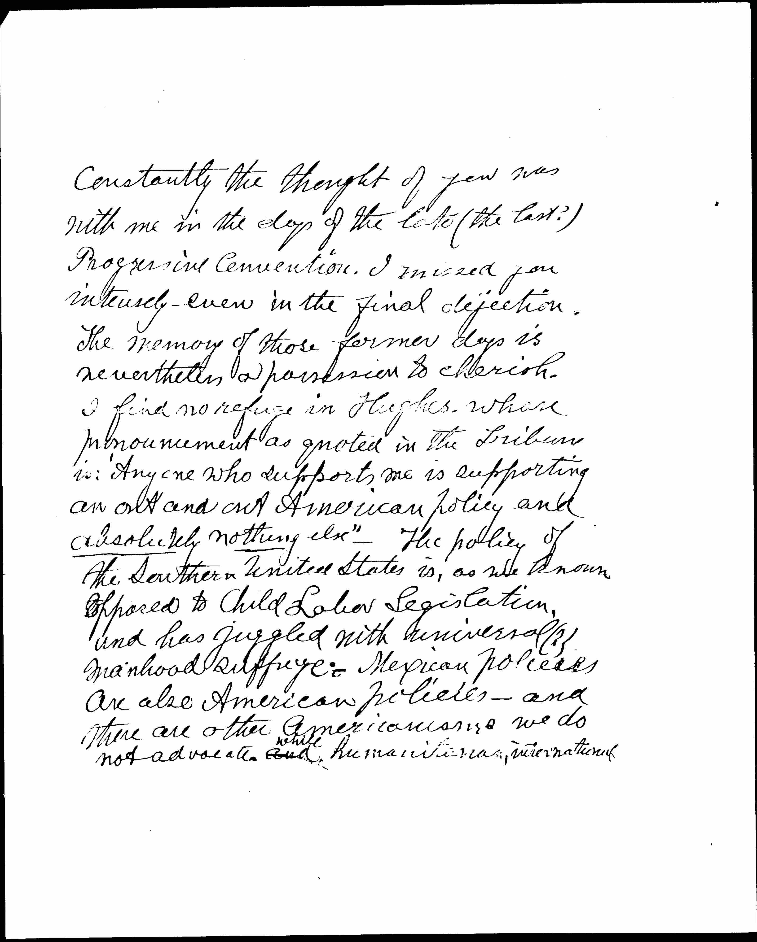 Constantly the thought of you was with me in the days of the late (the last?) Progressive Convention. I missed you intensely -- even in the final dejection. The memory of those former days is nevertheless a possession to cherish. I find no refuge in Hughes, whose pronouncement as quoted in the Tribune is: "Anyone who supports me is supporting an out and out American policy and absolutely nothing else" -- The policy of the Southern United States is, as we known opposed to Child Labor Legislation, and has juggled with universal (?) manhood suffrage -- Mexican policies are also American policies -- and there are other Americanisms we do not advocate and <while> humanitarian, international [page 3] -isms we want supported <are> not yet included in Americanism. I shall ask McClurgs to send to your address at a book on: