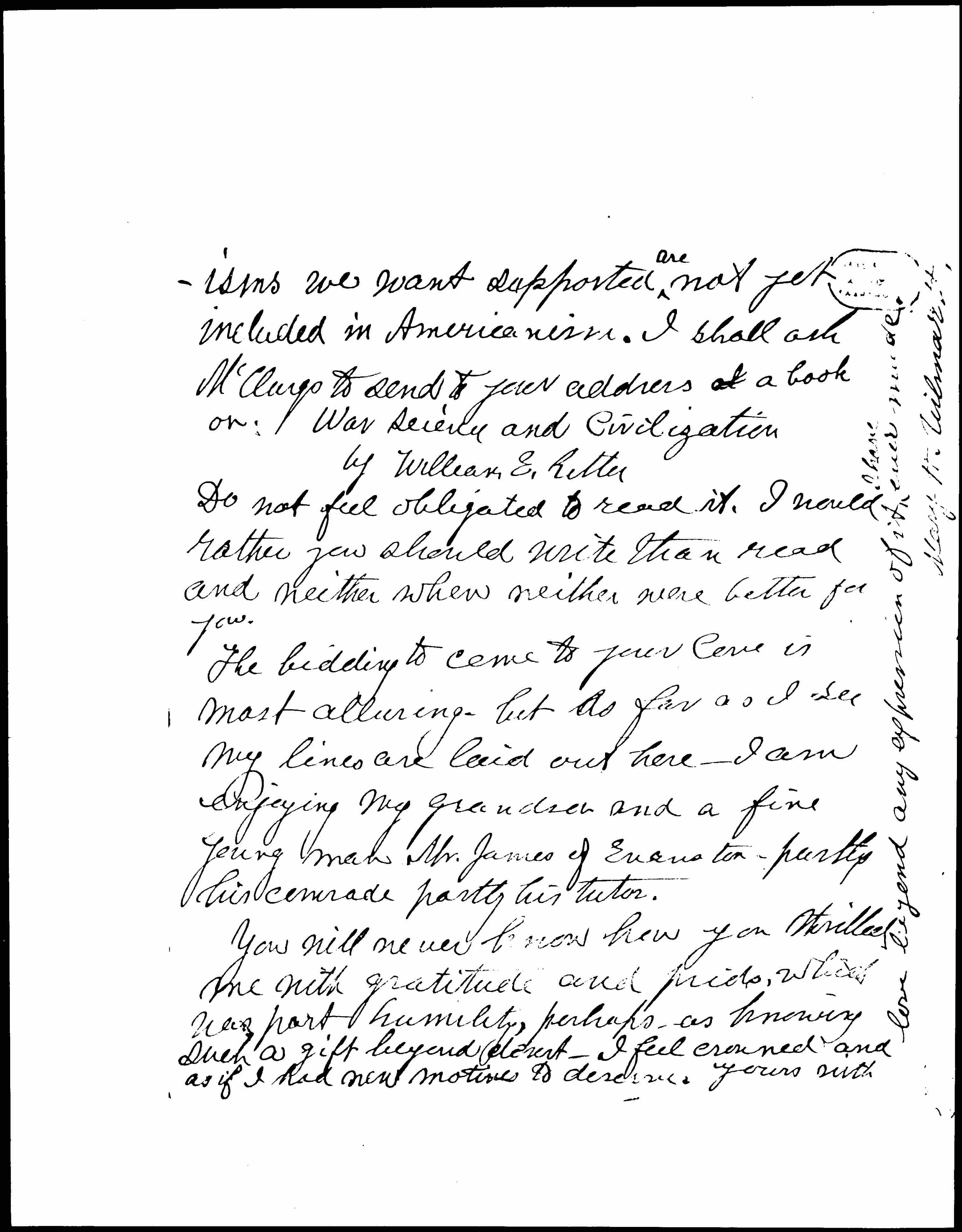 The bidding to come to your Cove is most alluring -- but as far as I see my lines are laid out here -- I am enjoying my grandson and a fine young man Mr. James of Evanston -- partly his comrade partly his tutor.