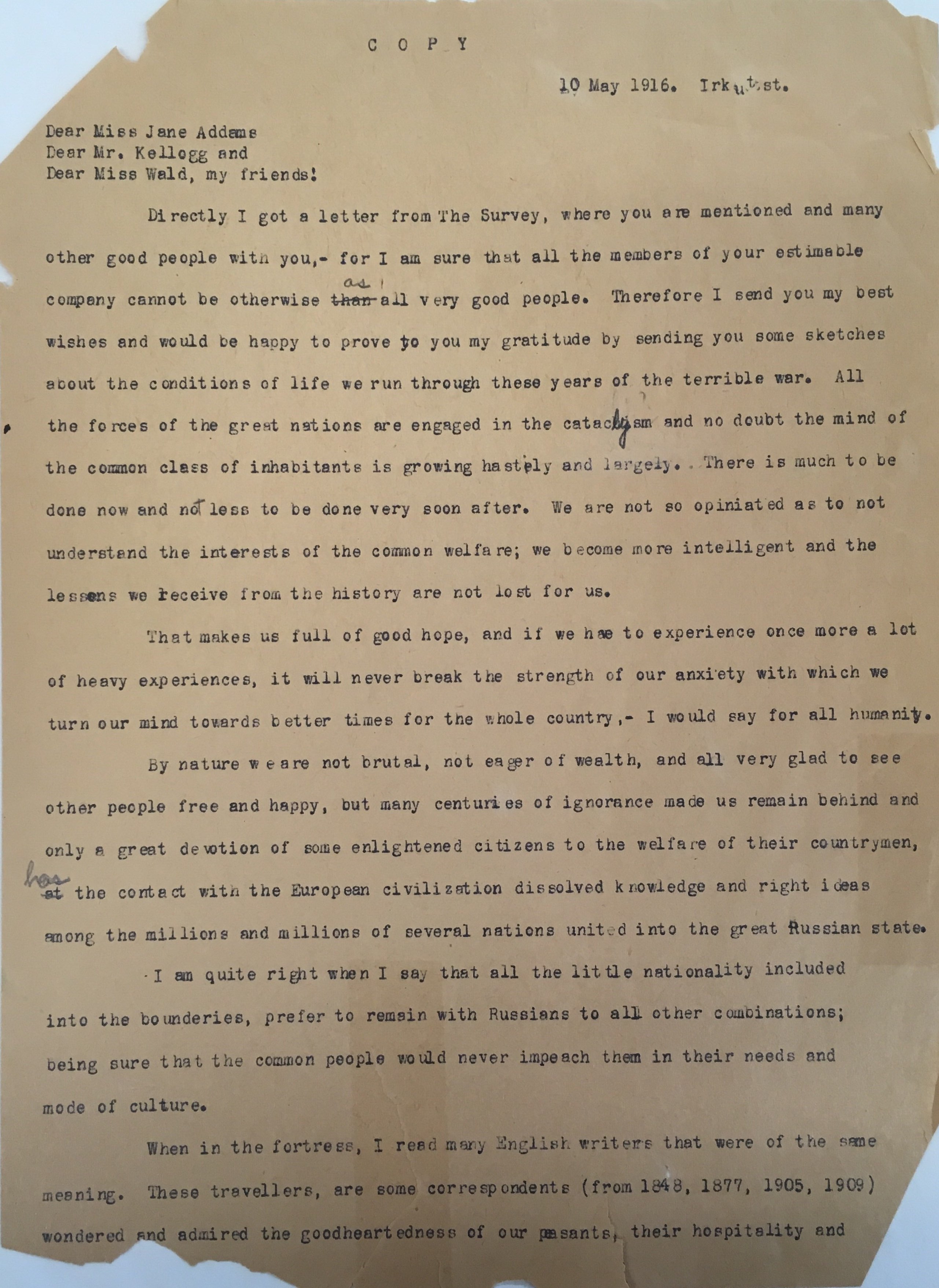 Directly I got a letter from The Survey, where you are mentioned and many other good people with you, -- for I am sure that all the members of your estimable company cannot be otherwise than ↑as↓ all very good people. Therefore I send you my best wishes and would be happy to prove to you my gratitude by sending you some sketches about the conditions of life we run through these years of the terrible war. All the forces of the great nations are engaged in the cataclysm and no doubt the mind of the common class of inhabitants is growing hastily and largely. There is much to be done now and not less to be done very soon after. We are not so [opinionated] as to not understand the interests of the common welfare; we become more intelligent and the lessons we receive from the history are not lost for us.