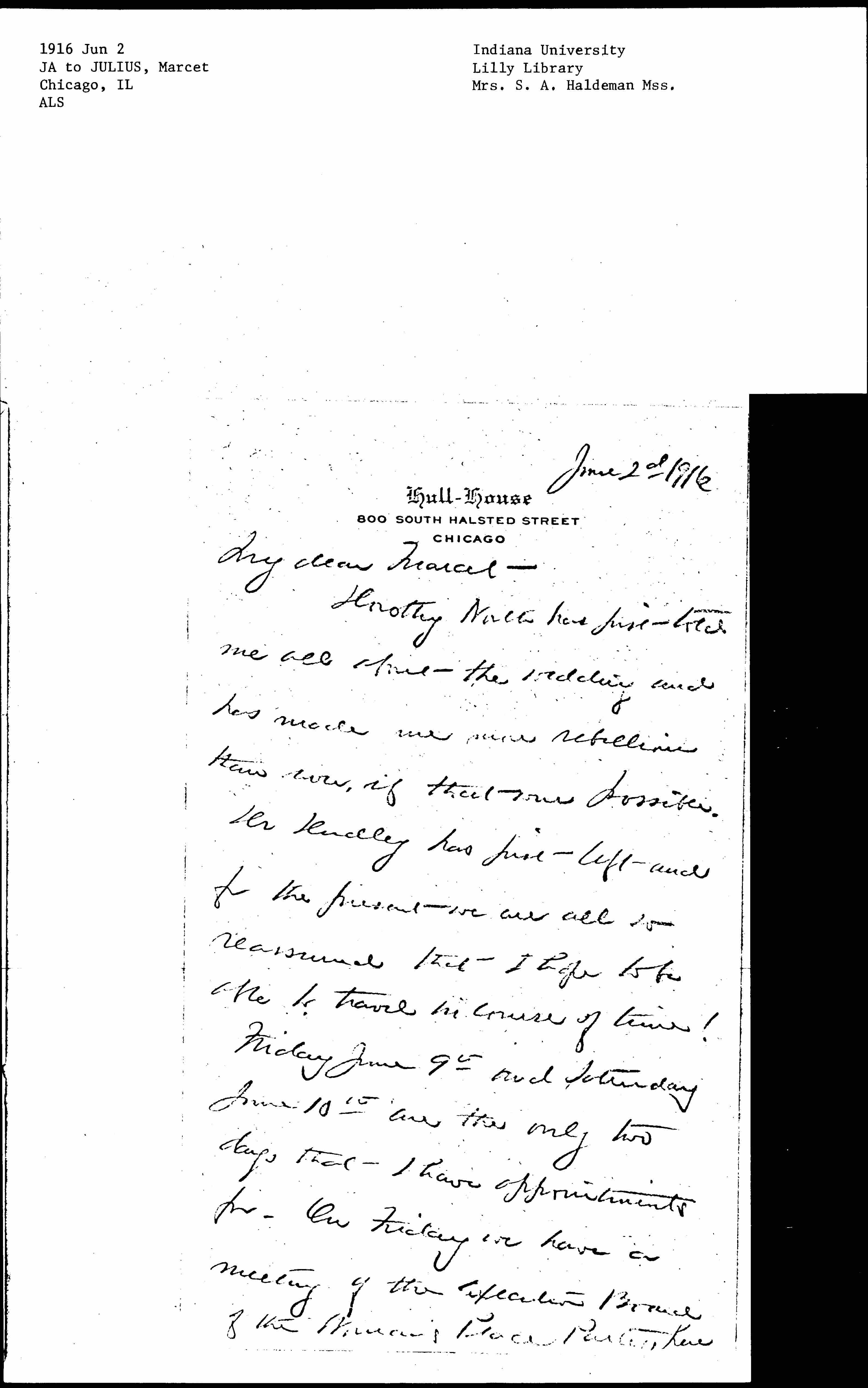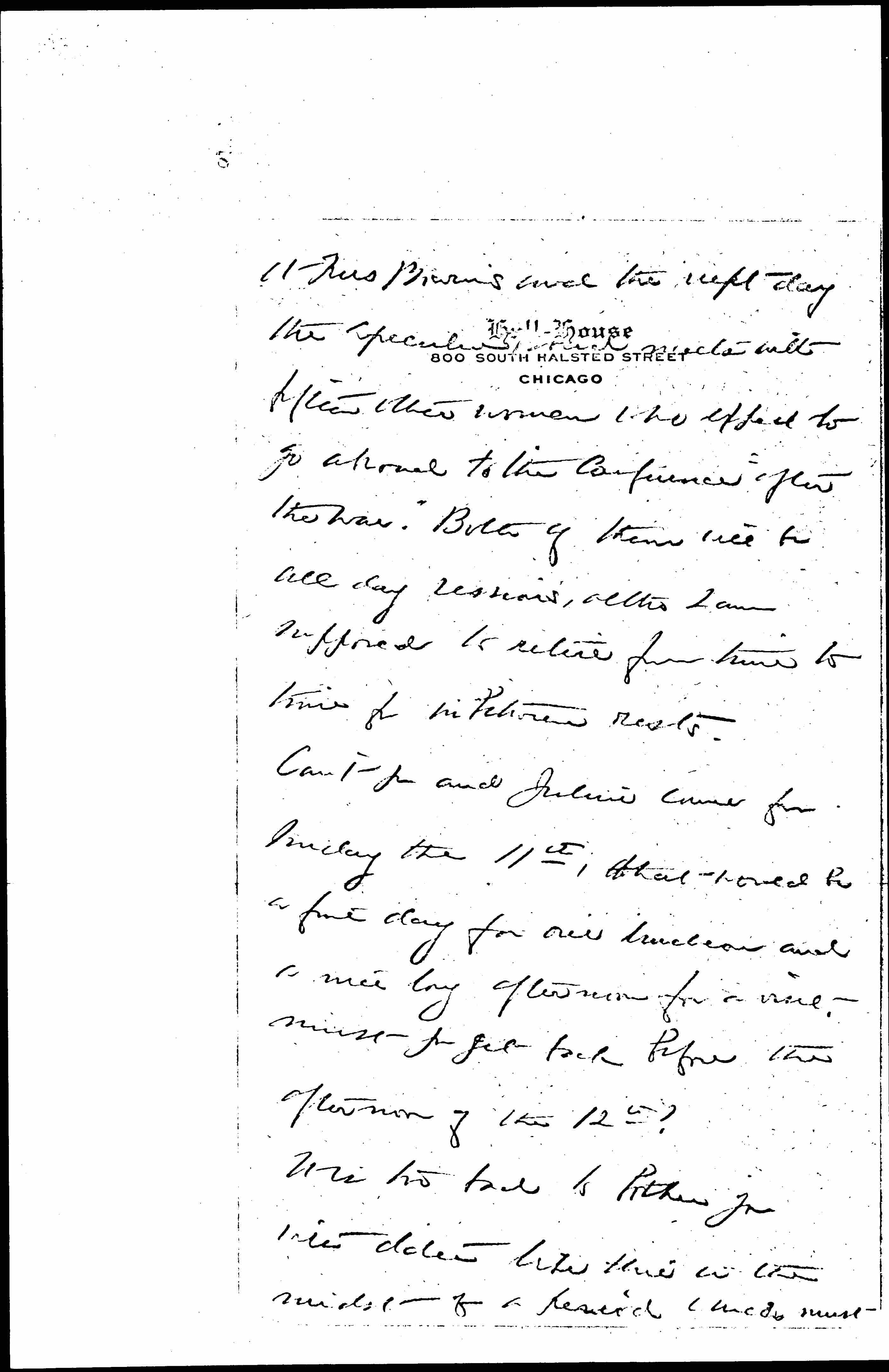 Friday June 9th and Saturday June 10th are the only two days that I have appointments for. On Friday we have a meeting of the Executive Board of the Woman's Peace Party here [page 2] at Mrs Bowen's and the next day the Executive Board meets with fifteen other women who expect to go abroad to the Conference "after the war." Both of them will be all day sessions, [although] I am supposed to retire from time to time for in between rests.