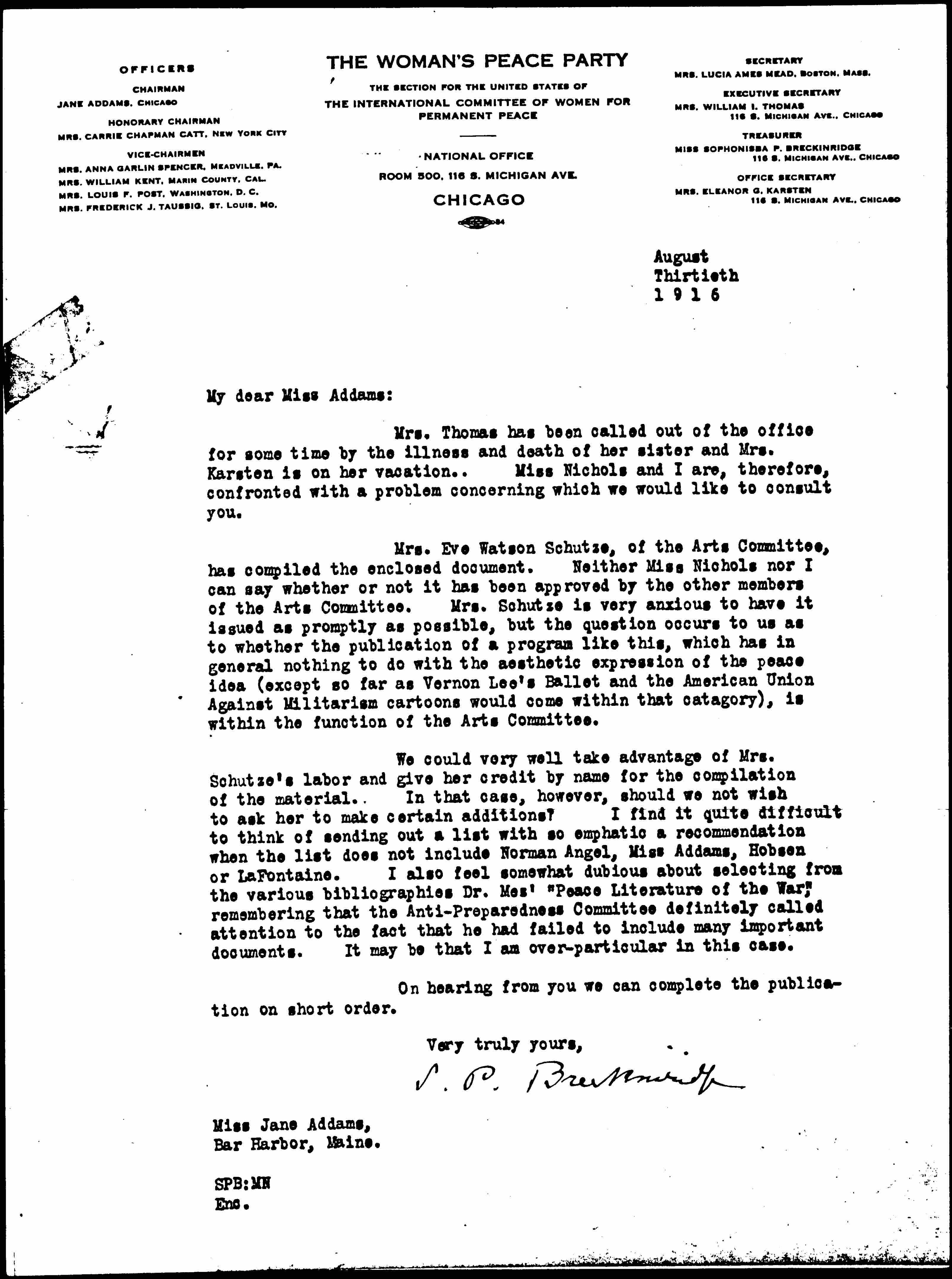 Mrs. [Eva] Watson Schutze, of the Arts Committee, has compiled the enclosed document. Neither Miss Nichols nor I can say whether or not it has been approved by the other members of the Arts Committee. Mrs. Schutze is very anxious to have it issued as promptly as possible, but the question occurs to us as to whether the publication of a program like this, which has in general nothing to do with the aesthetic expression of the peace idea (except so far as Vernon Lee's Ballet and the American Union Against Militarism cartoons would come within that category), is within the function of the Arts Committee.
