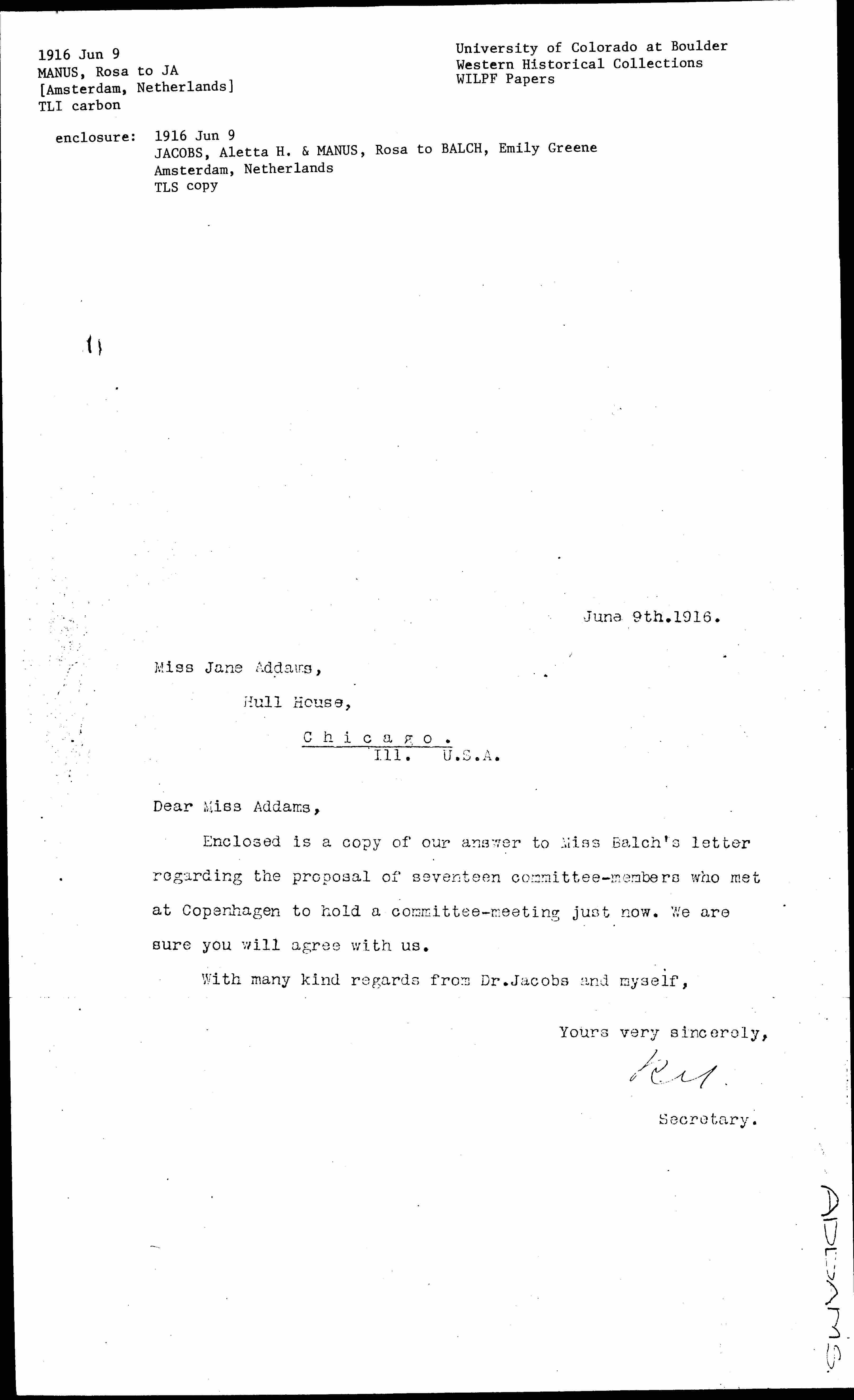 Enclosed is a copy of our answer to Miss Balch's letter regarding the proposal of seventeen committee-members who met at Copenhagen to hold a committee-meeting just now. We are sure you will agree with us.