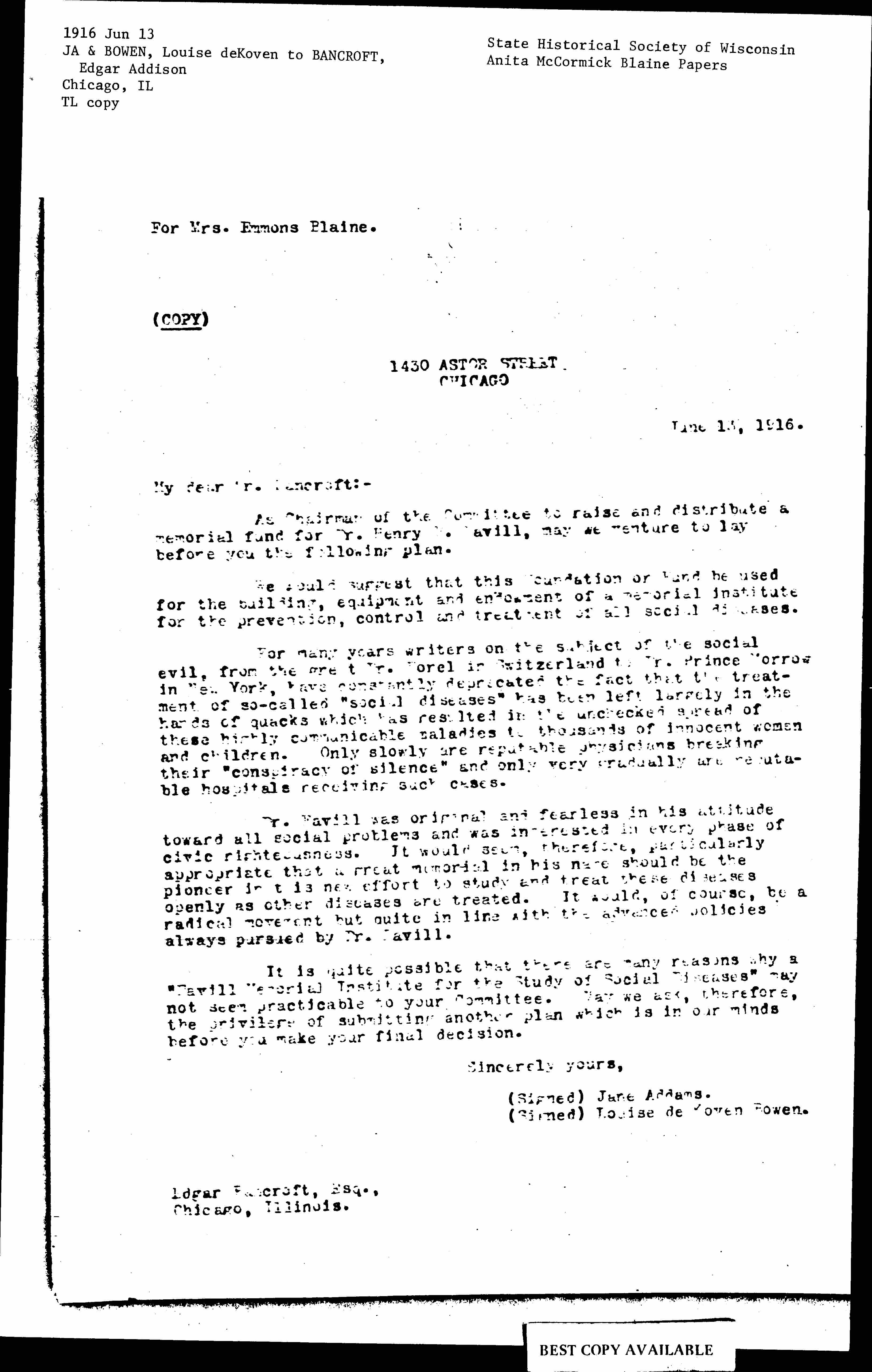 It is quite possible that there are many reasons why a "Favill Memorial Institute for the Study of Social Diseases" may not seem practicable to your Committee. May we ask, therefore, the privilege of submitting another plan which is in our minds before you make your final decision.