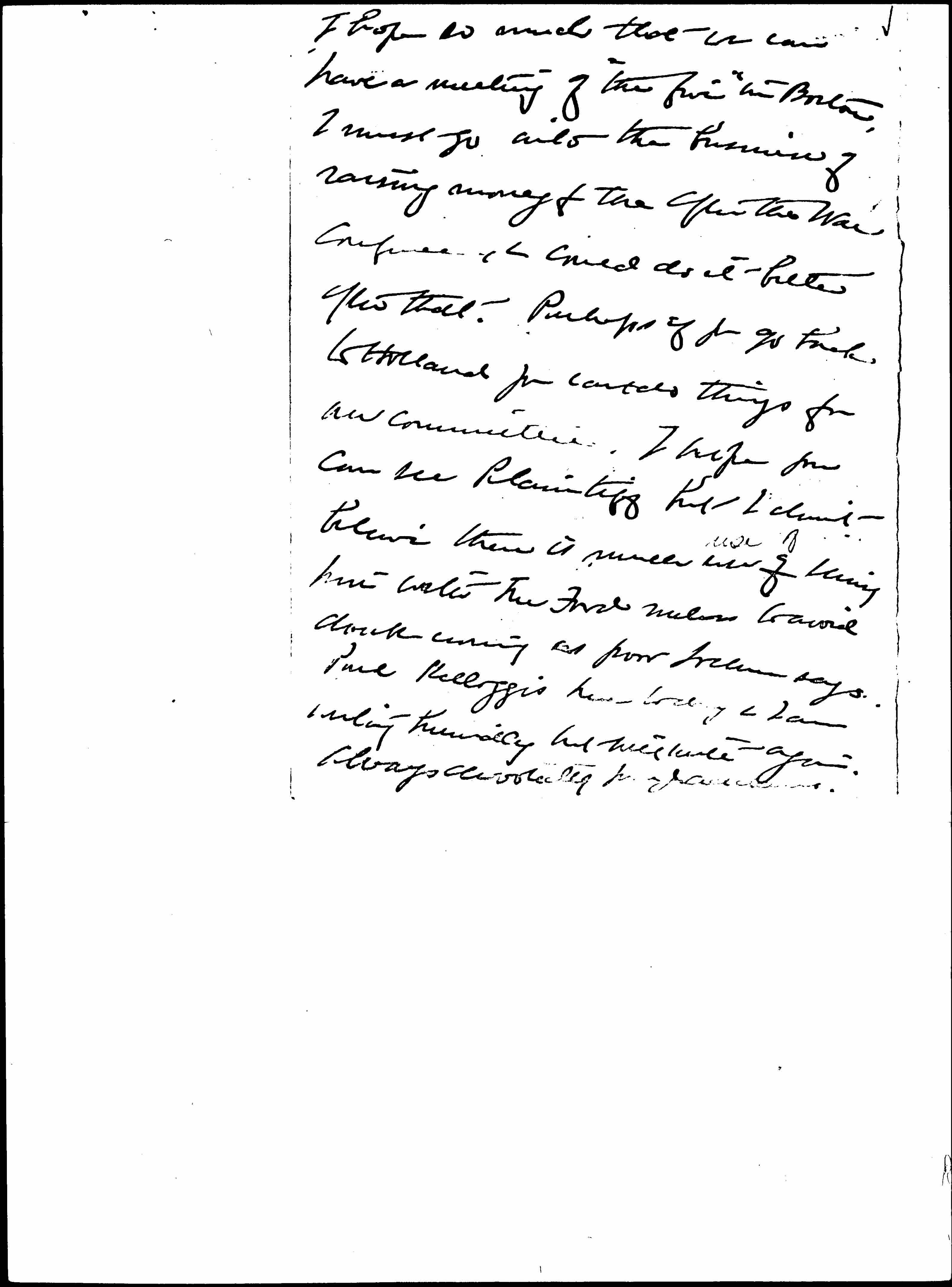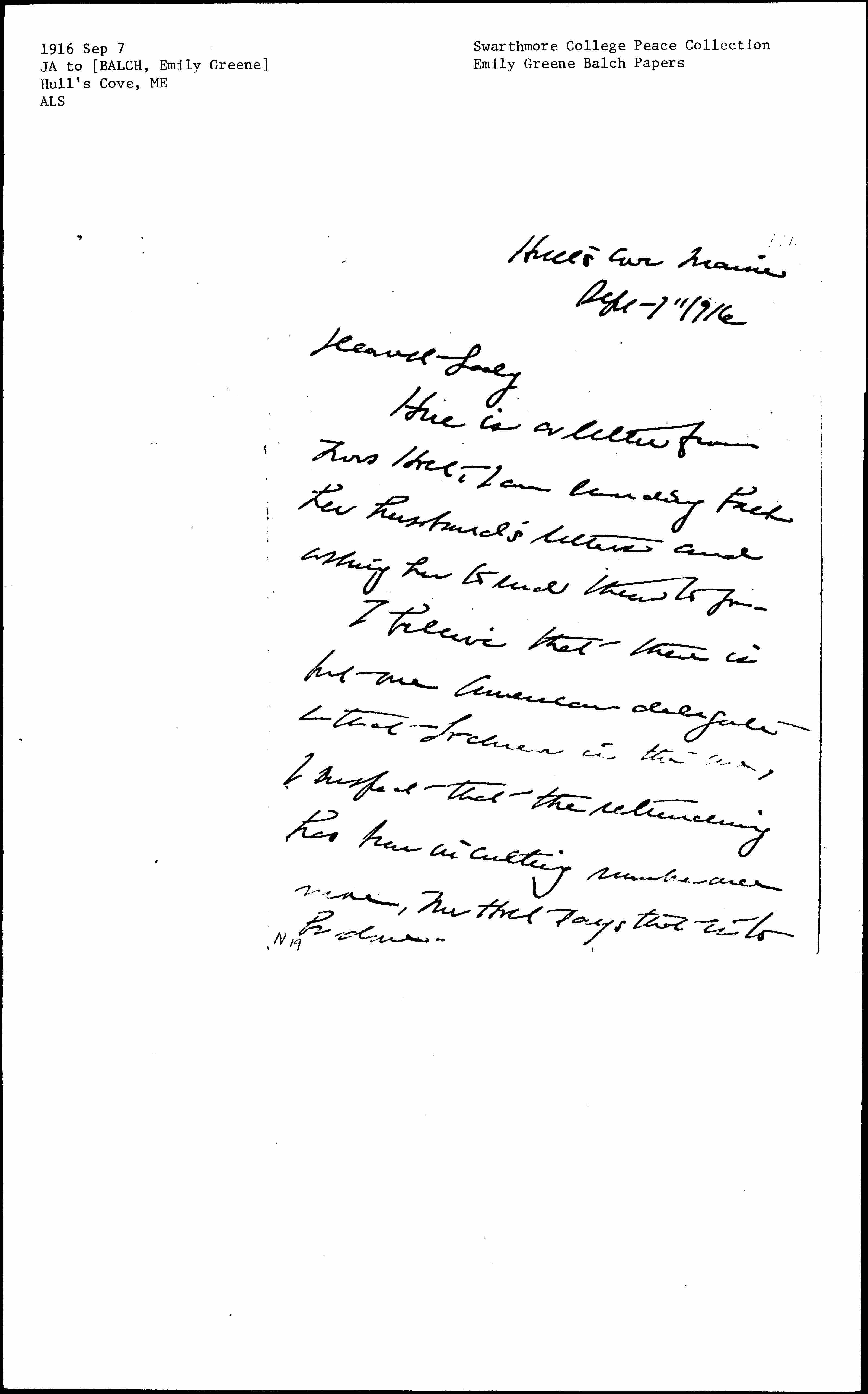 I hope so much that we can have a meeting of "the five" in Boston, I must go into the business of raising money for the After the War Conference & could do it better after that. Perhaps if you go back to Holland you can do things for our committee. I hope you can see [Plantiff] but I don't believe there is much use of seeing him with Mr Ford unless to avoid [double crossing] as poor Lochner says. Paul Kellogg is here today & I am writing hurriedly but will write again.