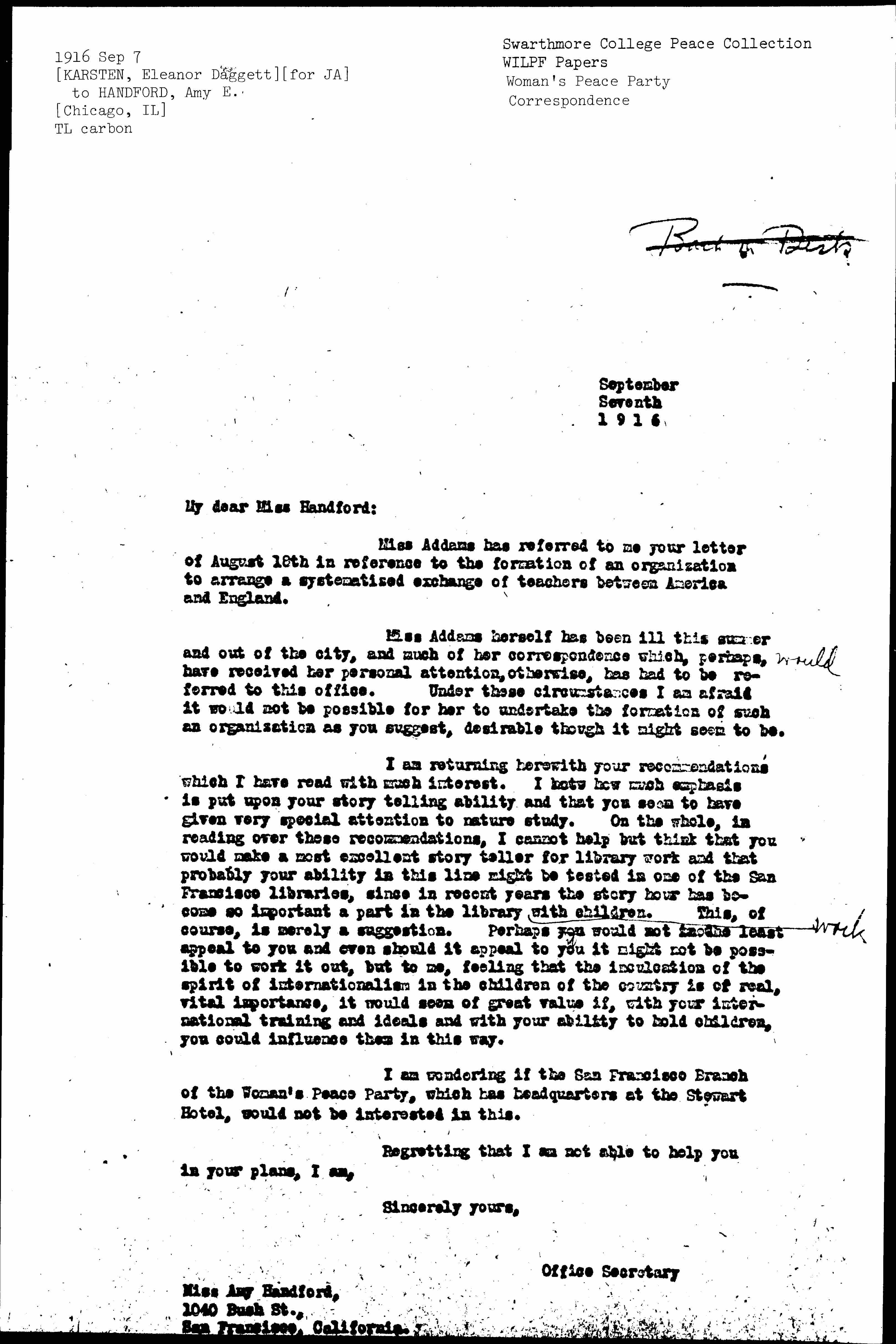 Miss Addams herself has been ill this summer and out of the city, and much of her correspondence which, perhaps, <would> have received her personal attention, otherwise, has had to be referred to this office. Under these circumstances I am afraid it would not be possible for her to undertake the formation of such an organization as you suggest, desirable though it might seem to be.