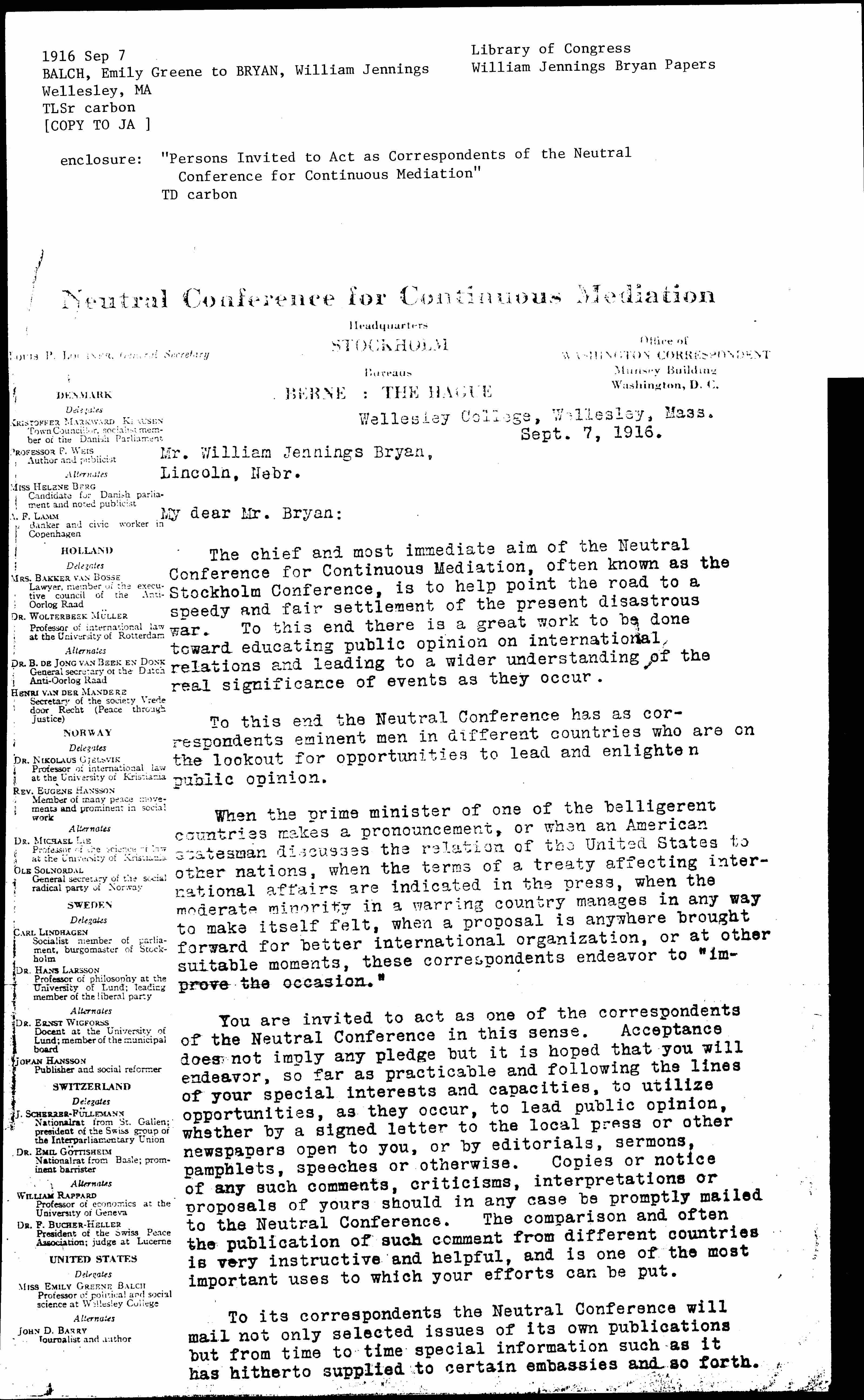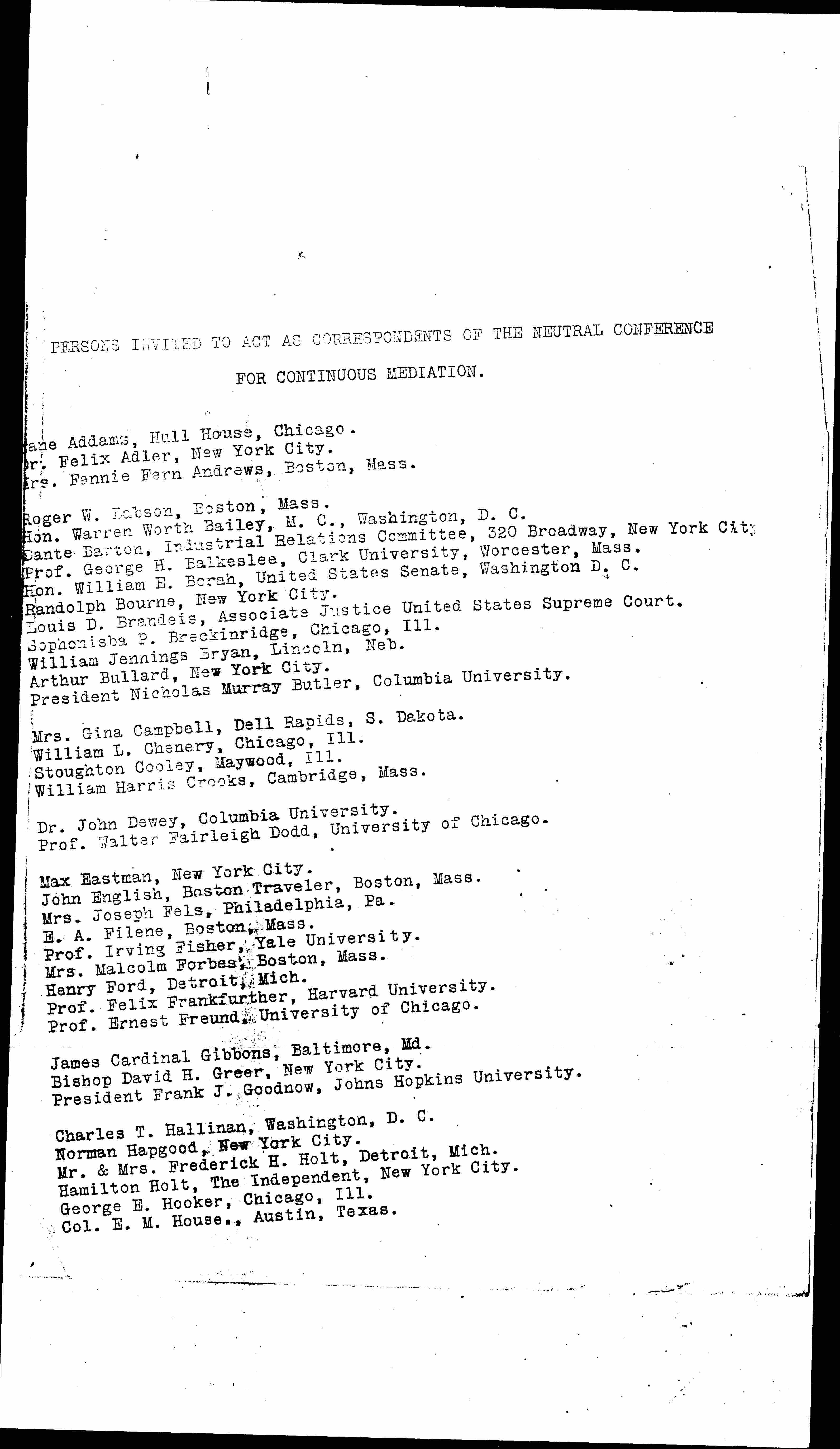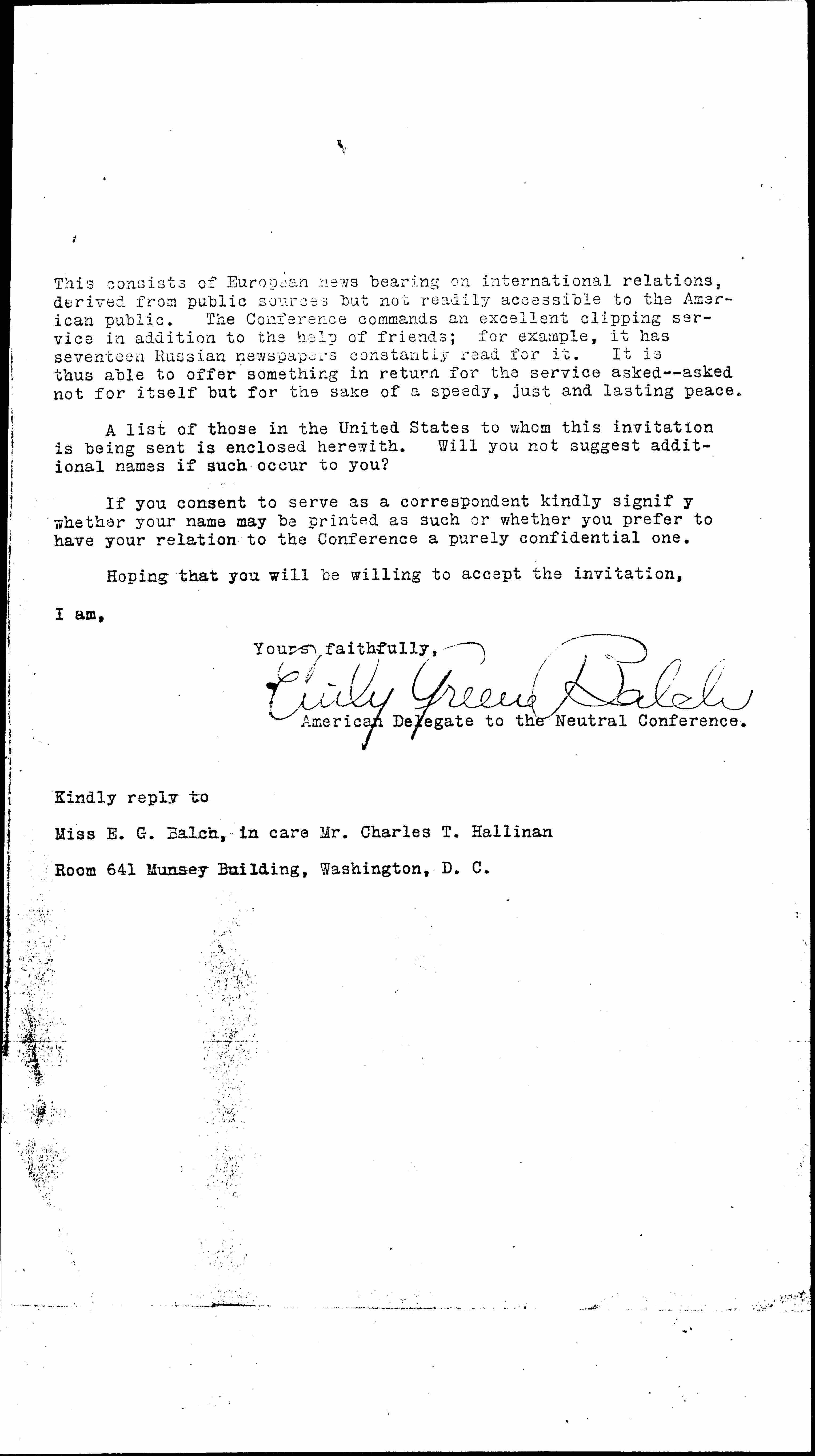 You are invited to act as one of the correspondents of the Neutral Conference in this sense. Acceptance does not imply any pledge but it is hoped that you will endeavor, so far as practicable and following the lines of your special interests and capacities, to utilize opportunities, as they occur, to lead public opinion, whether by a signed letter to the local press or other newspapers open to you, or by editorials, sermons, pamphlets, speeches or otherwise. Copies or notice of any such comments, criticisms, interpretations or proposals of yours should in any case be promptly mailed to the Neutral Conference. The comparison and often the publication of such comment from different countries is very instructive and helpful, and is one of the most important uses to which your efforts can be put.
