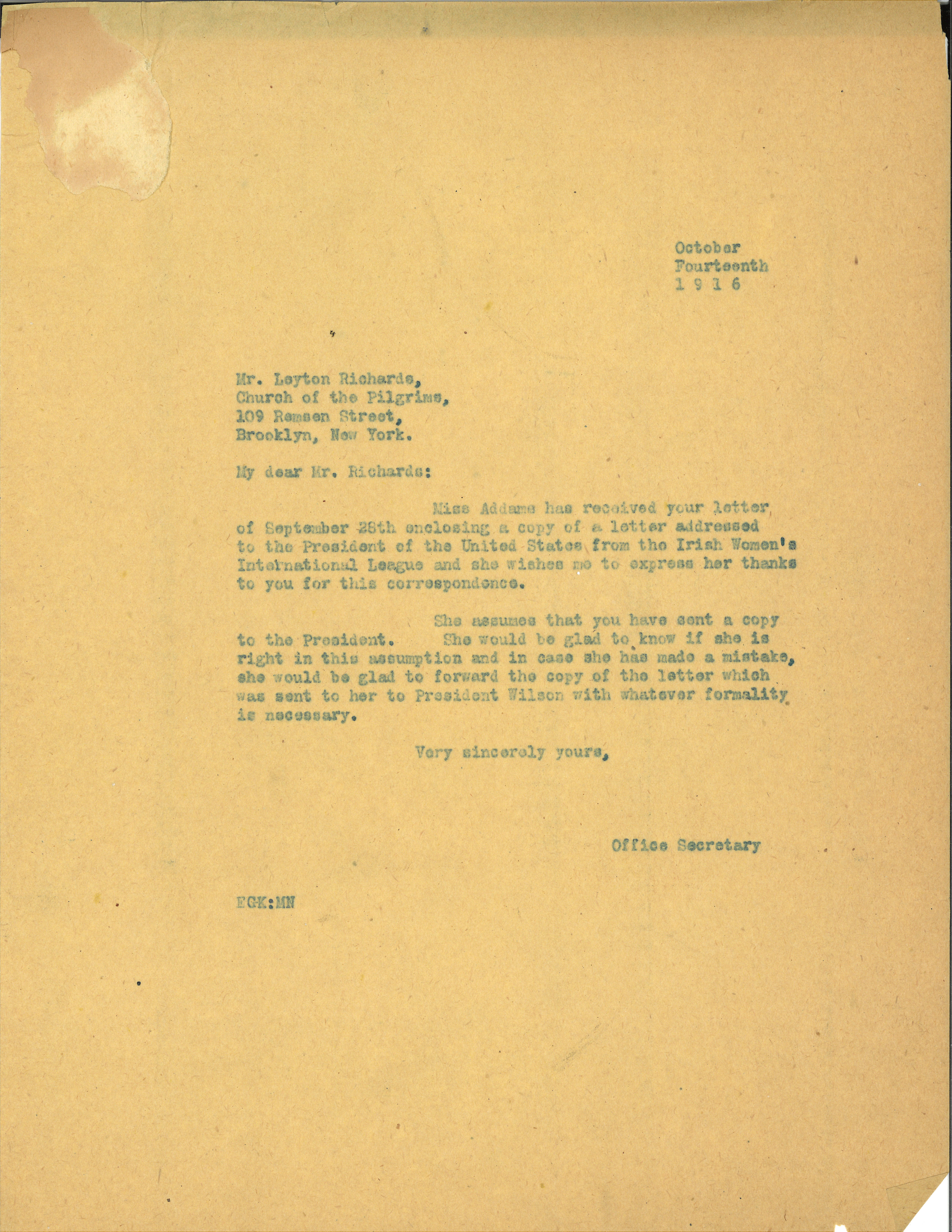 Miss Addams has received your letter of September 28th enclosing a copy of a letter addressed to the President of the United States from the Irish Women's International League and she wishes me to express her thanks to you for this correspondence.
