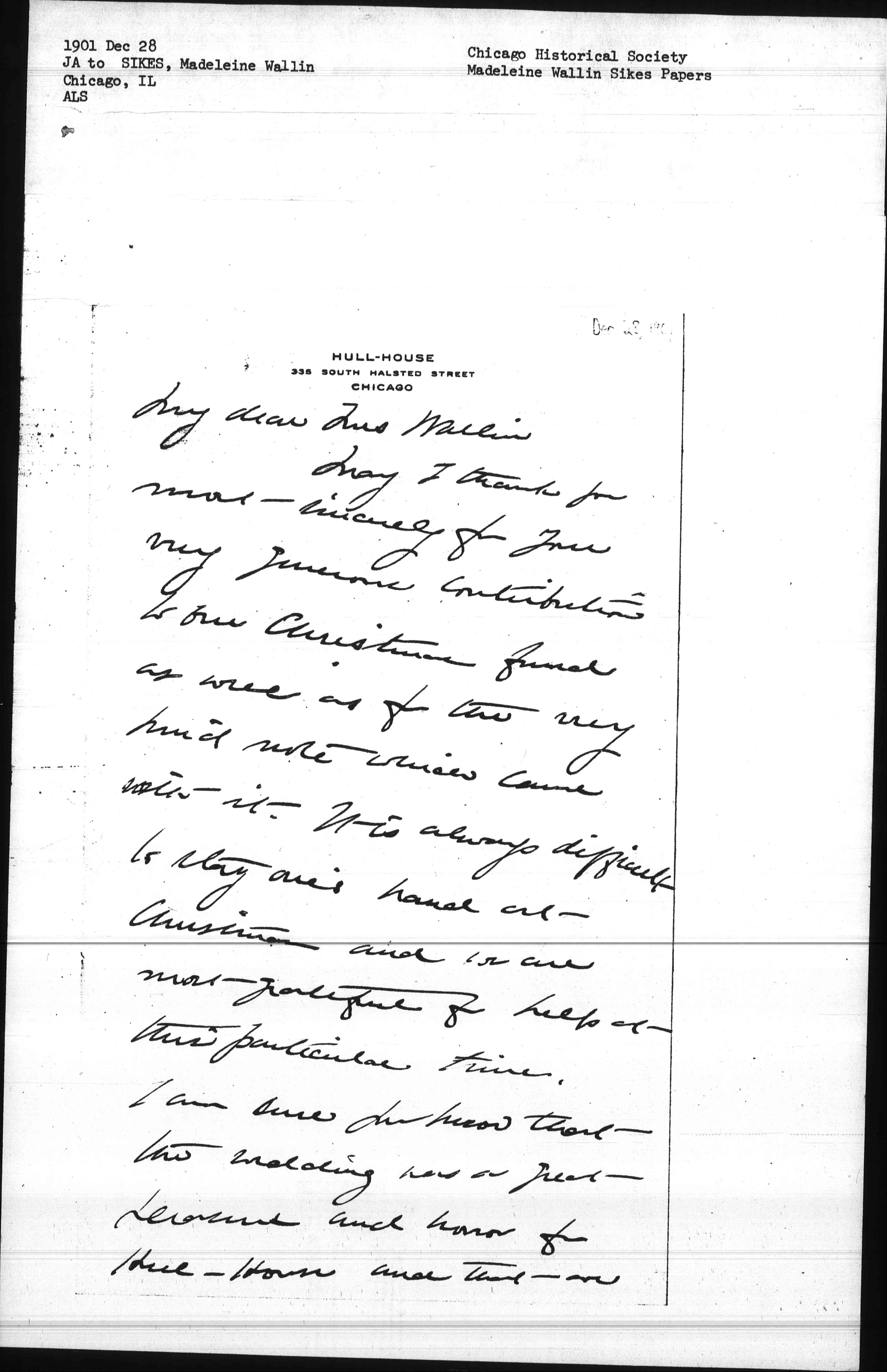 May I thank you most sincerely for your very generous contribution to our Christmas fund as well as for the very kind note which came with it. It is always difficult to stay one's hand at Christmas and we are most grateful for help at this particular time. I am sure you know that the wedding was a great pleasure and honor for Hull-House and that we [page 2] only regret that are lost too such good residents.