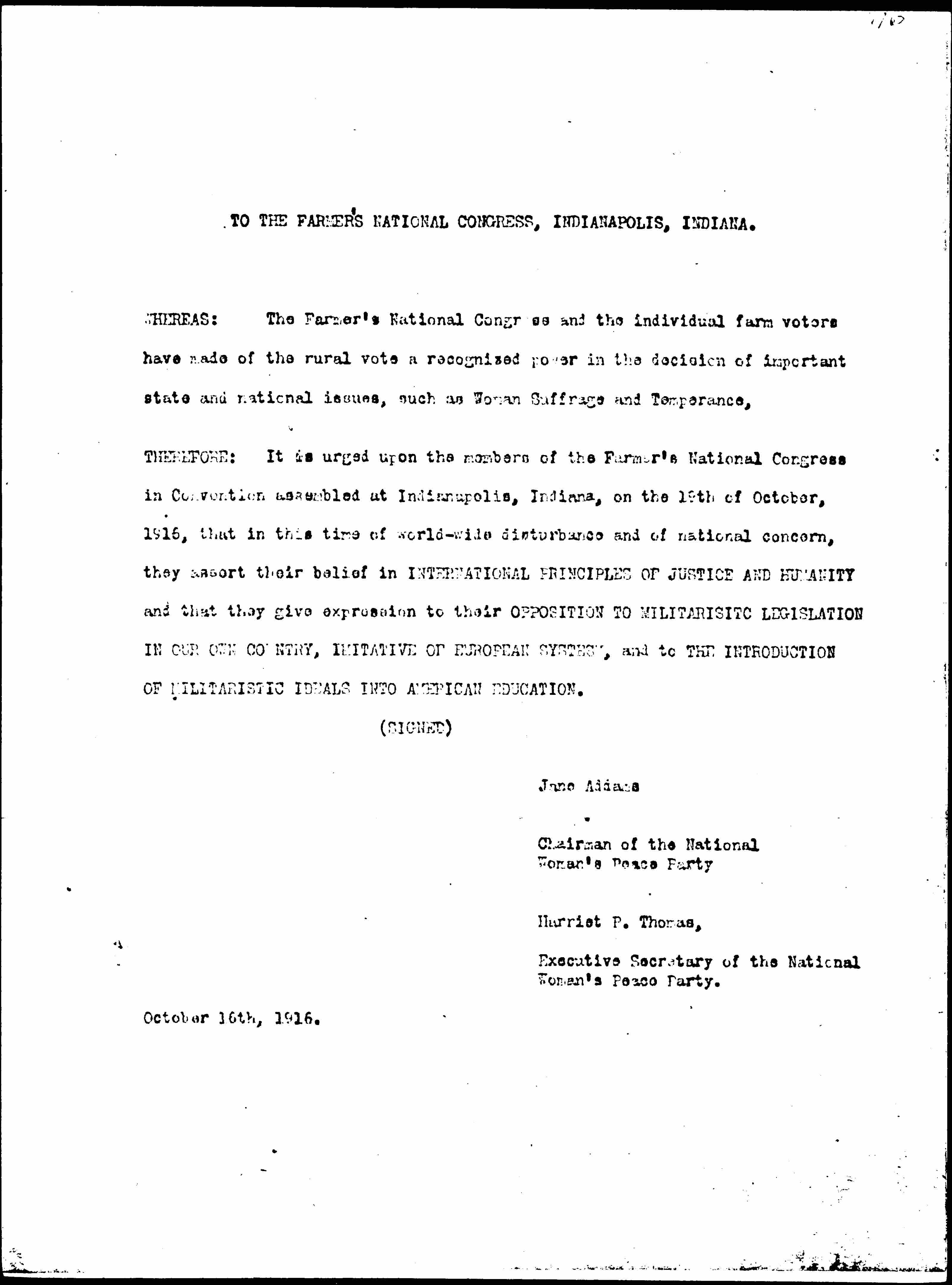 THEREFORE: It is urged upon the members of the Farmer's National Congress in Convention assembled at Indianapolis, Indiana, on the 19th of October, 1916, that in this time of world-wide disturbance and of national concern, they assert their belief in INTERNATIONAL PRINCIPLES OF JUSTICE AND HUMANITY and that they give expression to their OPPOSITION TO MILITARISTIC LEGISLATION IN OUR OWN COUNTRY, IMITATIVE OF EUROPEAN [SYSTEMS], and to THE INTRODUCTION OF MILITARISTIC IDEALS INTO AMERICAN EDUCATION.