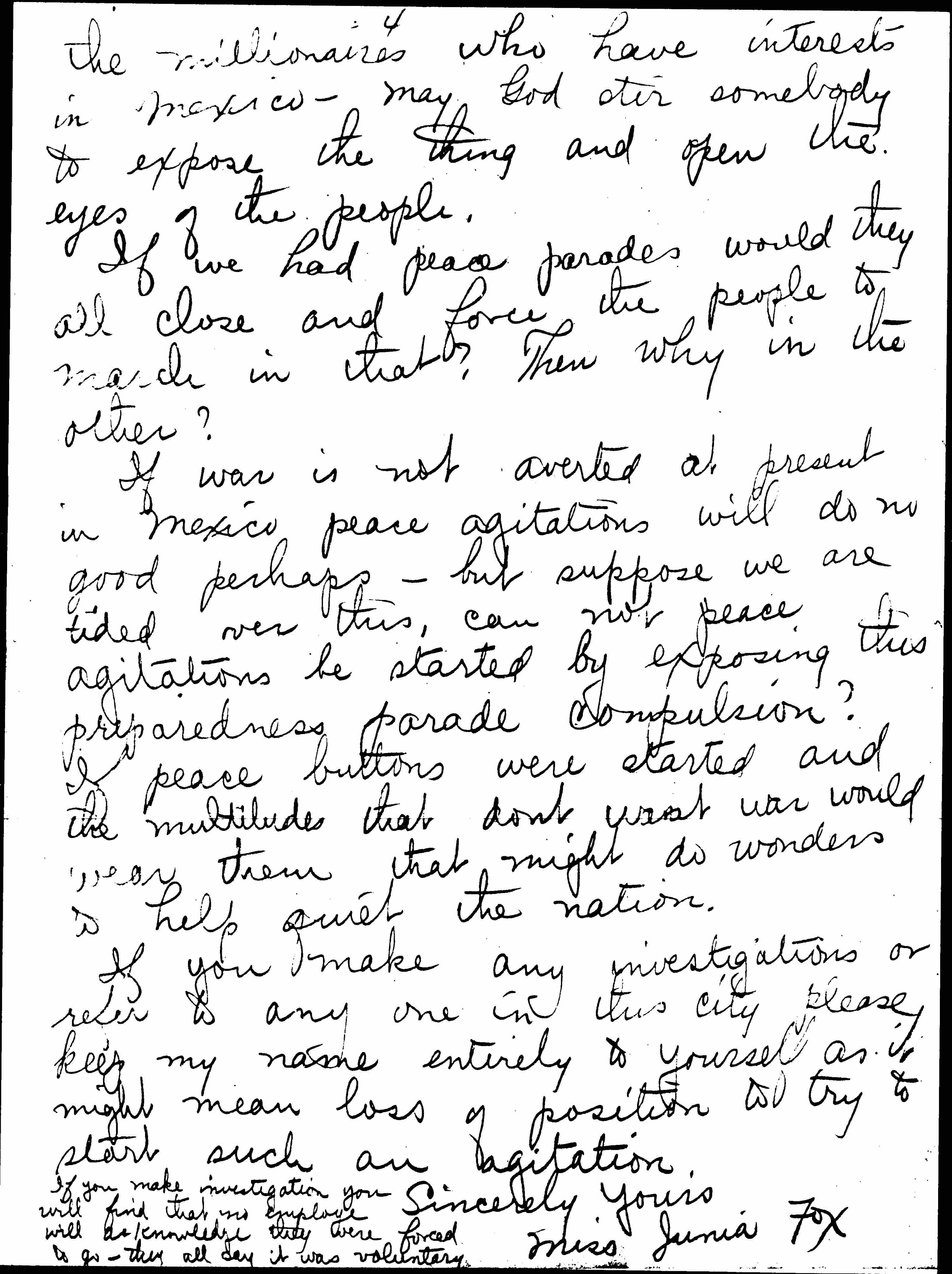 Why is all this -- I just wish an investigation could be made in the eastern cities that had the parades and see if the same pressure was brought to bear upon the people to form the march. If so, then there must be a power behind this and that power must be the [ammunition] men or perhaps [page 4] the millionaires who have interests in Mexico -- may God stir somebody to expose the thing and open the eyes of the people.