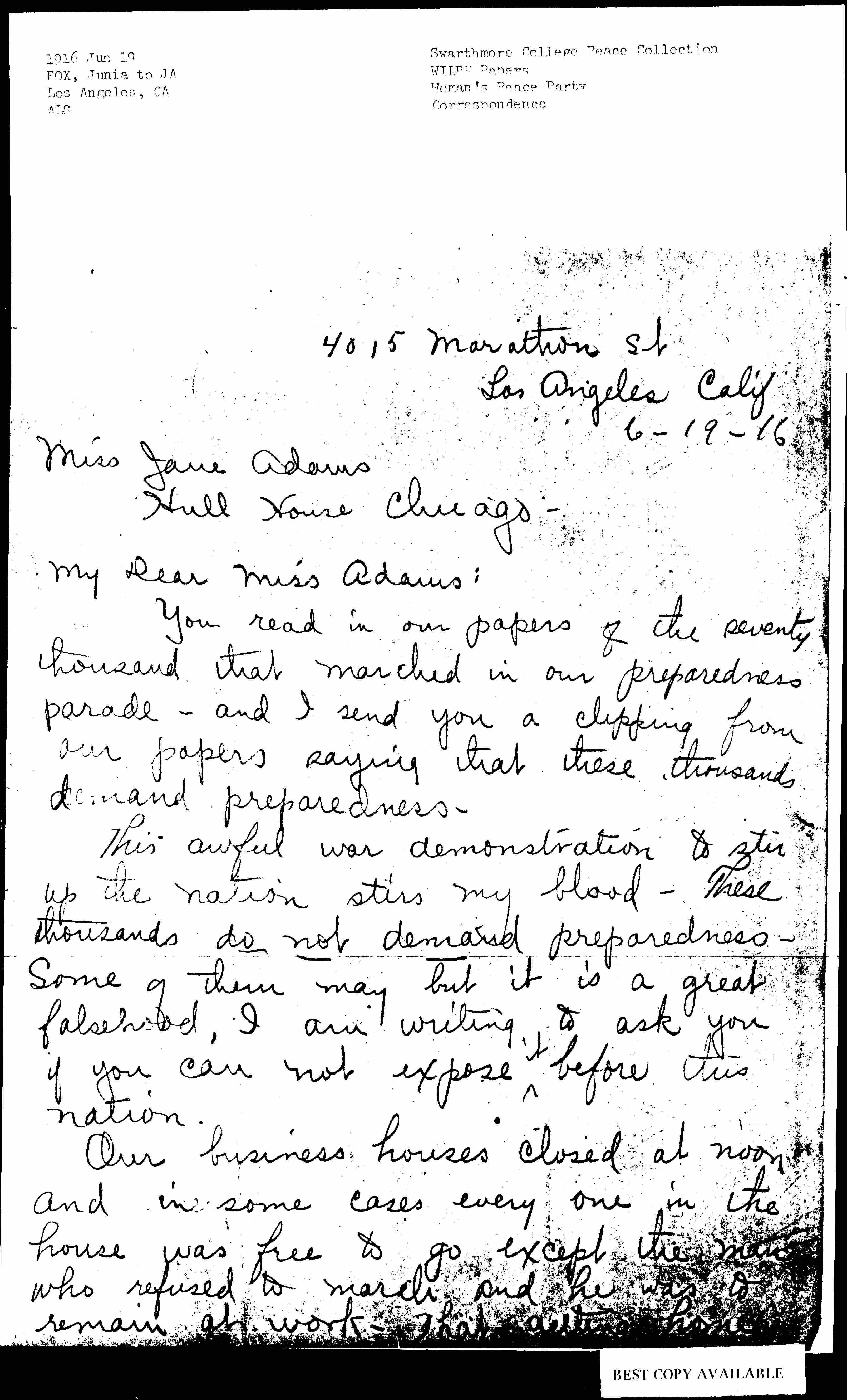 This awful war demonstration to stir up the nation stirs my blood. These thousands do not demand preparedness. Some of them may but it is a great falsehood, I am writing to ask you if you can not expose <it> before this nation.